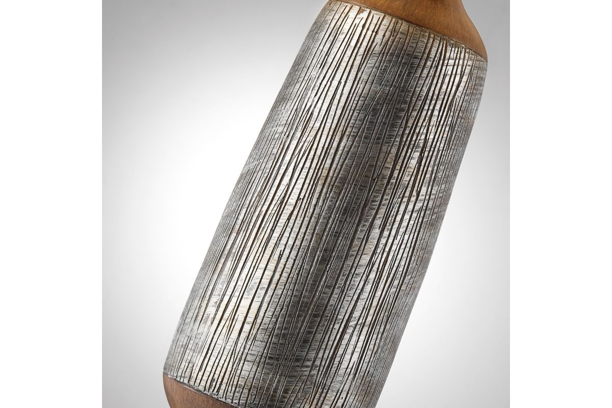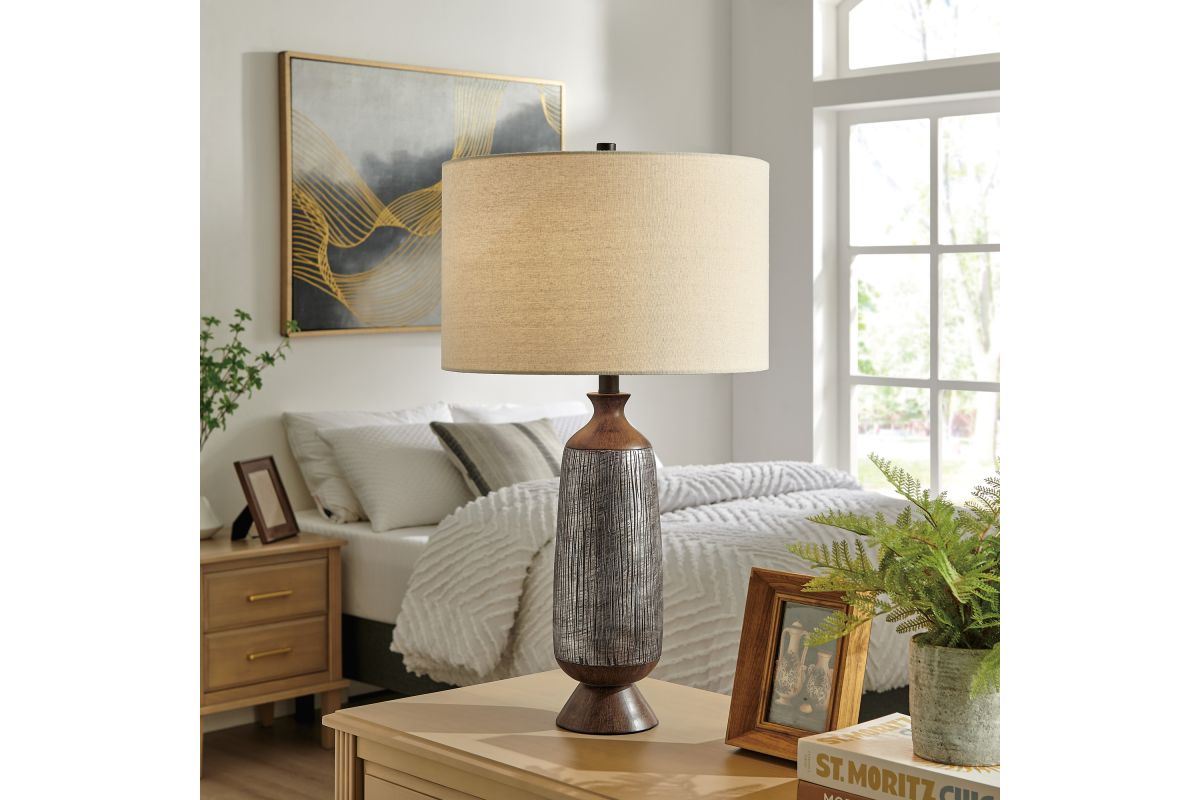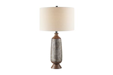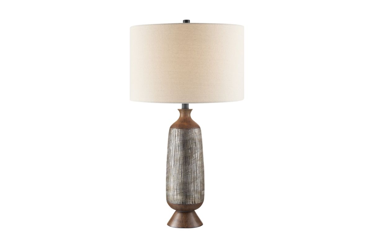 Introducing our inviting and cozy 2-tone faux wood table lamp, an ideal choice for farmhouse, western, or transitional room decor. Crafted with precision from cast resin, it showcases a sleek 2-tone faux wood finish with detailed textured wood grain design. Crowned with a soft cream drum fabric shade, this lamp casts a soothing and gentle glow, creating a warm ambiance in any space