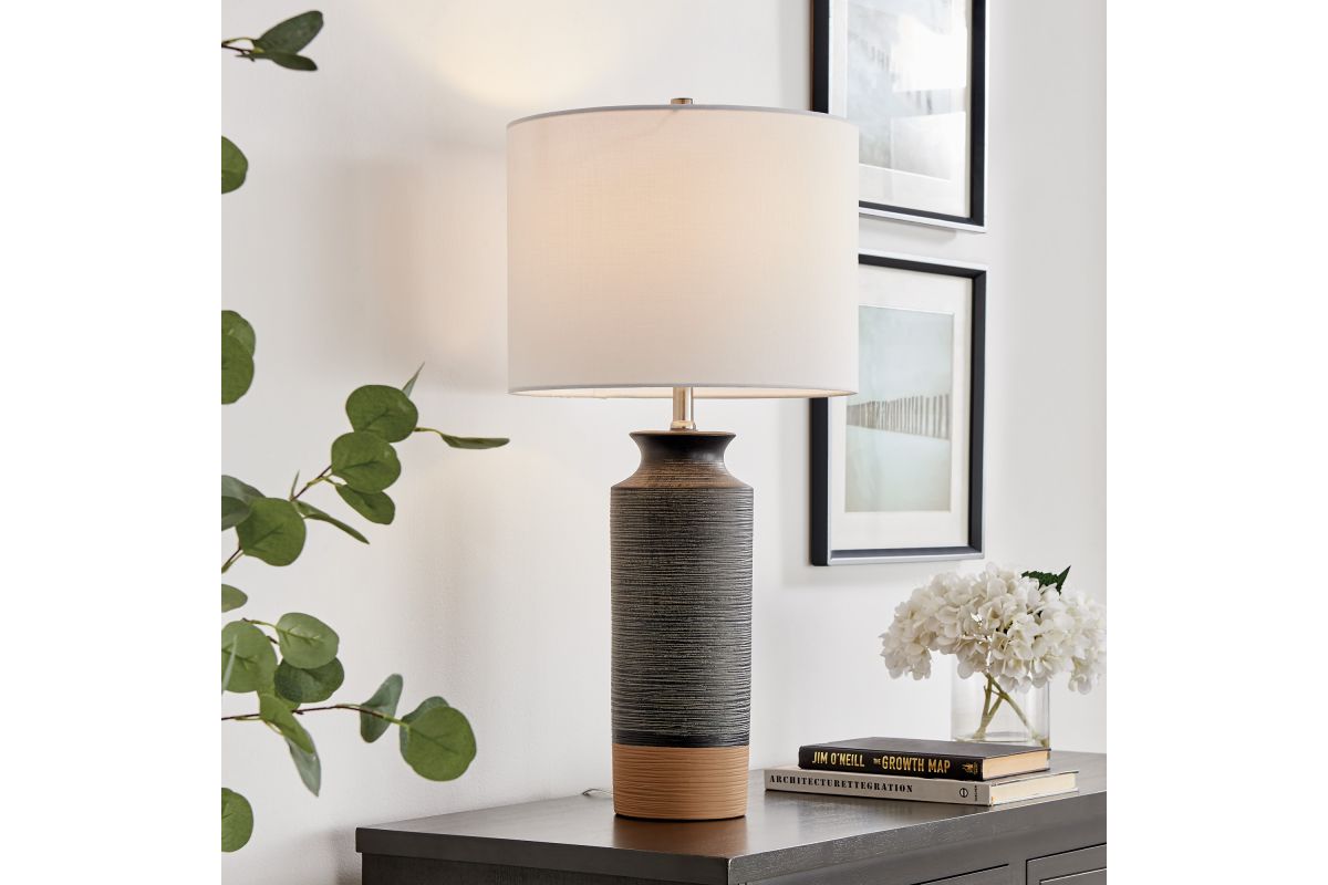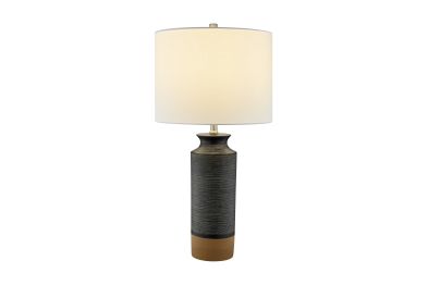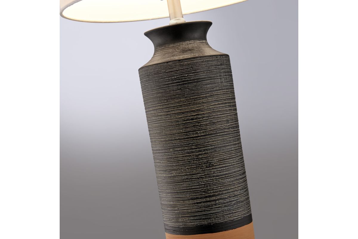Introducing our inviting and cozy 2-tone ceramic table lamp, a perfect addition to modern transitional room decor. This lamp is expertly crafted from high-quality ceramic construction, featuring a sleek 2-tone finish adorned with intricate textured detailing. Topped with an elegant off-white drum fabric shade, it emits a soothing and gentle glow that effortlessly creates a warm ambiance in any space
