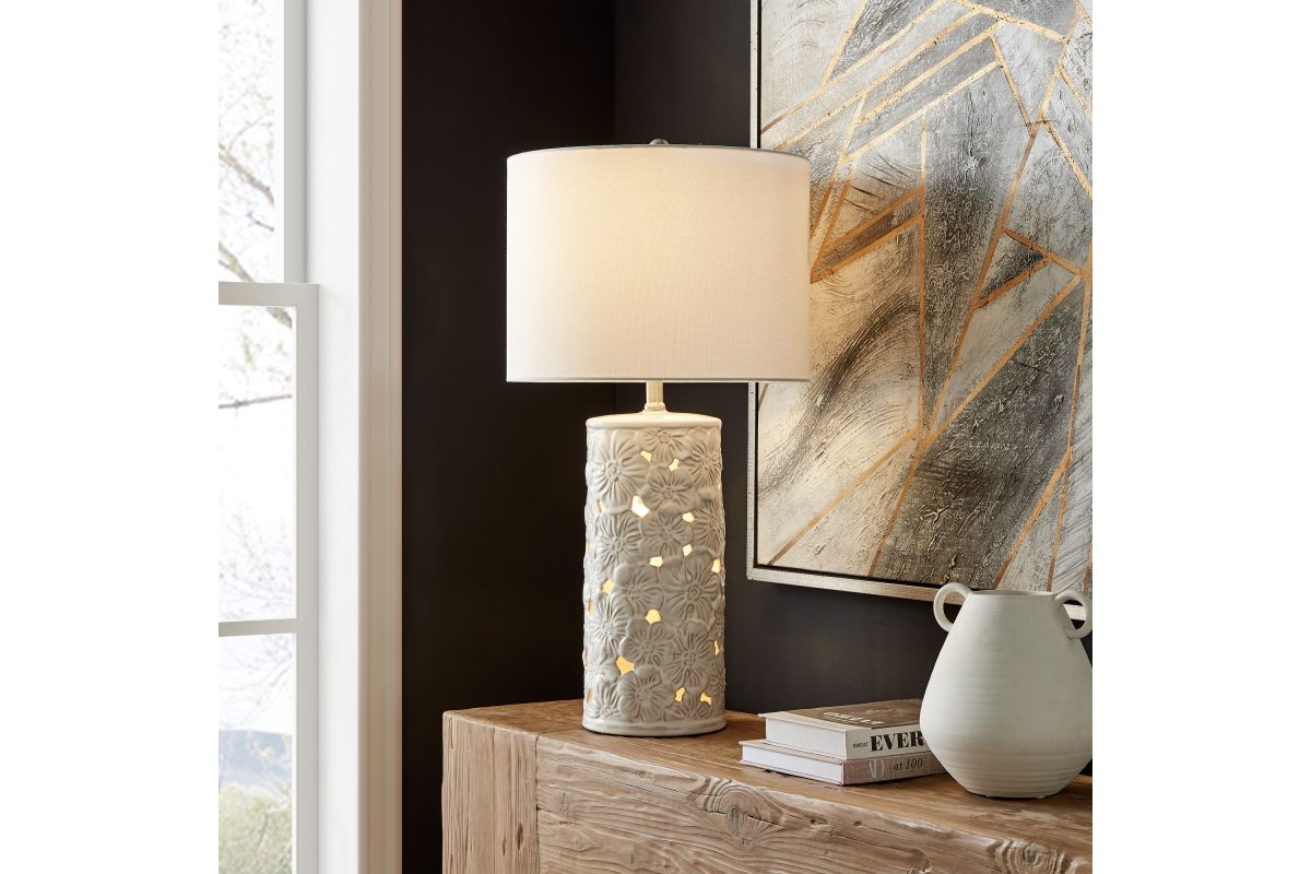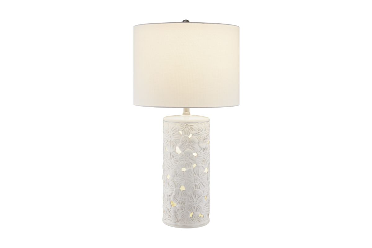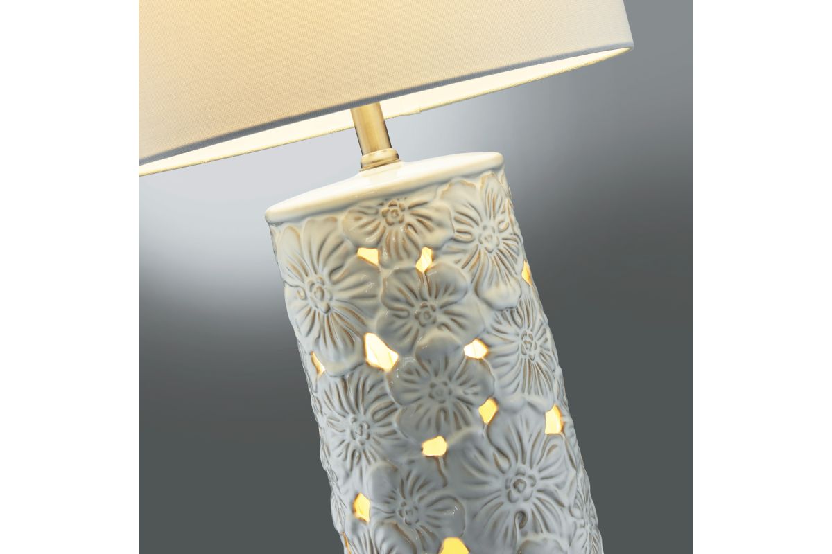 Breathe new life into your decor with this 29.5" artisan-style ceramic table lamp, featuring an enchanting ivory white floral design adorned with intricate cutouts that allow the night light to gracefully shine through. Equipped with a versatile 3-level switch, this lamp offers you the freedom to choose between illuminating the top light, the lamp body night light, or both simultaneously. Topping off this exquisite piece is a crisp, clean white fabric shade, adding a touch of timeless elegance to its artistic appeal.