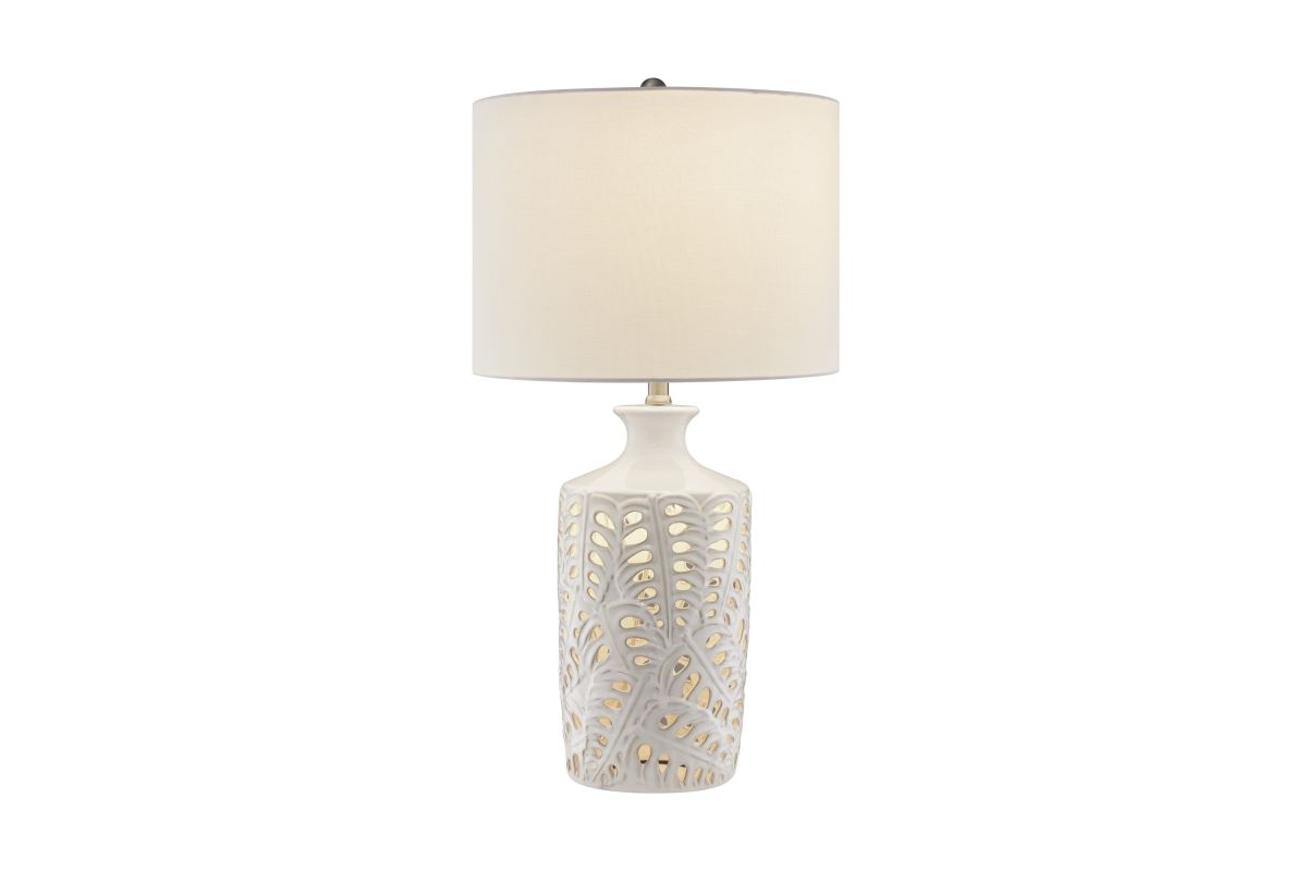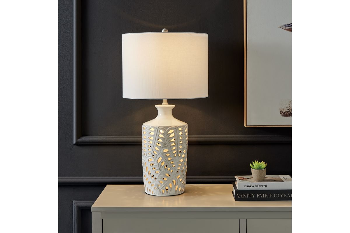 Renew and refresh your decor with this captivating 29" artisan-style ceramic table lamp. It showcases an enchanting ivory white leaf-motif design, adorned with intricate cutouts that allow the night light to delicately illuminate your space. This lamp is designed with a versatile 3-level switch, providing you with the flexibility to select between illuminating the top light, the lamp body night light, or both simultaneously. To complete this exquisite piece, it is topped with a crisp, clean white fabric shade, introducing a touch of timeless elegance to its already artistic appeal.