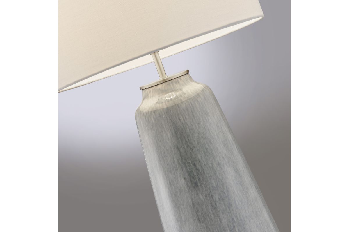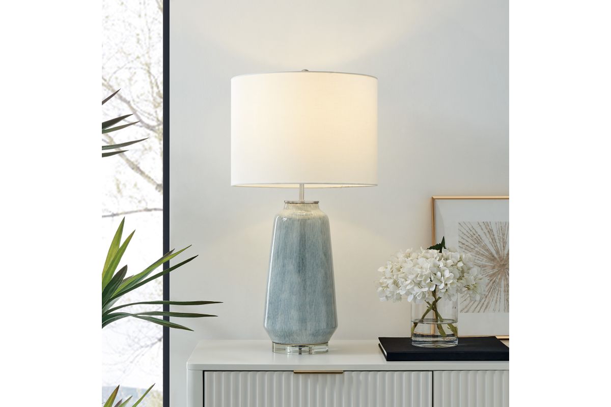 Introducing our charming 30" ceramic table lamp, featuring a soft blue finish and a sophisticated crystal base. This elegant light blue table lamp blends versatility with artistic flair, making it a perfect addition to any setting, whether it's a formal space or a more relaxed bedroom, living area, or hallway. Topping off this exquisite piece is a crisp white fabric drum shade, adding a touch of timeless elegance to its overall design