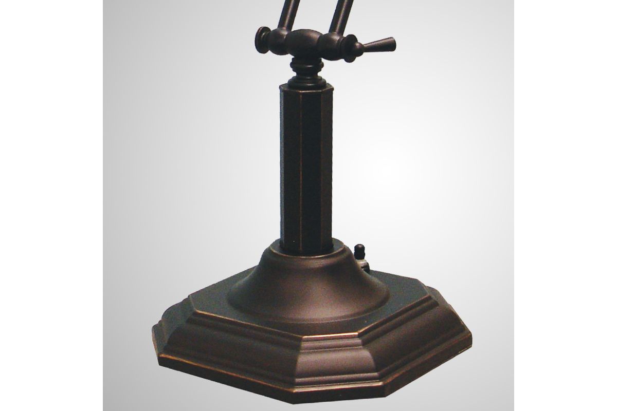 Bring timeless elegance to your workspace or home with this classic banker’s lamp. Crafted in a rich dark bronze finish, its sleek rectangular shade and gracefully curved arms offer a refined silhouette that blends traditional charm with enduring style. The sturdy, sculpted base provides stability while adding a touch of sophistication to desks, side tables, or reading nooks.
