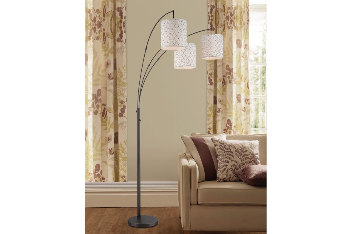 The Lite Source LS-82533 Vasanti 3-Light Arch Floor Lamp presents a striking dark bronze arched silhouette reaching 85 inches tall, 50.5 inches long, and 13 inches wide, making it ideal for casting gentle overhead light from behind seating or cozy corners. It elegantly holds three off-white fabric shades on curved arms and accommodates three 60W A-type bulbs (not included), providing abundant ambient lighting. With its sleek metal frame meeting UL safety standards and versatile, contemporary design, the Vasanti lamp blends function and style effortlessly into modern and transitional interiors.