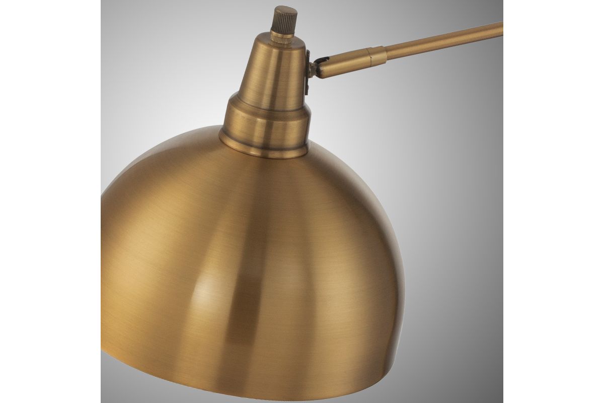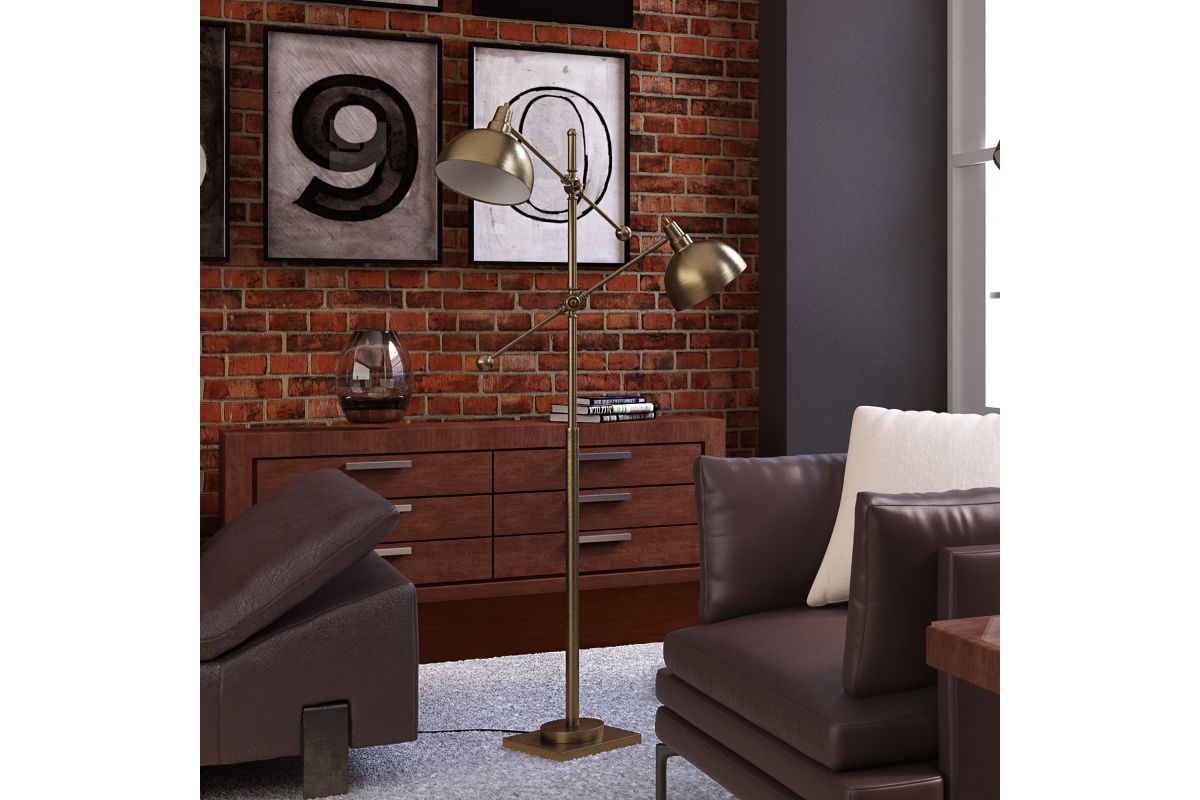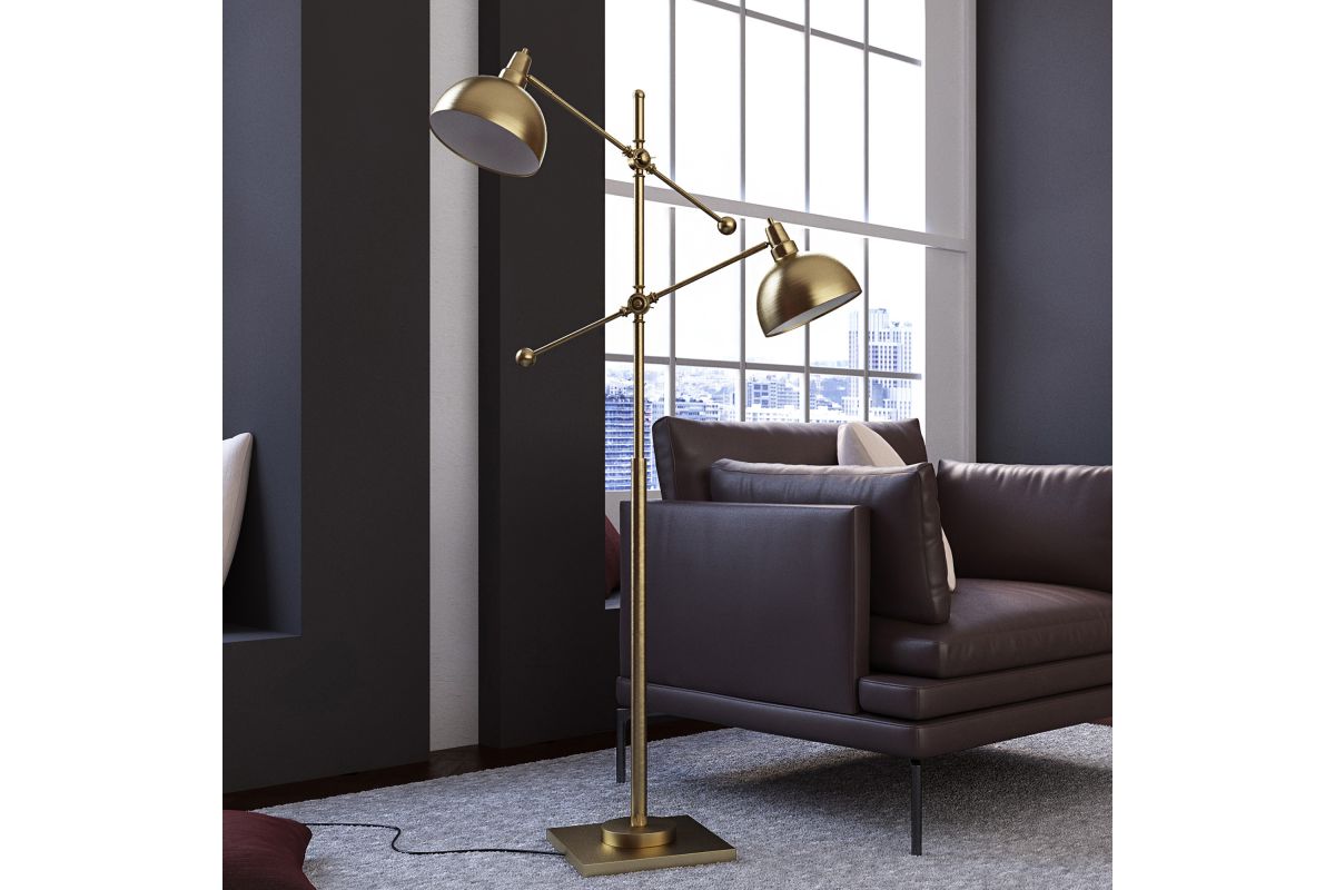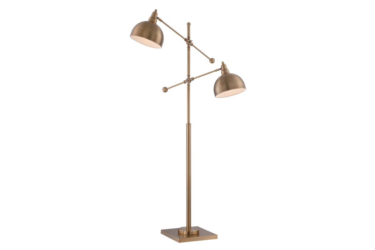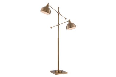 The Lite Source LS-82605 Cupola Floor Lamp features a sleek brushed brass finish over a metal frame, standing approximately 59 inches tall, 39 inches wide, and 11 inches deep. It includes two 100W E27 A-type bulbs (included) and operates via a rotary on/off switch. The lamp's design combines modern elegance with functional lighting, making it suitable for various interior styles.