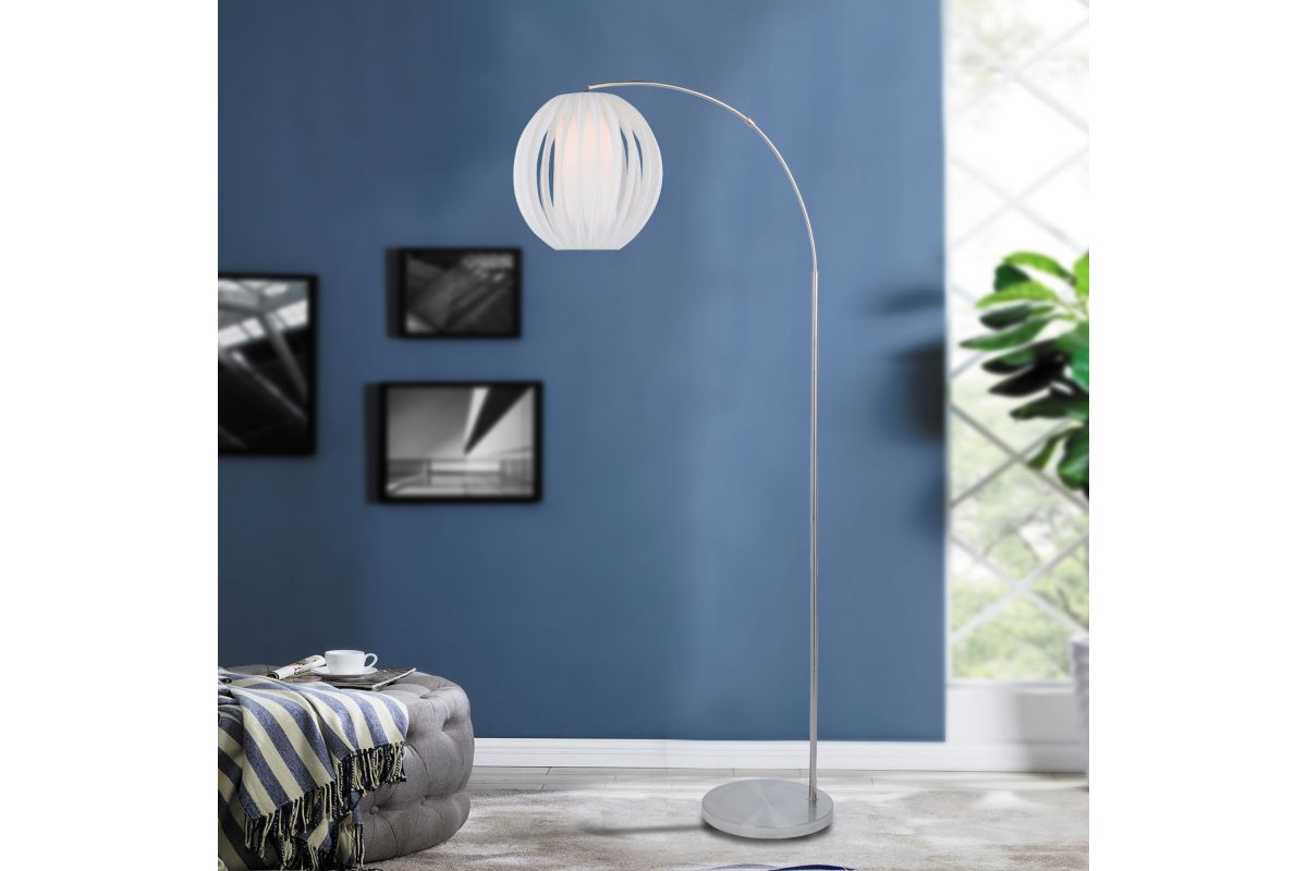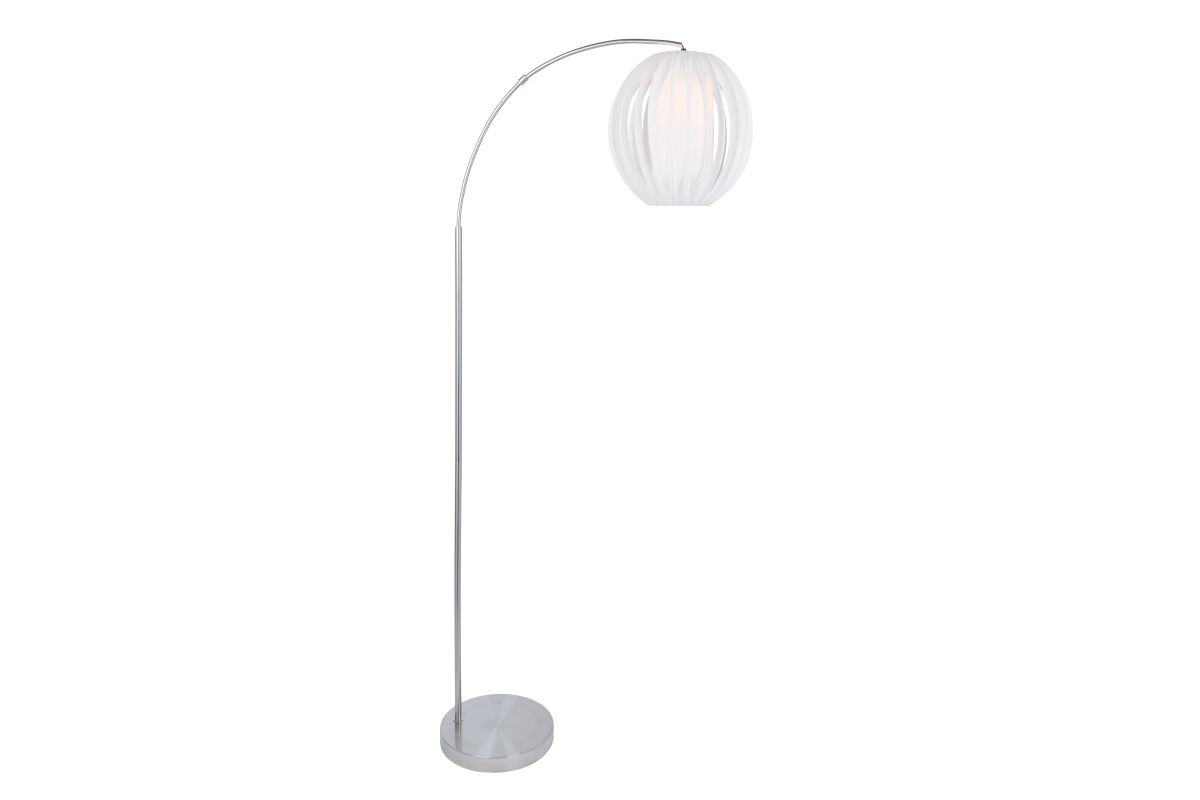 The Lite Source LS-82957 Deion Arc Floor Lamp features a sleek brushed nickel finish over a metal frame, standing approximately 79.5 inches tall, 28.5 inches deep, and 15 inches wide. It includes a 42W E27 CFL bulb (included) and operates via a rotary on/off switch. The lamp's design combines modern elegance with functional lighting, making it suitable for various interior styles.