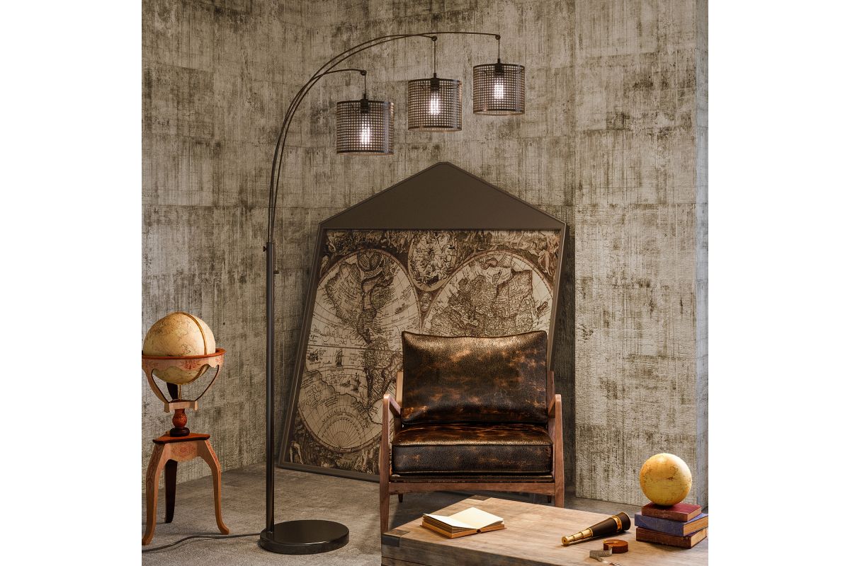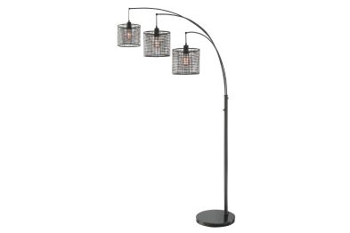 Make a bold statement with this industrial-style arc floor lamp featuring three mesh drum shades suspended from a sleek arched frame. The matte black finish and exposed bulb design add a modern, edgy touch, while the triple-light setup provides ample illumination for living rooms, reading nooks, or office spaces. A sturdy round base ensures stability, and the adjustable arc allows for tailored lighting coverage.