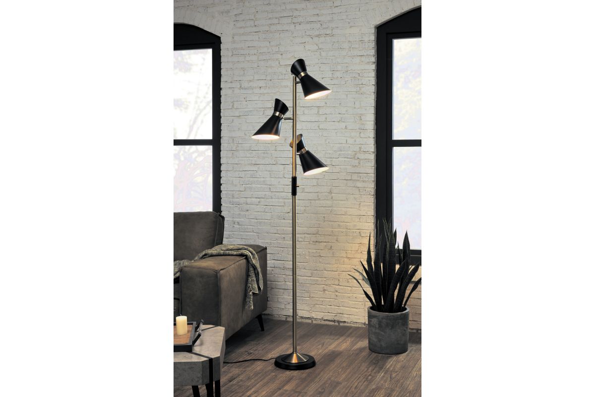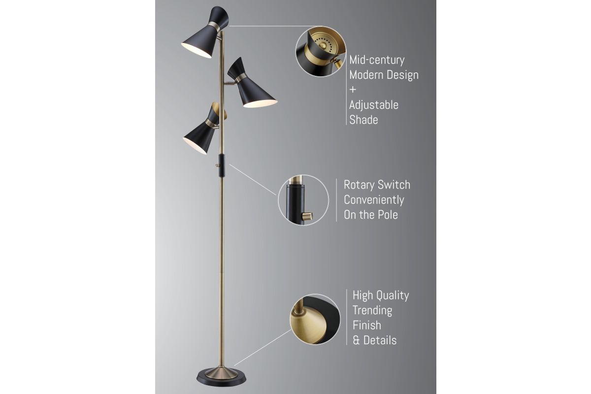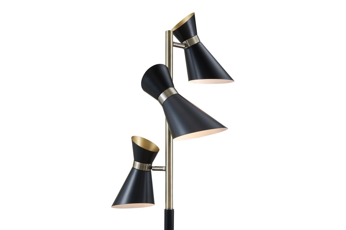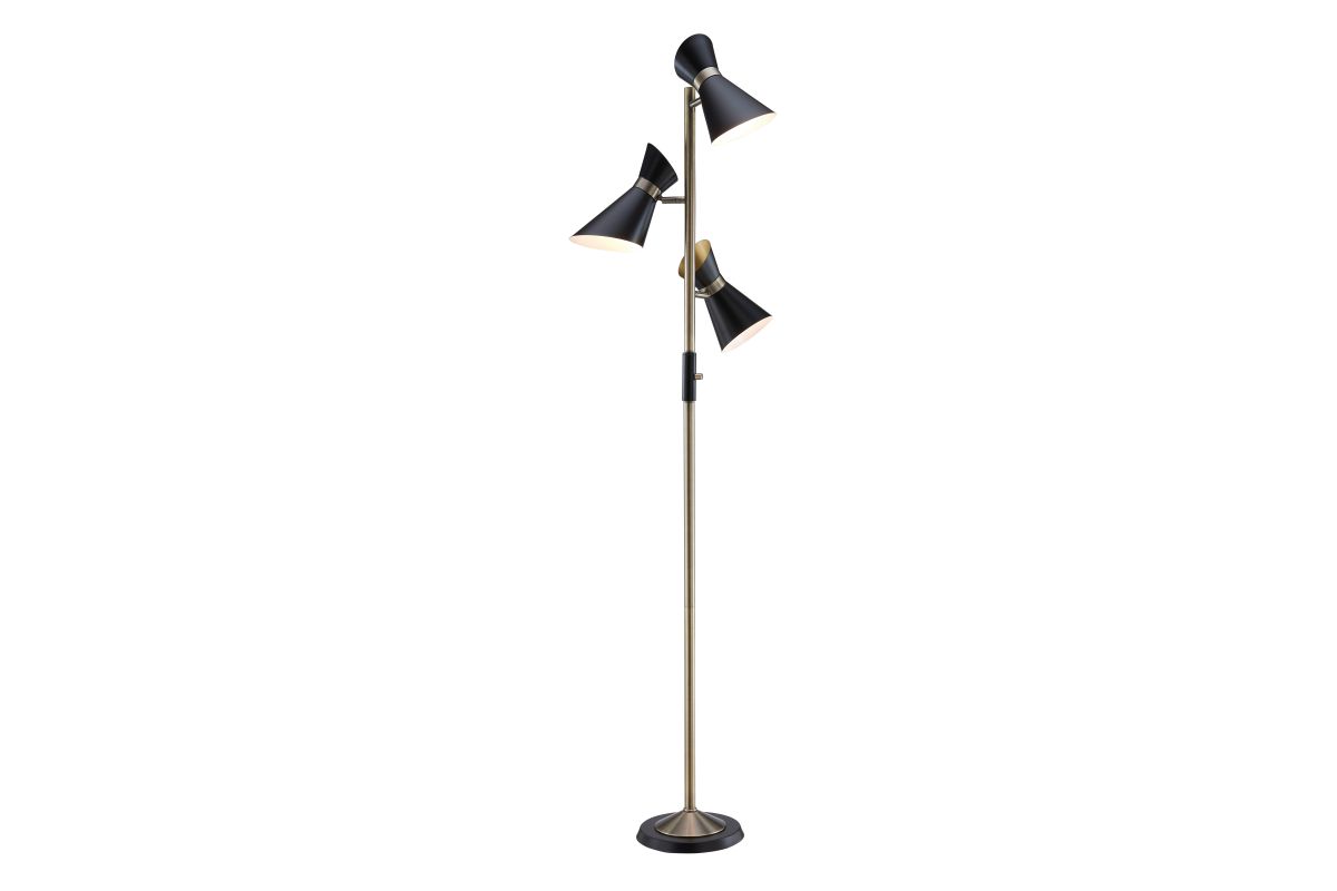 Studio-inspired personality offers a charming touch to the design of this contemporary three-light tree floor lamp. Bring a hint of Mid-Century Modern to a modern or transitional space with this floor lamp from the Jared collection by Lite Source. A bold black finish over metal construction fashions shapely shades and a base, as antique brass accents offer a complementary nod. Adjustable shades come in handy for targeted lighting.
