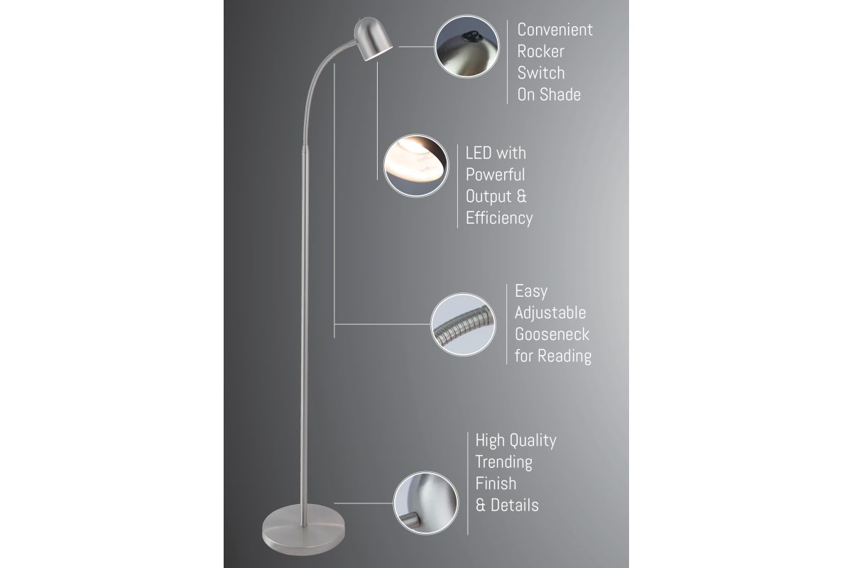 With a soft metallic sheen and contemporary profile, this brushed nickel gooseneck floor lamp offers both style and versatility. Its adjustable arm allows you to direct light exactly where you need it—whether beside a reading chair or illuminating your workspace. The silver finish blends seamlessly with modern and transitional décor, adding a polished touch without overwhelming the space.