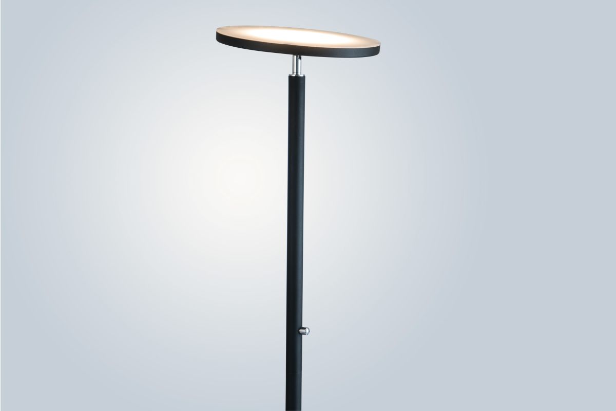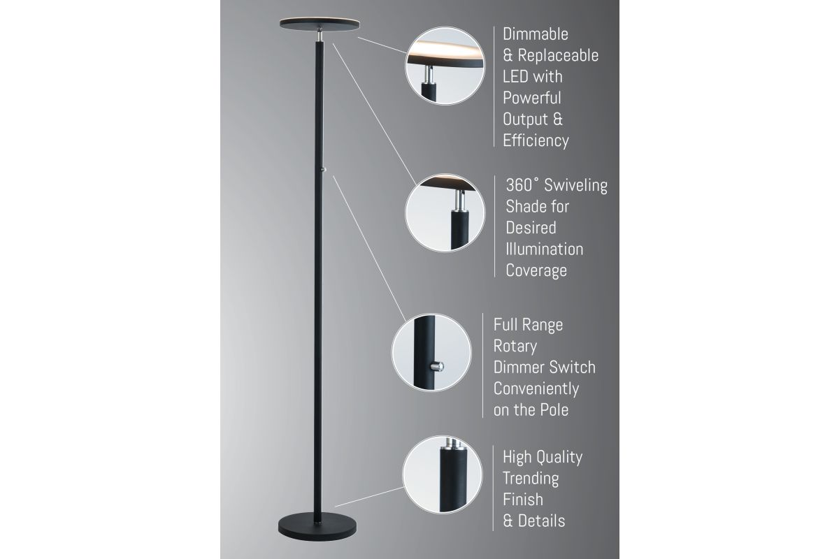 The Lite Source Monet Floor Lamp features a sleek matte black finish on a sturdy metal frame, standing approximately 71.75 inches tall with a slim 11-inch width and depth. Its integrated 30W LED panel provides bright, energy-efficient illumination, perfect for living rooms, bedrooms, or office spaces. With a contemporary torch-style design, this lamp combines modern elegance with functional lighting, offering both style and practicality in one refined piece.