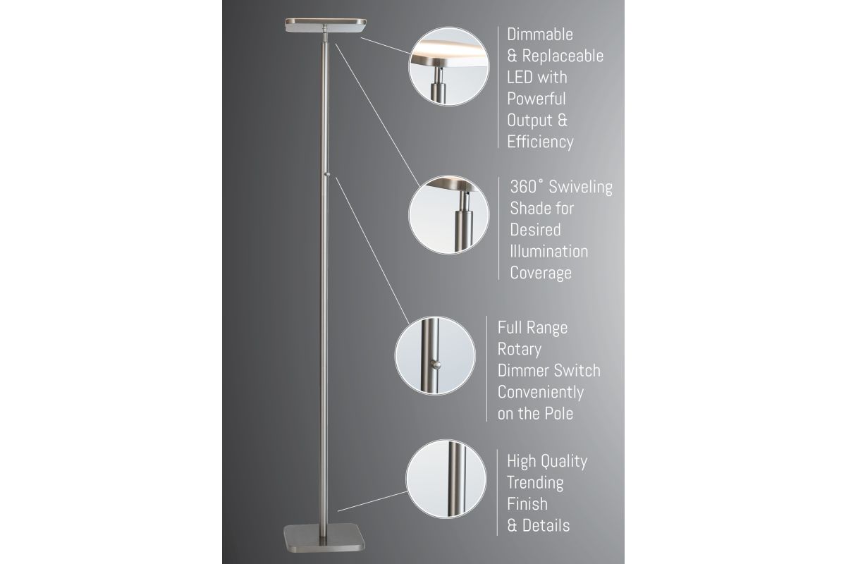 The Lite Source LS-83355BN Hector Floor Lamp stands at 71.75 inches tall with a 10.5-inch width and depth, featuring a brushed nickel finish that complements modern interiors. It includes a 30W LED panel, providing bright, energy-efficient illumination suitable for various spaces. With its sleek design and functional lighting, this lamp combines style and practicality in one refined piece.