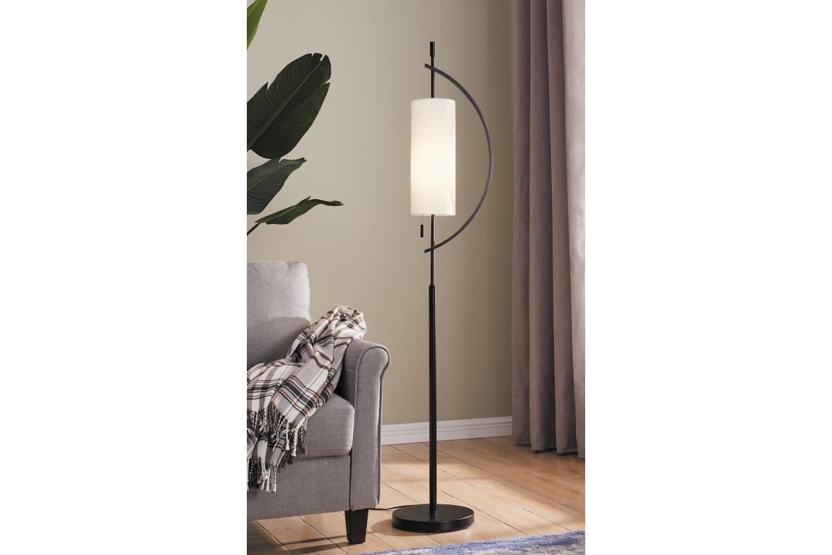 Elevate your interior with this eye-catching arc floor lamp, a perfect blend of modern art and ambient lighting. Its gracefully curved frame cradles a tall, fabric cylinder shade, casting a warm, diffused glow ideal for cozy corners, reading nooks, or modern living spaces.
