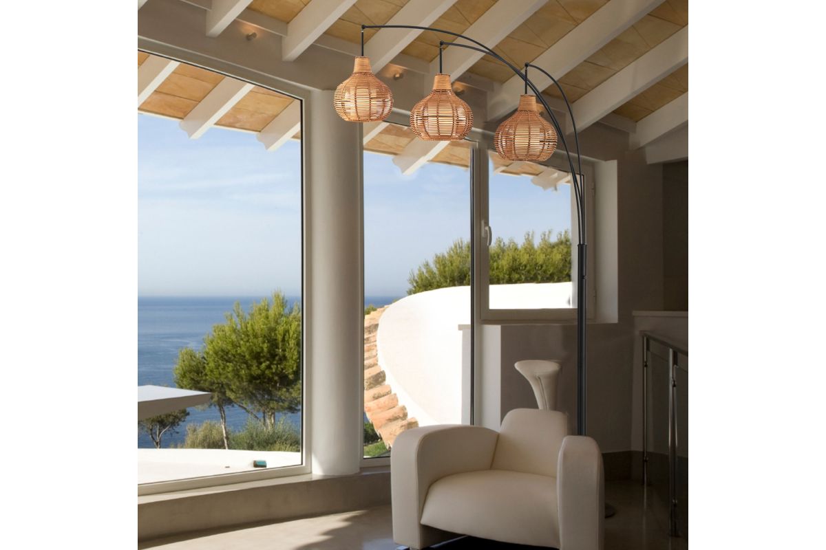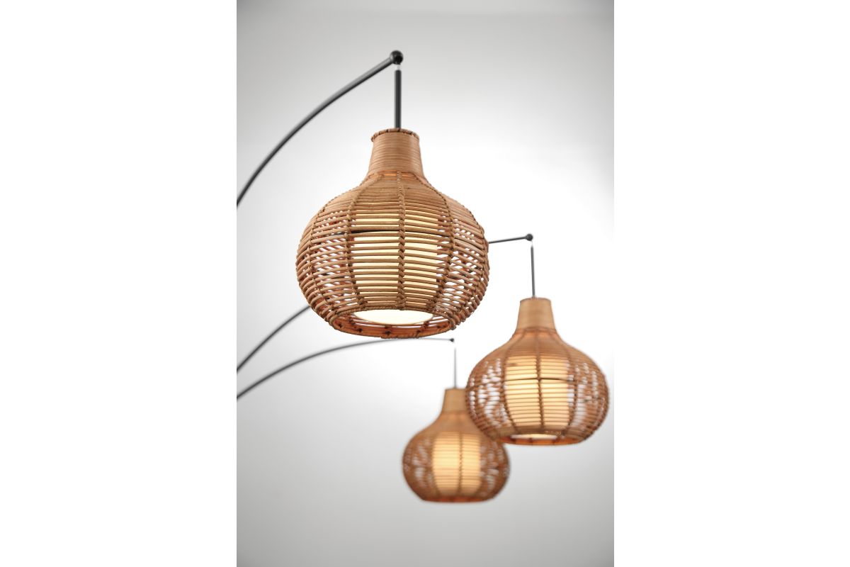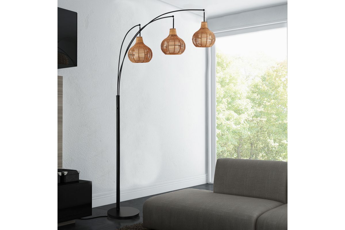 Inspired by organic design, cast a warm glow across your living space with the smartly curved design of this rich black arc floor lamp. Three natural rattan outer shades overlay covers linen interior shades which brings a rich and decorative charm to your decor. This arch lamp is a perfect fit in modern or casual coastal living spaces.