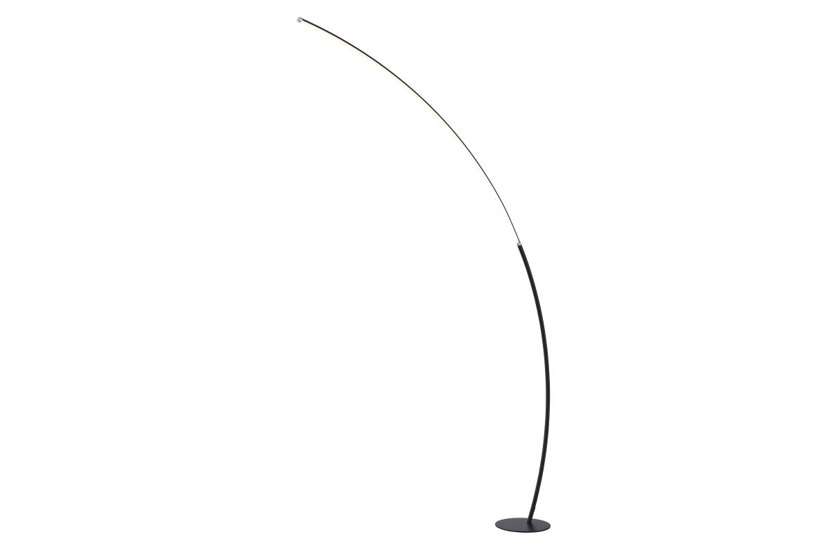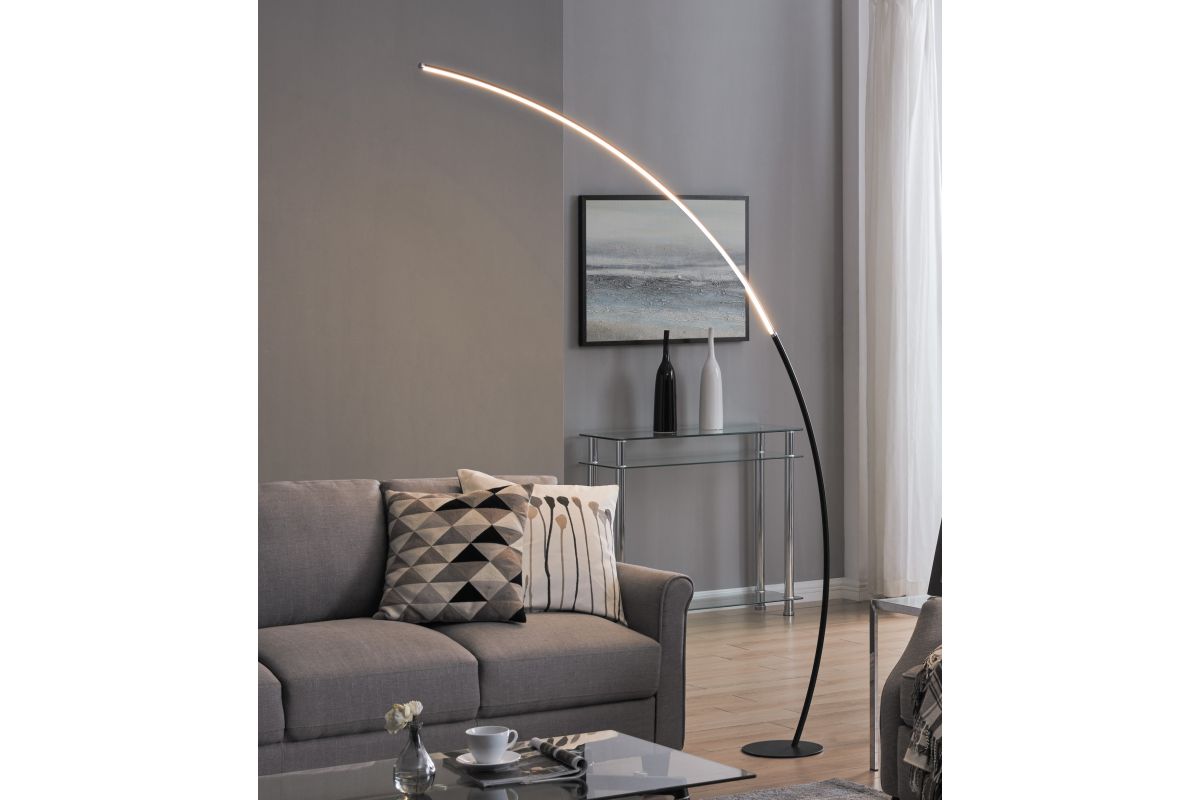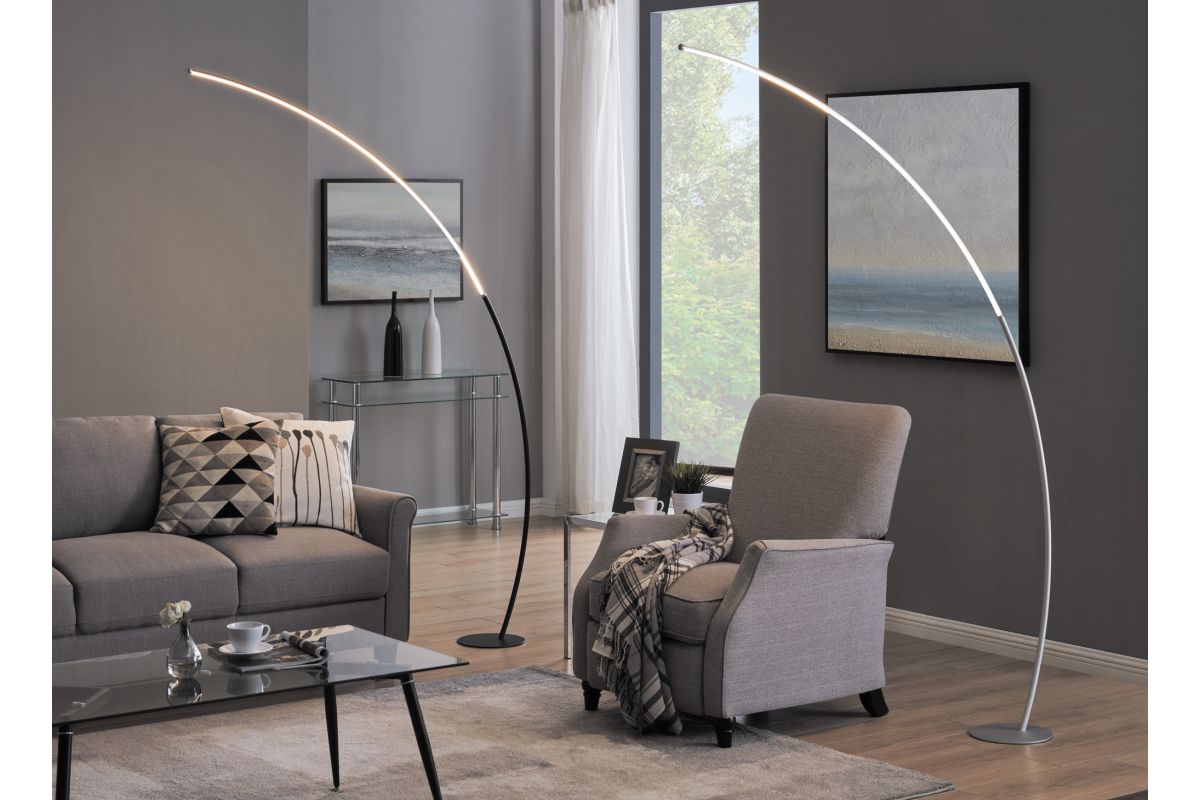 Despite its minimalist design, the bright LED arch floor lamp will be the focal point of any space. It features a metallic finish over metal construction, topped by an aluminum and acrylic diffuser, but the prominent feature is its sleek, curved, wispy-thin silhouette. A foot switch provides 4-way dimming lighting control. It's an eye-catching design that looks great in a modern office space or a home entertainment room.