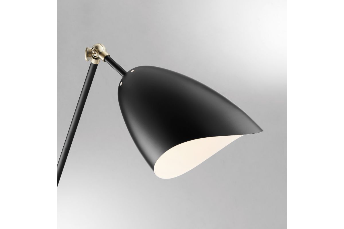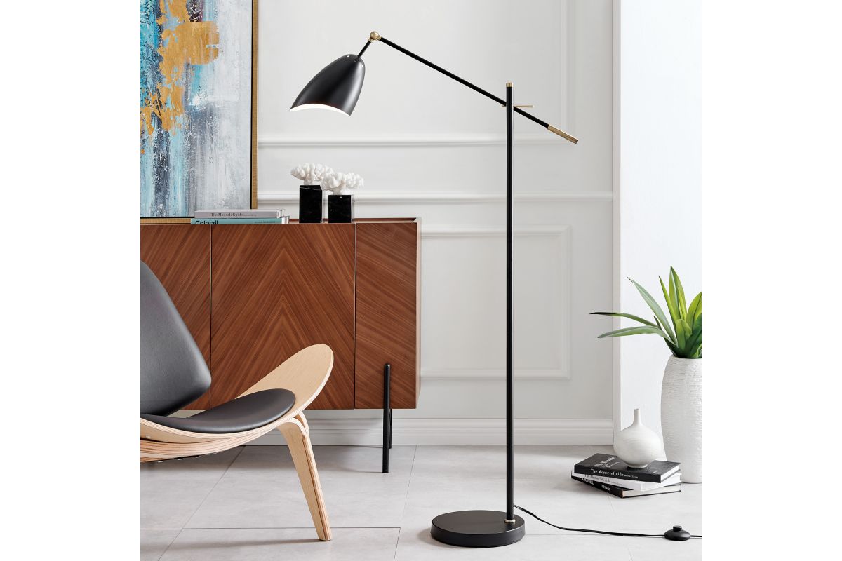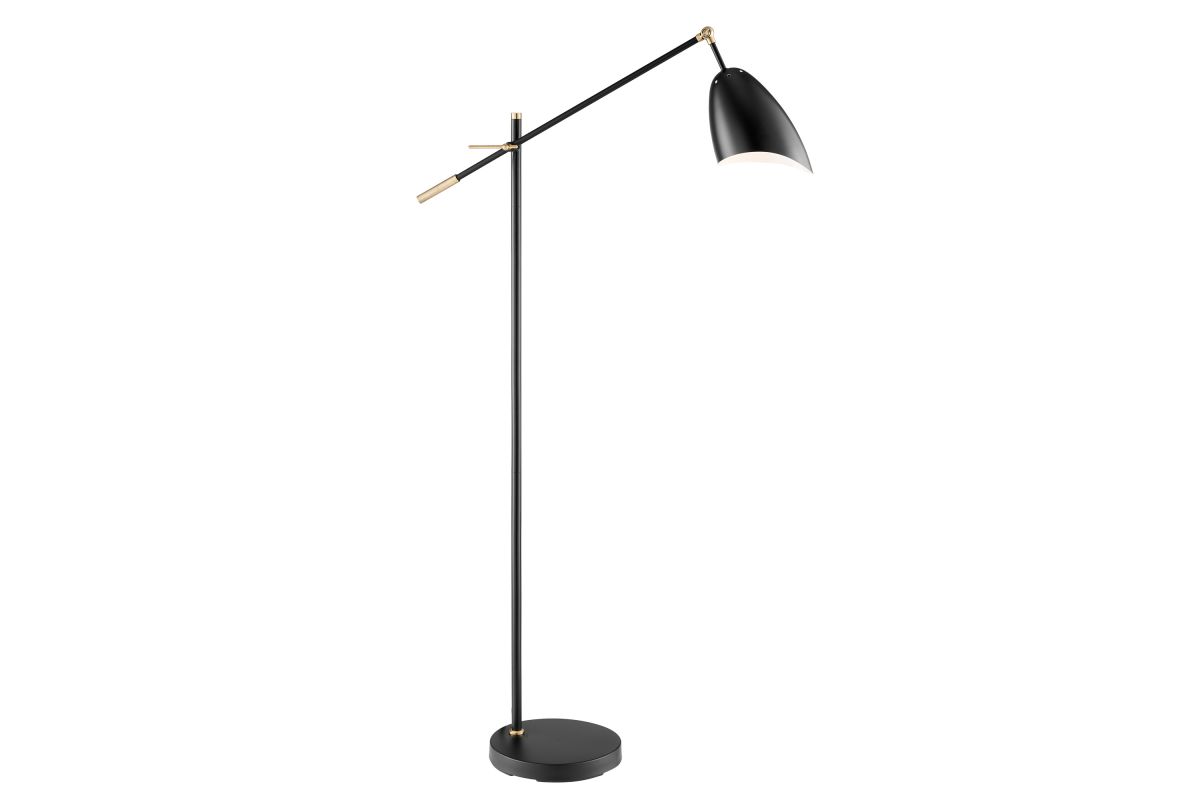 Enjoy the clean, crisp two-tone design of this balance arm floor lamp for your home or office. This lamp is crafted with all metal construction and a mid-century inspired designshade with a wavy rim on the adjustable arm. The extendable arm can be set at a variety of angles to accommodate your space, setup, and lighting needs.