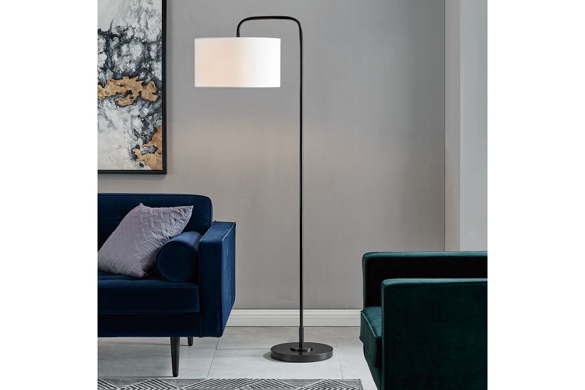 Use the simplified yet refined style of this 64” contemporary down-bridge arch floor lamp as a feature in your modern décor. Rich matte black finish capped with a crisp white linen shade, this floor lamp is a stylish addition over a sofa or desk. Powered by a 72" length of an electric cord and a convenient foot switch, this chic and versatile metal floor lamp will work in a variety of spaces.
