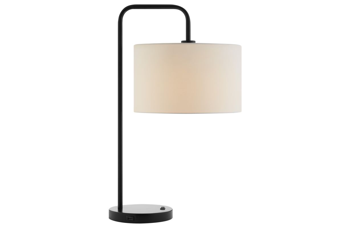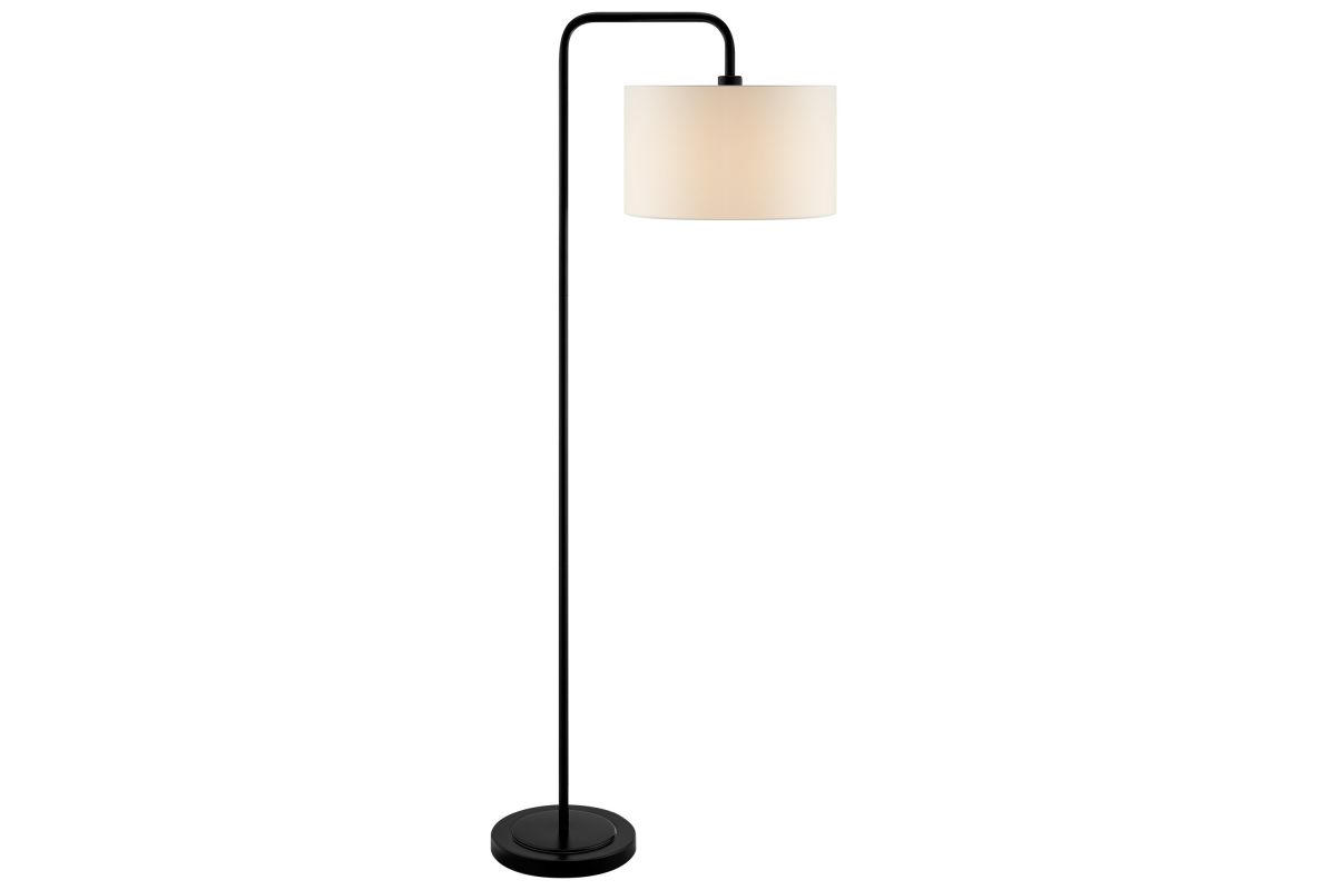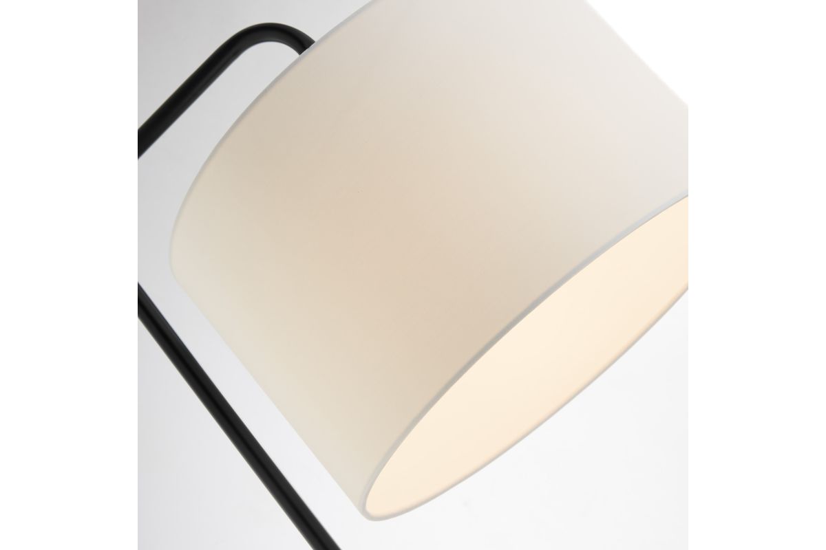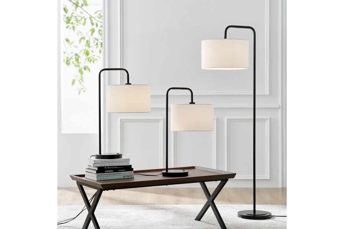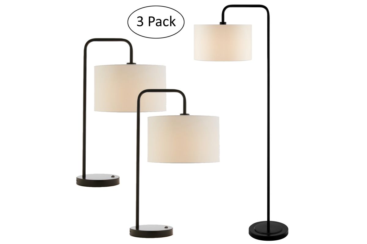 Simplified yet refined style, this 3 piece table and floor lamp set features rich matte black finish capped with a crisp white linen shade in down-bridge design. The lamp set is a stylish addition to any décor.