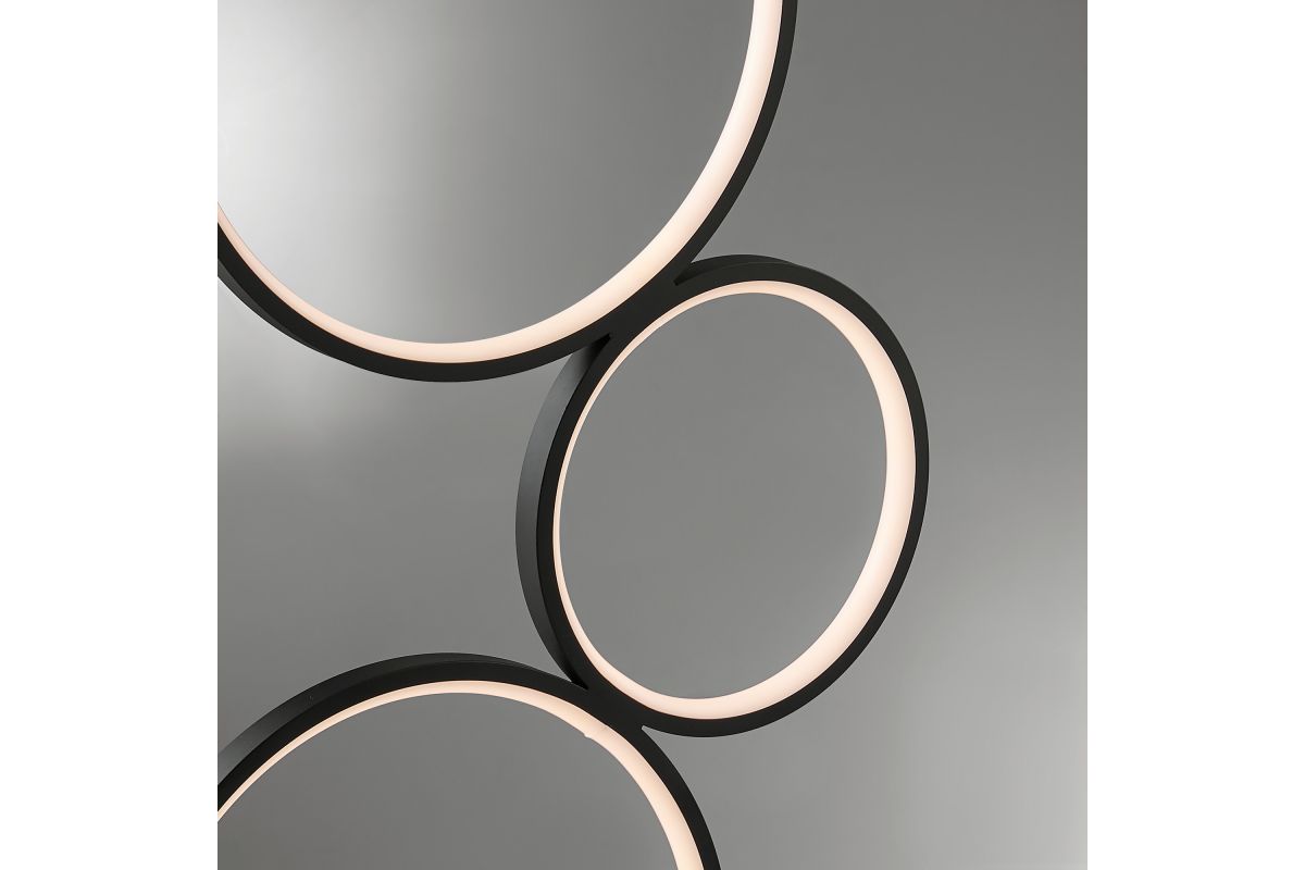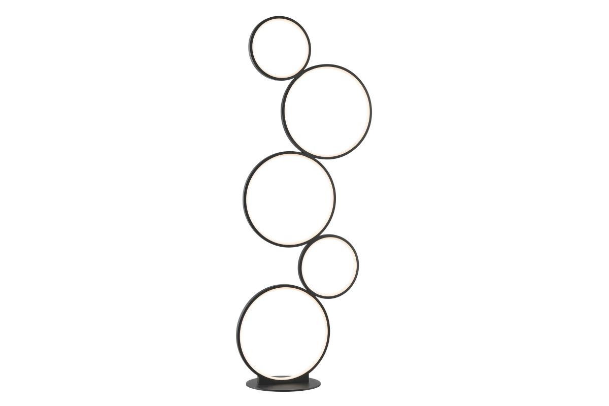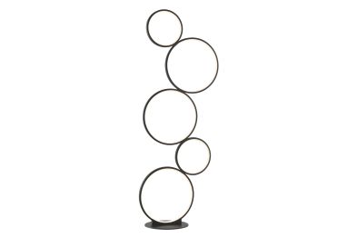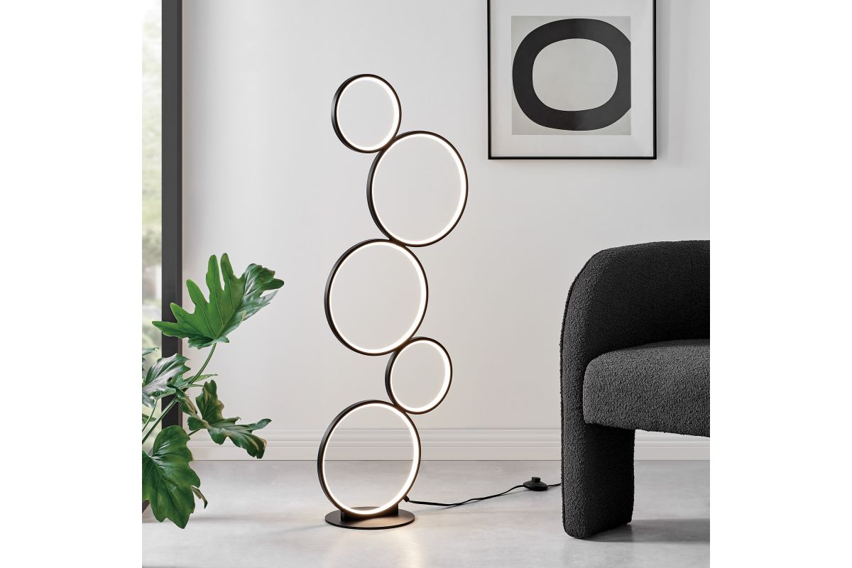 This floor lamp makes a modern statement in your living spaces. It's made from fivemetal rings in difference sizes to create an open loop-like silhouette for a distinctive look. The inner edge of the rings has an integrated LED light that creates a bright glow in your space.
