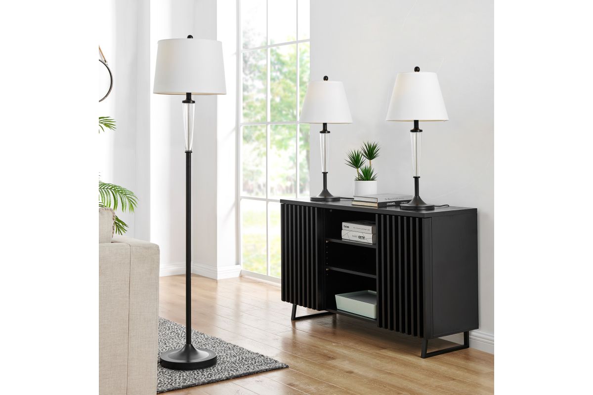 Elevate your home’s ambiance with this elegant 3-pack lamp set, including two matching table lamps and one floor lamp. Featuring a sleek black base with clear glass accent columns and classic white fabric shades, this set blends seamlessly with both traditional and contemporary interiors. Ideal for bedrooms, living rooms, or entryways, it provides balanced lighting and cohesive style across your home.