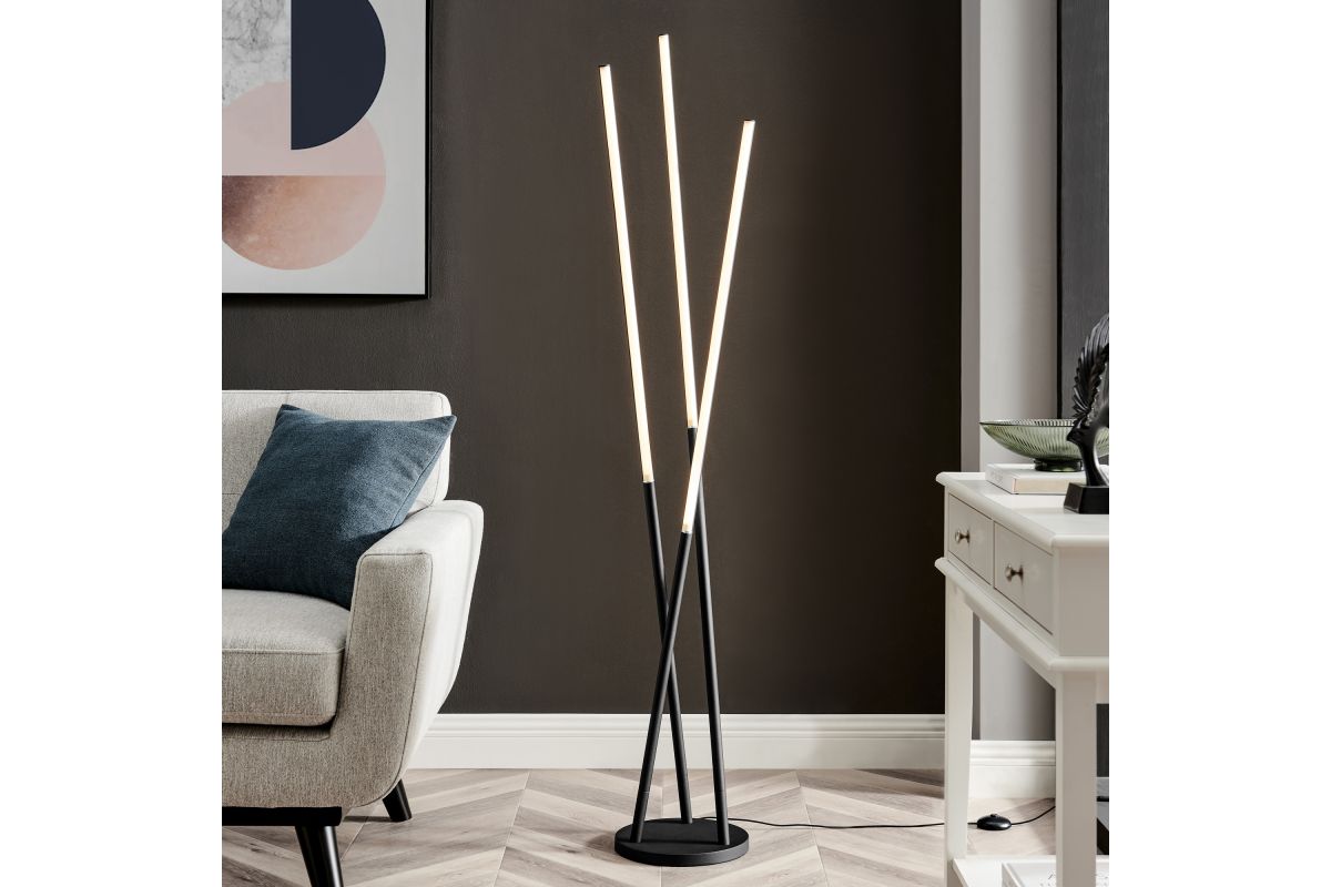 With a minimalist design and architectural charm, this ultra-modern LED tree floor lamp accomplishes a tribute to simple style. This floor focuses on a slender silhouette in a trio design with three long crossed stick-style pieces. The super-bright LED lights provide ample illumination, while the cool-looking design makes a bold statement. This energy-efficient floor lamp operates from a 4-way dimming foot switch.