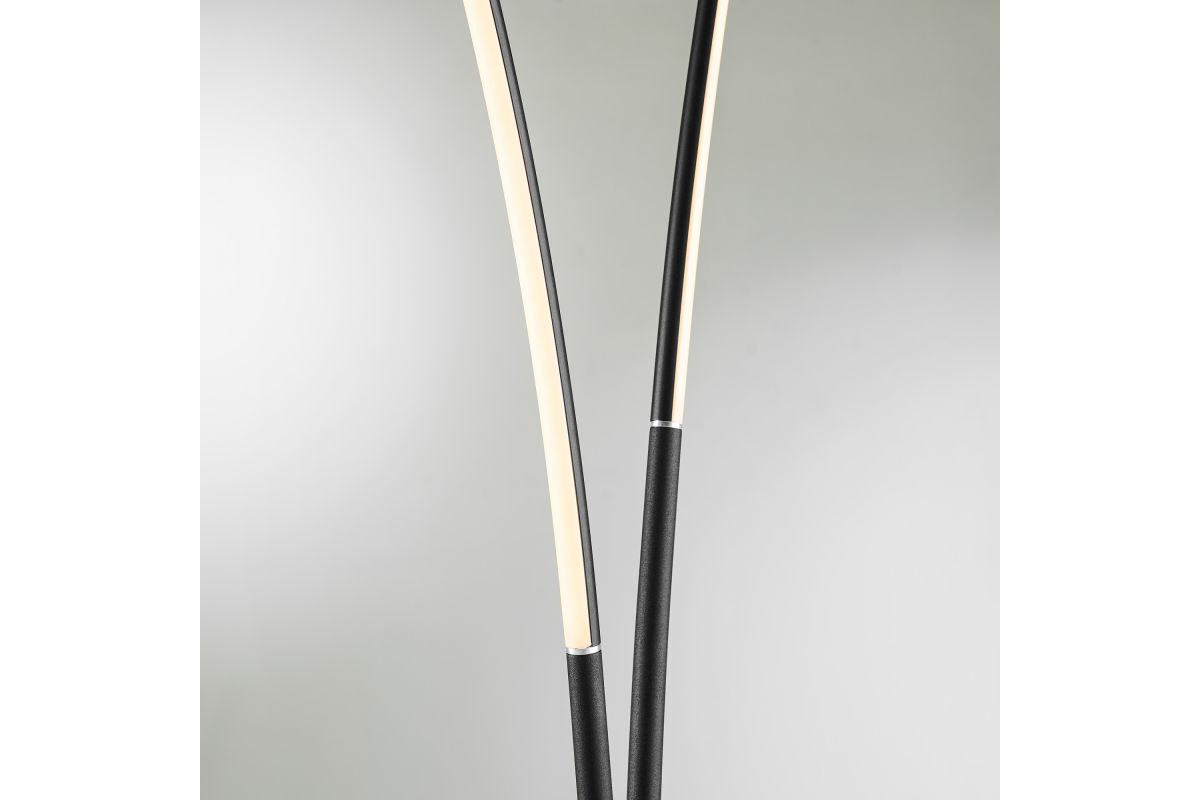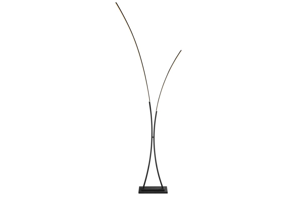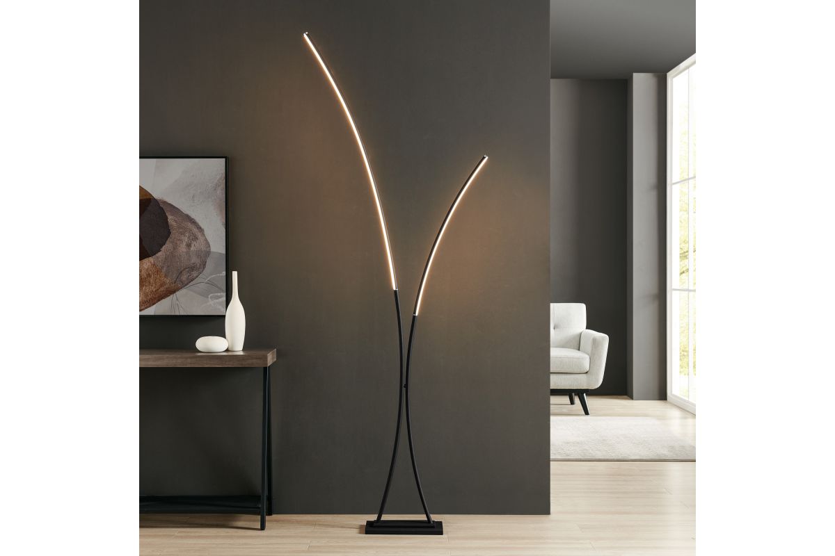 Elevate your space with this sculptural LED floor lamp featuring a dual arc design that mimics the elegance of bending reeds or dancing flames. With a sleek black base and minimalist silhouette, it delivers ambient lighting while doubling as a contemporary art piece.