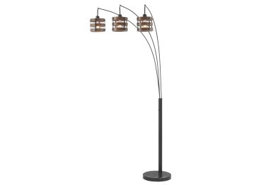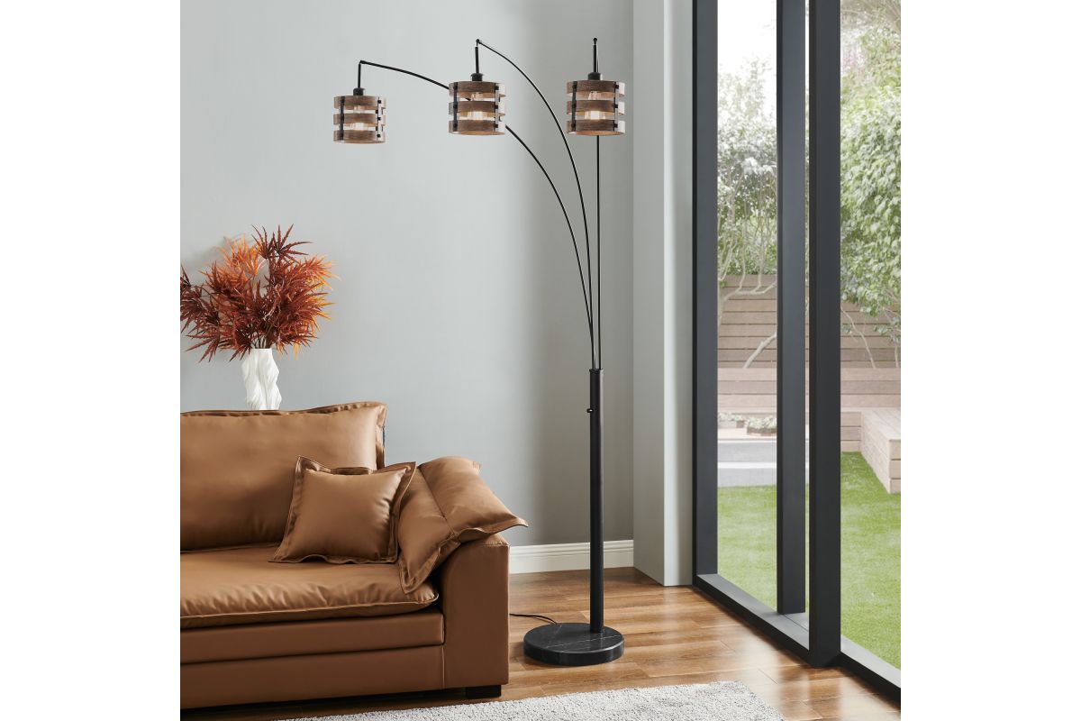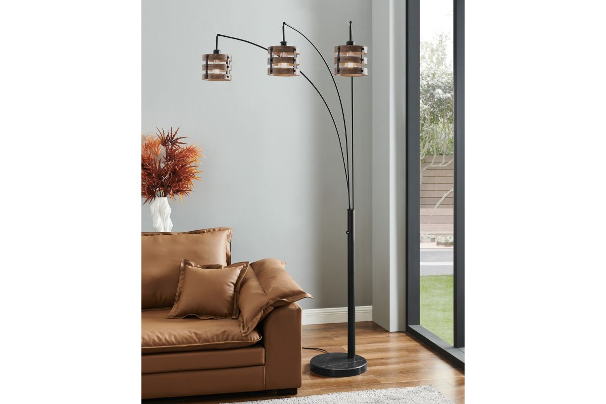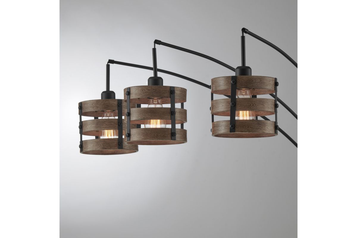 Introducing the exquisite 3-light arch floor lamp, a stunning addition to any space. Crafted with utmost care, this lamp boasts a rich brown wood grain finish lamp shade made with heavyweight metal, providing a sense of durability and longevity. The vintage-style Edison bulbs are exposed, lending an old-world charm to the piece, while the sleek black metal construction adds a contemporary touch. Perfect for a modern loft or a rustic farmhouse, this lamp is ideal for sectionals and sofas, bringing warmth and elegance to your living space.