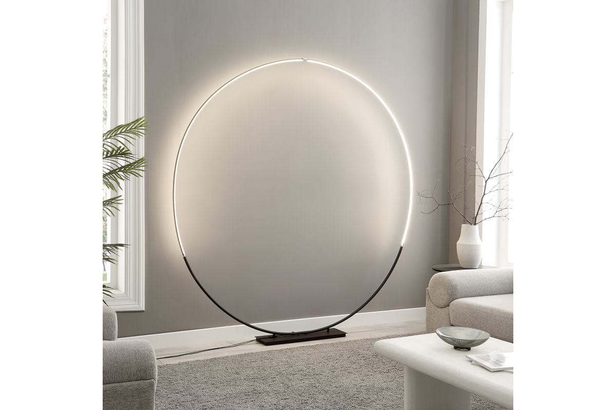 Experience the awe-inspiring beauty of minimalist design with our oversized, brilliantly luminous circular LED floor lamp—a true centerpiece for any space. Crafted from durable metal with a sleek metallic finish, this lamp is crowned by an aluminum and acrylic diffuser. However, its standout feature lies in its gracefully curved and delicately slim silhouette.  Perfect for positioning behind a sofa, along a foyer wall, or even in the master bedroom, it exudes an ultra-modern vibe. This circular marvel can transform into two separate arch floor lamps by removing the cover on the base, allowing you to adorn both sides of seating areas or your favorite armchair. Enjoy customizable lighting with a convenient foot switch offering 4-way dimming control. Illuminate your space with contemporary elegance and versatility.