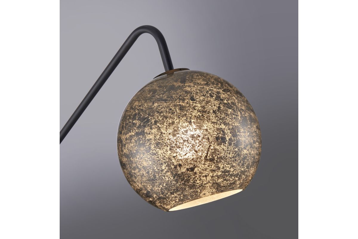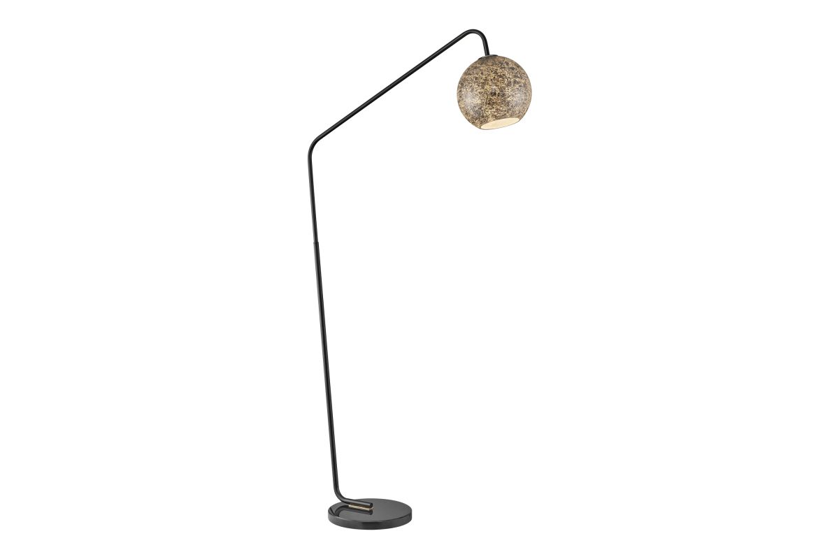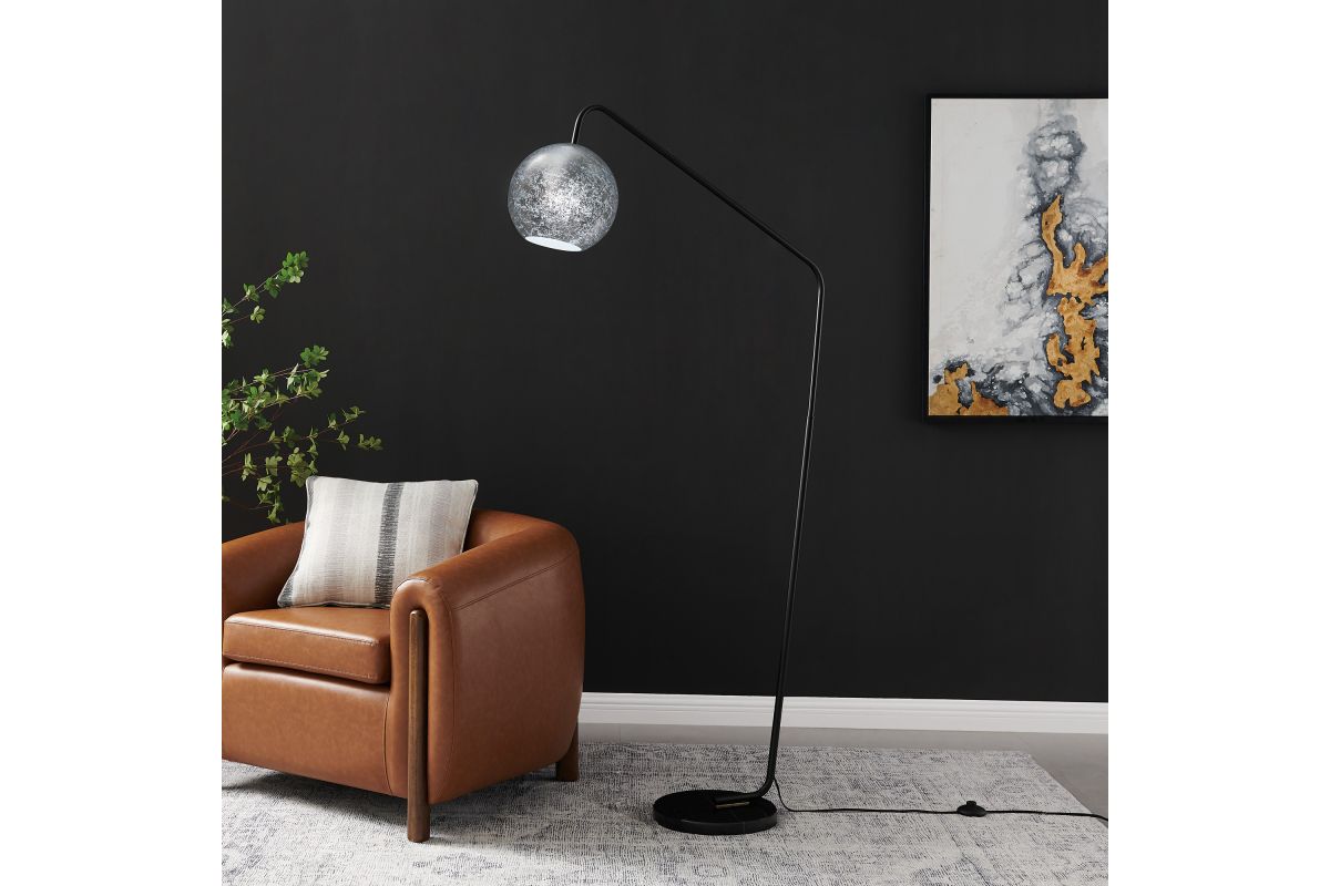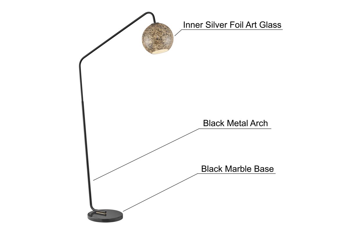 Transform your living room with this stunning black metal floor lamp, adorned with brass accents, striking a perfect balance between minimalism and mid-century modern aesthetics. Its alluring angular arc armĀ and heavy marble base addsĀ both style and functionality, extending gracefully over seating areas or your favorite armchair. The meticulously handcrafted innerĀ silver-foil art glass dome shade serves as its centerpiece, infusing your space with artistic allure. This lamp's convenience is unmatched, featuring an on-off foot switch for effortless control.