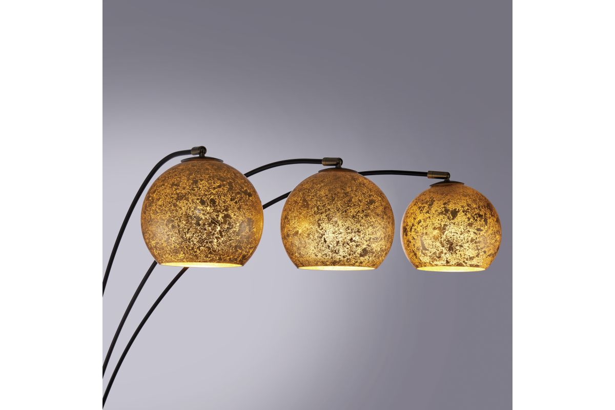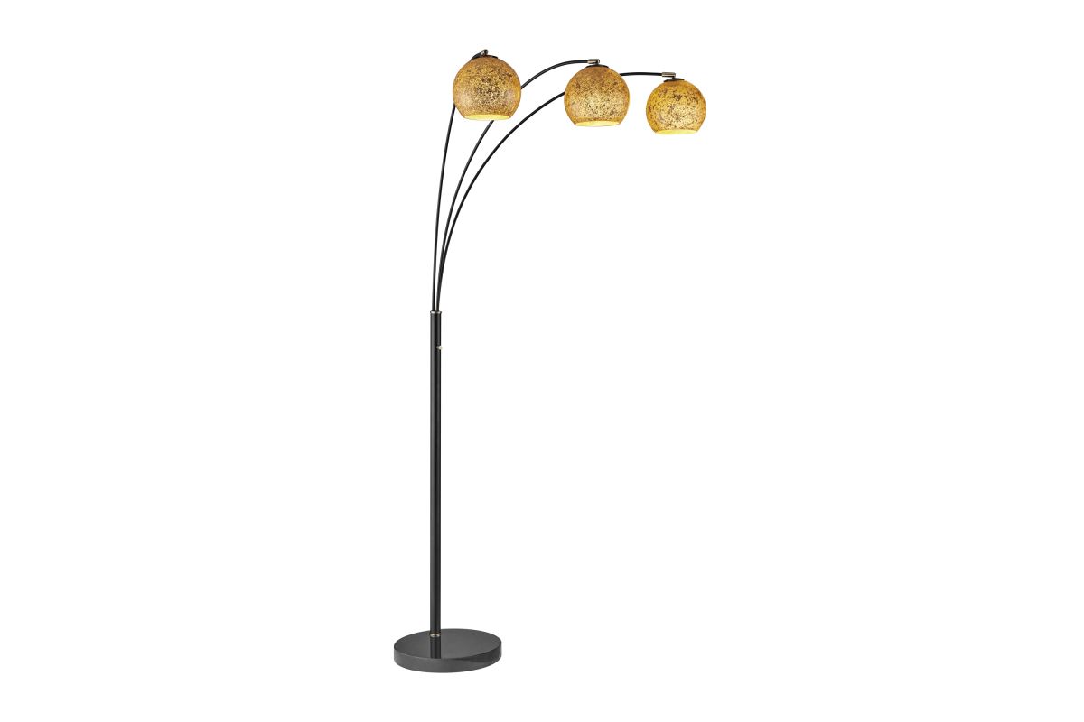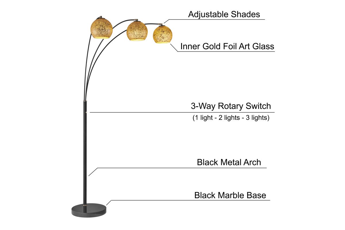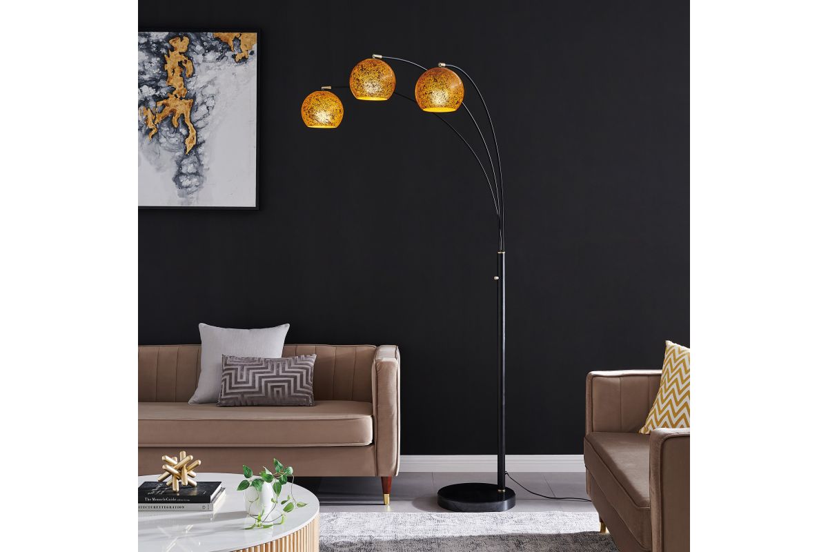 Transform your living room with this stunning black metal floor lamp, adorned with brass accents, striking a perfect balance between minimalism and mid-century modern aesthetics. Its alluring angular arc armĀ and heavy marble base addsĀ both style and functionality, extending gracefully over seating areas or your favorite armchair. The meticulously handcrafted inner gold-foil art glass dome shade serves as its centerpiece, infusing your space with artistic allure. This lamp's convenience is unmatched, featuring an on-off foot switch for effortless control.