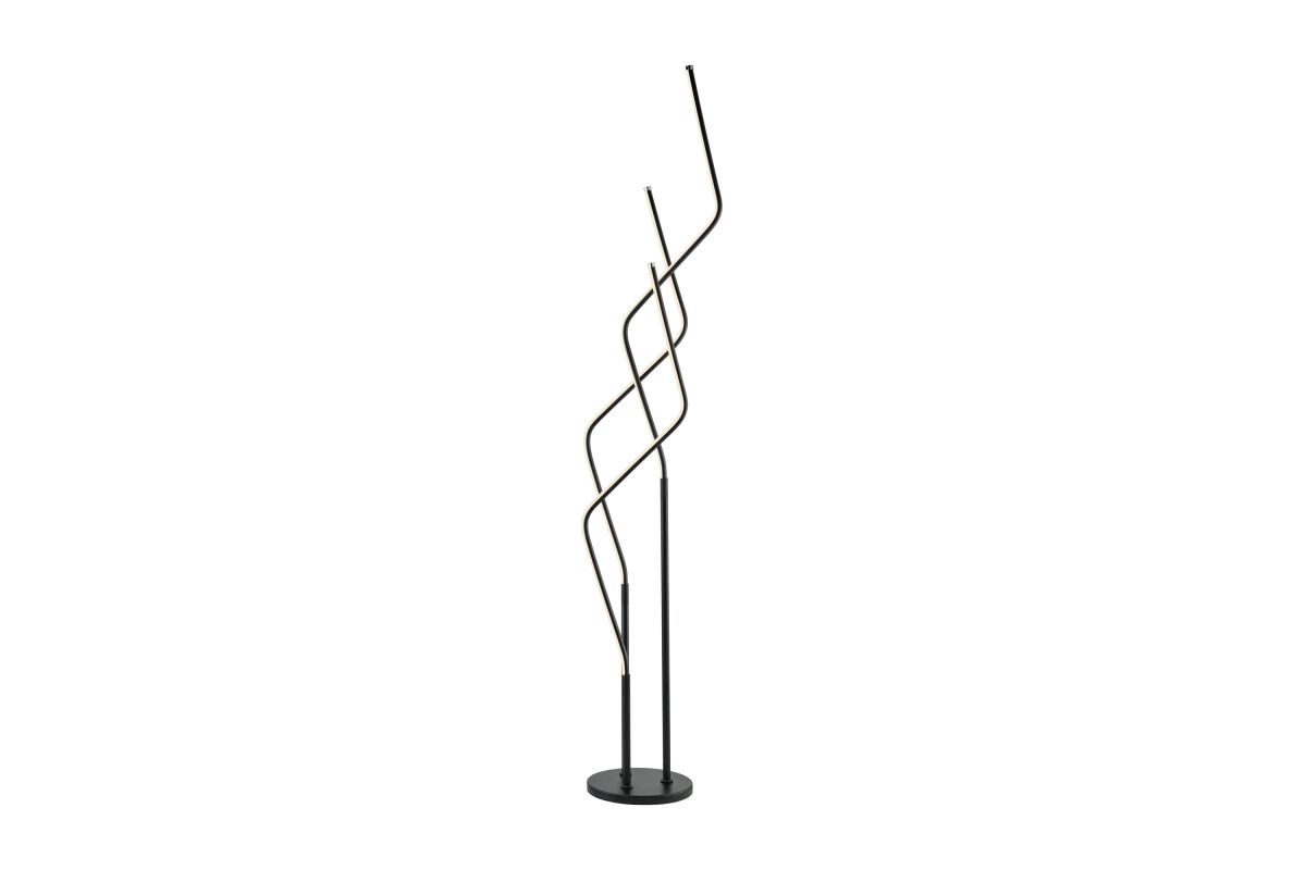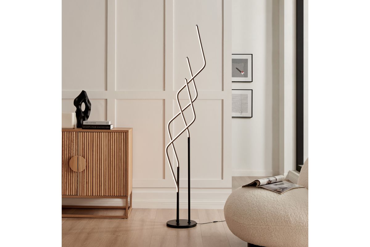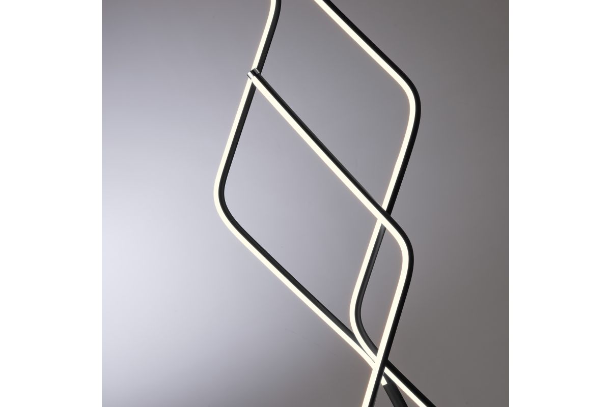 Boasting a minimalist design and architectural allure, this ultra-modern LED floor lamp pays homage to artistic style. Crafted with precision, it showcases a metallic finish on a sturdy metal structure, crowned by an aluminum and acrylic diffuser. Yet, its most striking feature is its sleek, wavy, and ethereally thin silhouette. The clean-lined angular LED frames can rotate 360 degrees, allowing for effortless creation of various artistic presentations. For your convenience, a foot switch offers 4-way dimming control over the lighting.