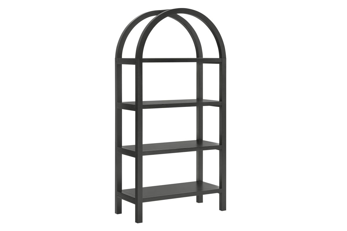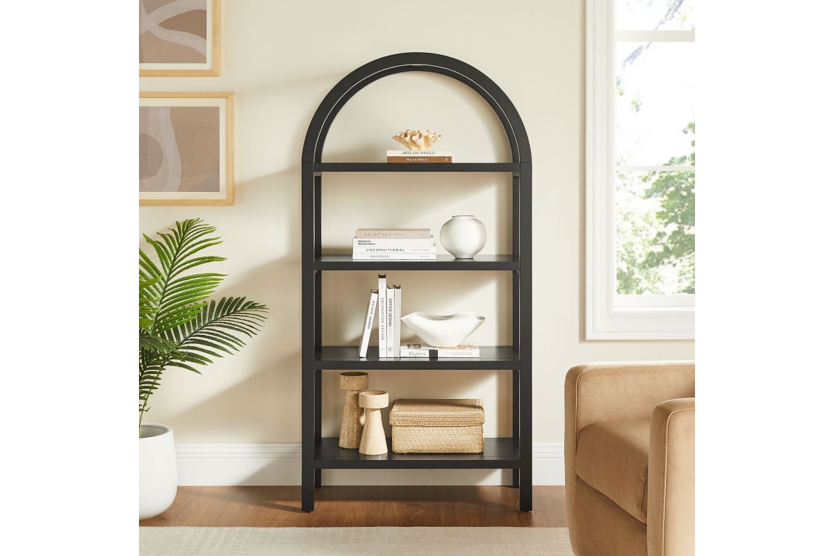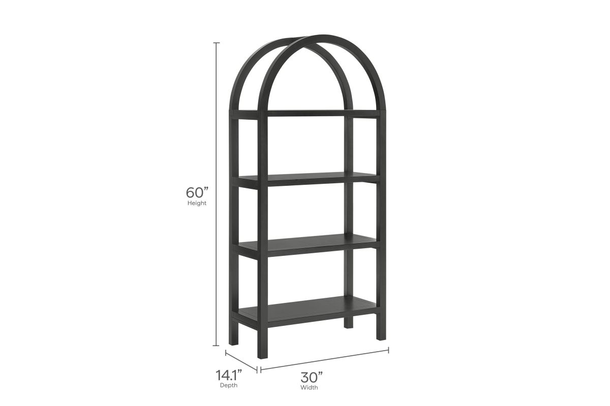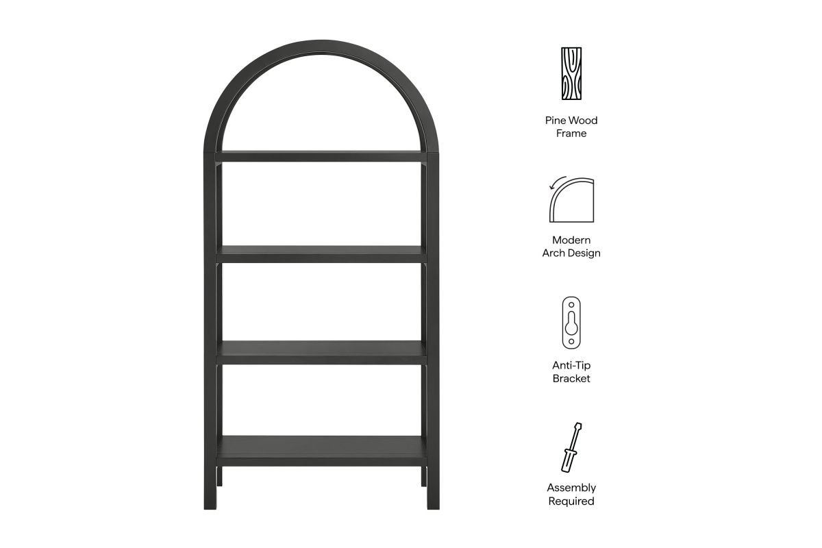 With its sculptural curves and modern take on classic arches, the Vexley Arched Bookshelf brings an artful edge to any space. Ideal for showcasing curated objects, favorite reads, or design-forward accents, this 60 inch open shelf bookcase plays with negative space and architectural curves, bringing an airy, artful touch to blank walls or creative corners. Built from a pine wood frame and shelves, Vexley offers both strength and style. For added safety, it includes an anti-tip bracket on one of the middle shelves and non-marking glides to protect flooring. A true conversation starter, this arch bookshelf adds sculptural depth without visual clutter, blending modern form with effortless display potential. Assembly required. Weight Capacity: 220lbs.