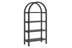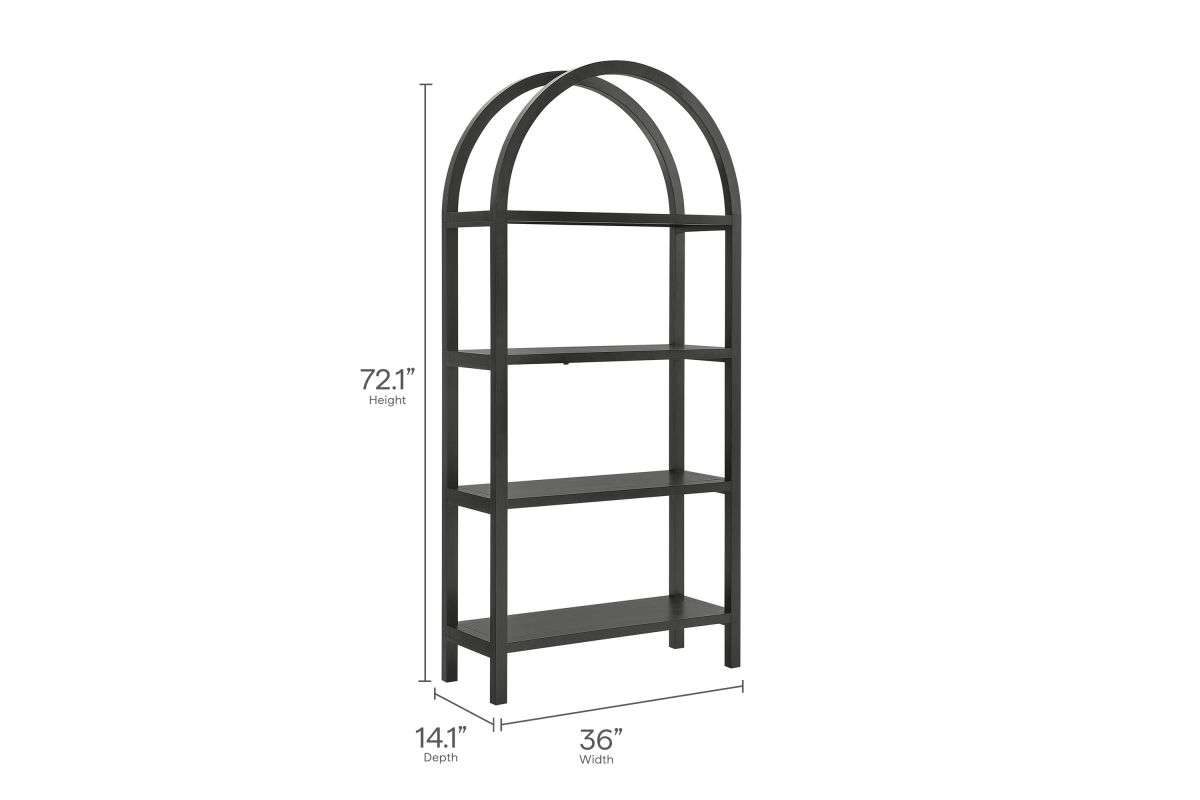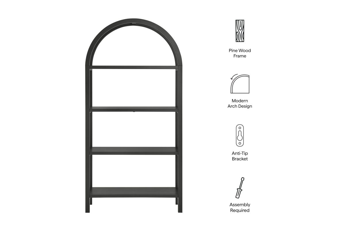 With its sculptural curves and modern take on classic arches, the Vexley Arched Bookshelf brings an artful edge to any space. Ideal for showcasing curated objects, favorite reads, or design-forward accents, this large 72 inch open shelf bookcase plays with negative space and architectural curves, bringing an airy, artful touch to blank walls or creative corners. Built from a pine wood frame and shelves, Vexley offers both strength and style. For added safety, it includes an anti-tip bracket on one of the middle shelves and non-marking glides to protect flooring. A true conversation starter, this arch bookshelf makes a bold statement without visual clutter, blending modern form with effortless display potential. Assembly required. Weight Capacity: 220lbs.