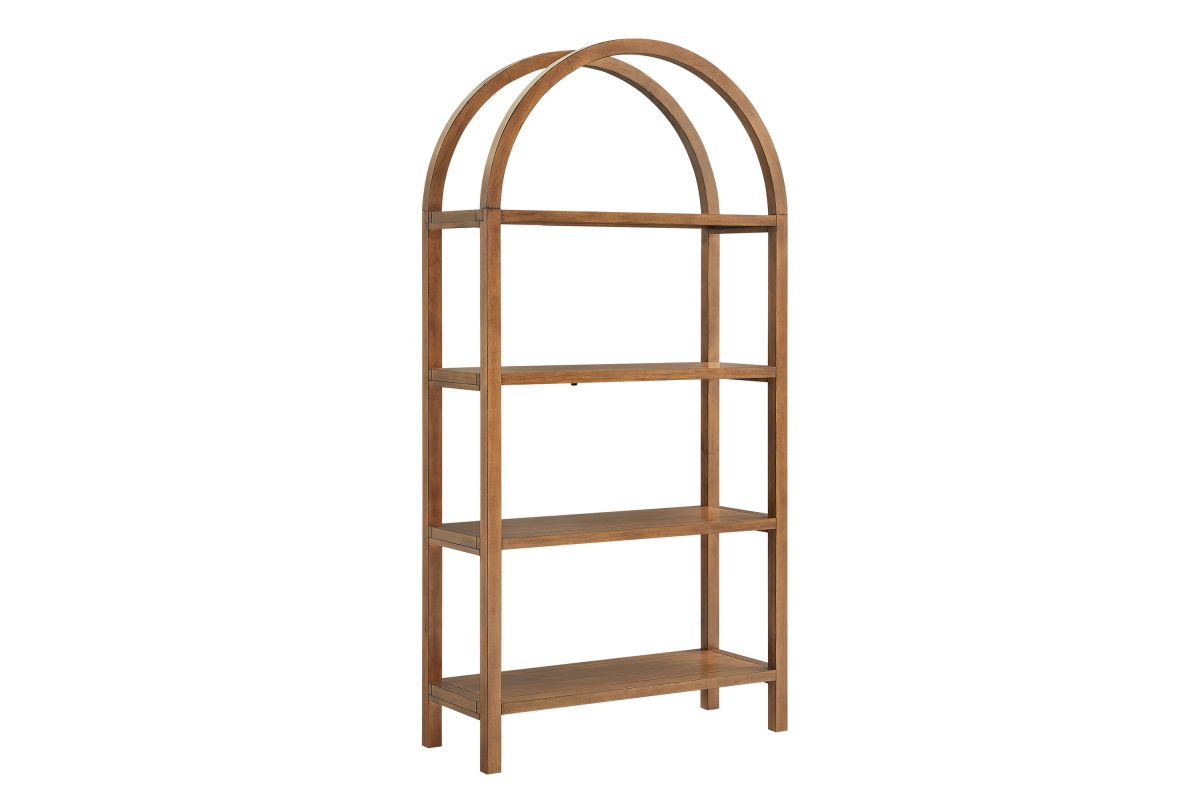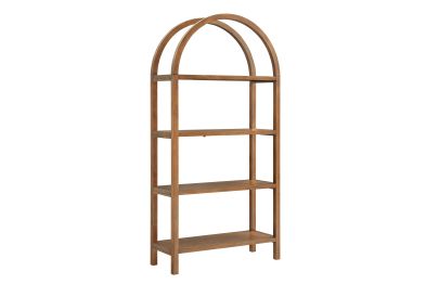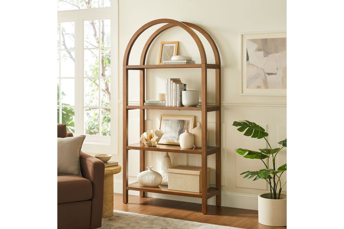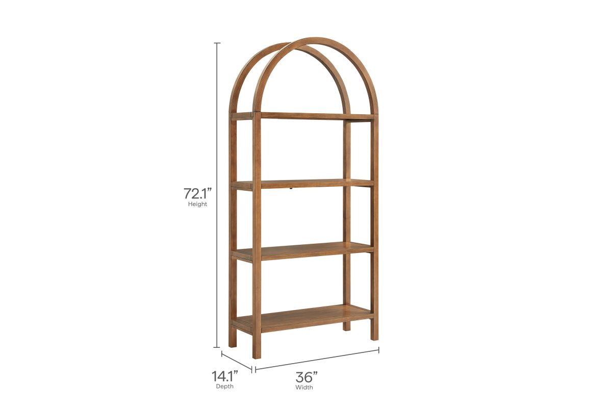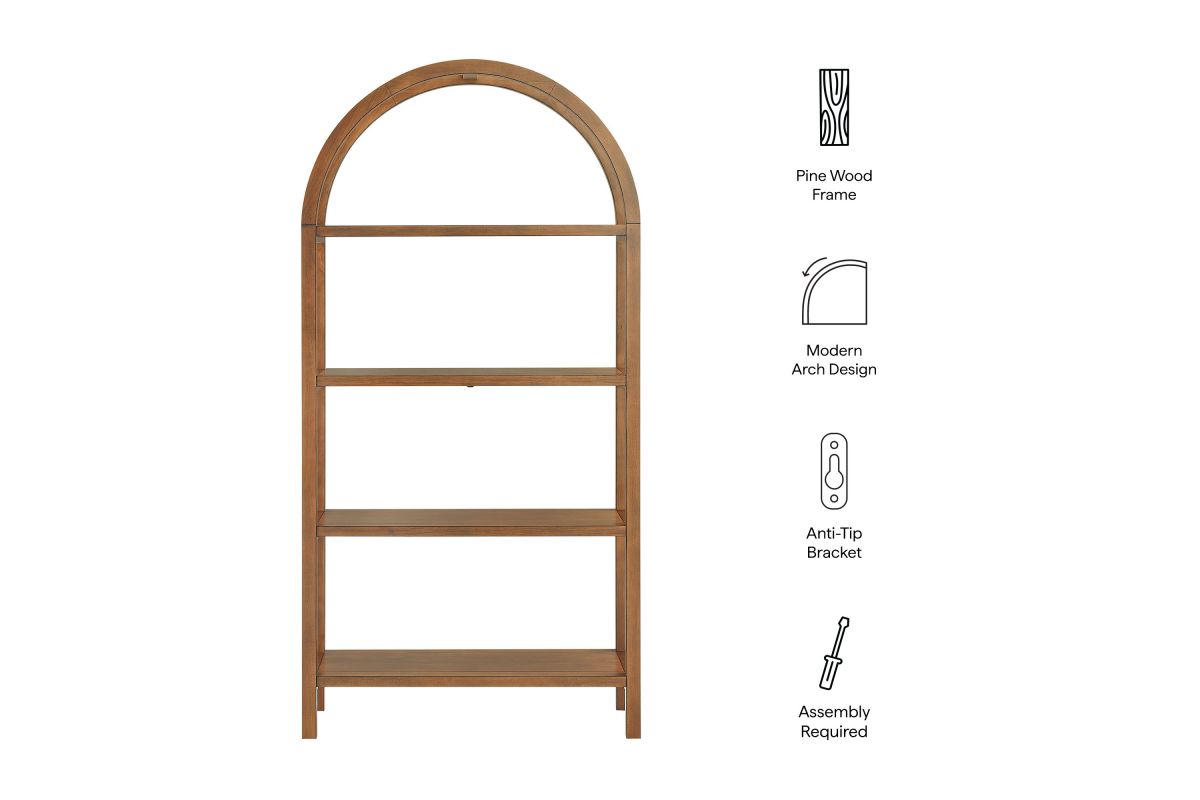 With its sculptural curves and modern take on classic arches, the Vexley Arched Bookshelf brings an artful edge to any space. Ideal for showcasing curated objects, favorite reads, or design-forward accents, this large 72 inch open shelf bookcase plays with negative space and architectural curves, bringing an airy, artful touch to blank walls or creative corners. Built from a pine wood frame and shelves, Vexley offers both strength and style. For added safety, it includes an anti-tip bracket on one of the middle shelves and non-marking glides to protect flooring. A true conversation starter, this arch bookshelf makes a bold statement without visual clutter, blending modern form with effortless display potential. Assembly required. Weight Capacity: 220lbs.