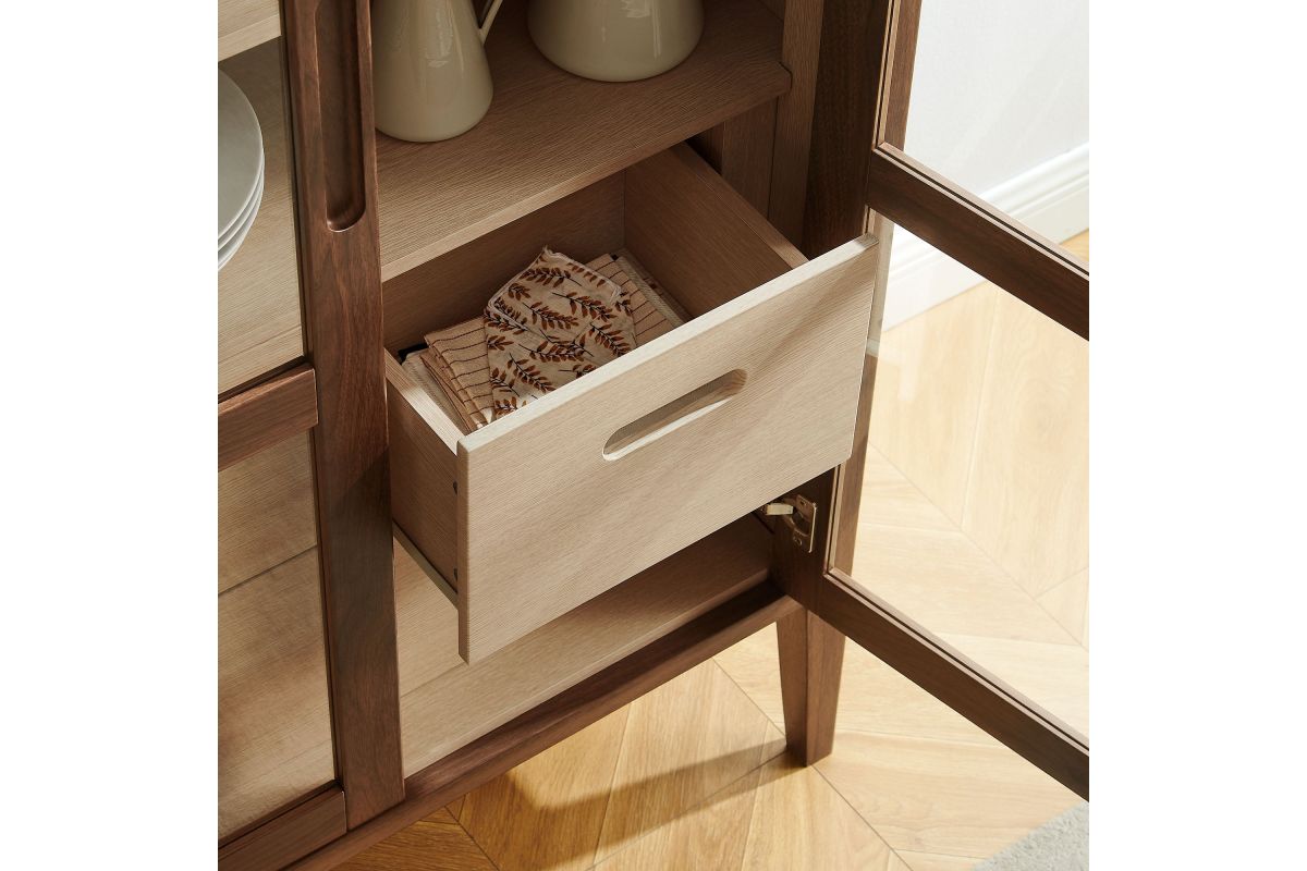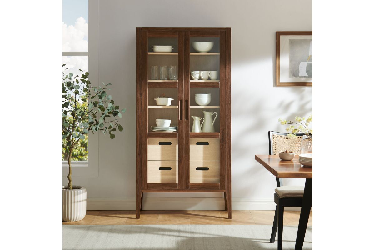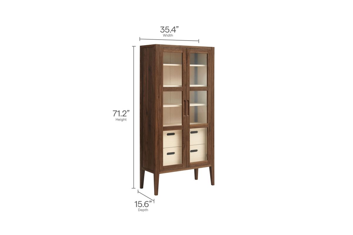 The Nell display cabinet brings a crisp mid-century silhouette and multipurpose design to your living space. This 71-inch tall storage cabinet features two framed tempered glass doors that open smoothly with minimalist finger pull cutout handles. Behind the glass display cabinet doors, four open shelves offer ample space for showcasing dishes, books, or collectibles, while four lower drawers with cutout handles keep smaller items neatly tucked away. The wood grain finish adds warmth to this modern cabinet, while its versatile height makes it a functional piece for use as a china cabinet hutch, kitchen pantry cabinet, or a unique living room bookcase. With clean lines and slightly tapered legs, it's a refined option for those who love mid century storage cabinet styles. Weight Capacity: Shelves (x4): 264 lbs; Drawers (x4): 88 lbs