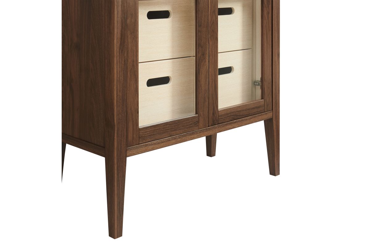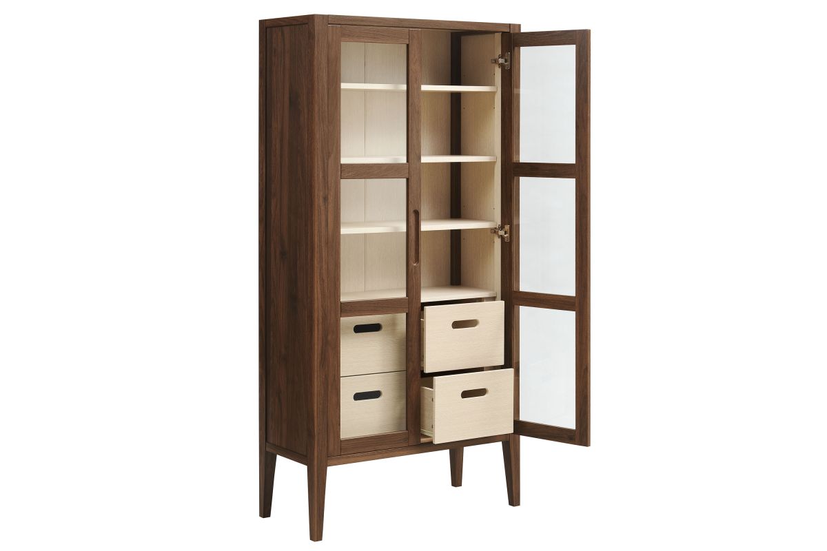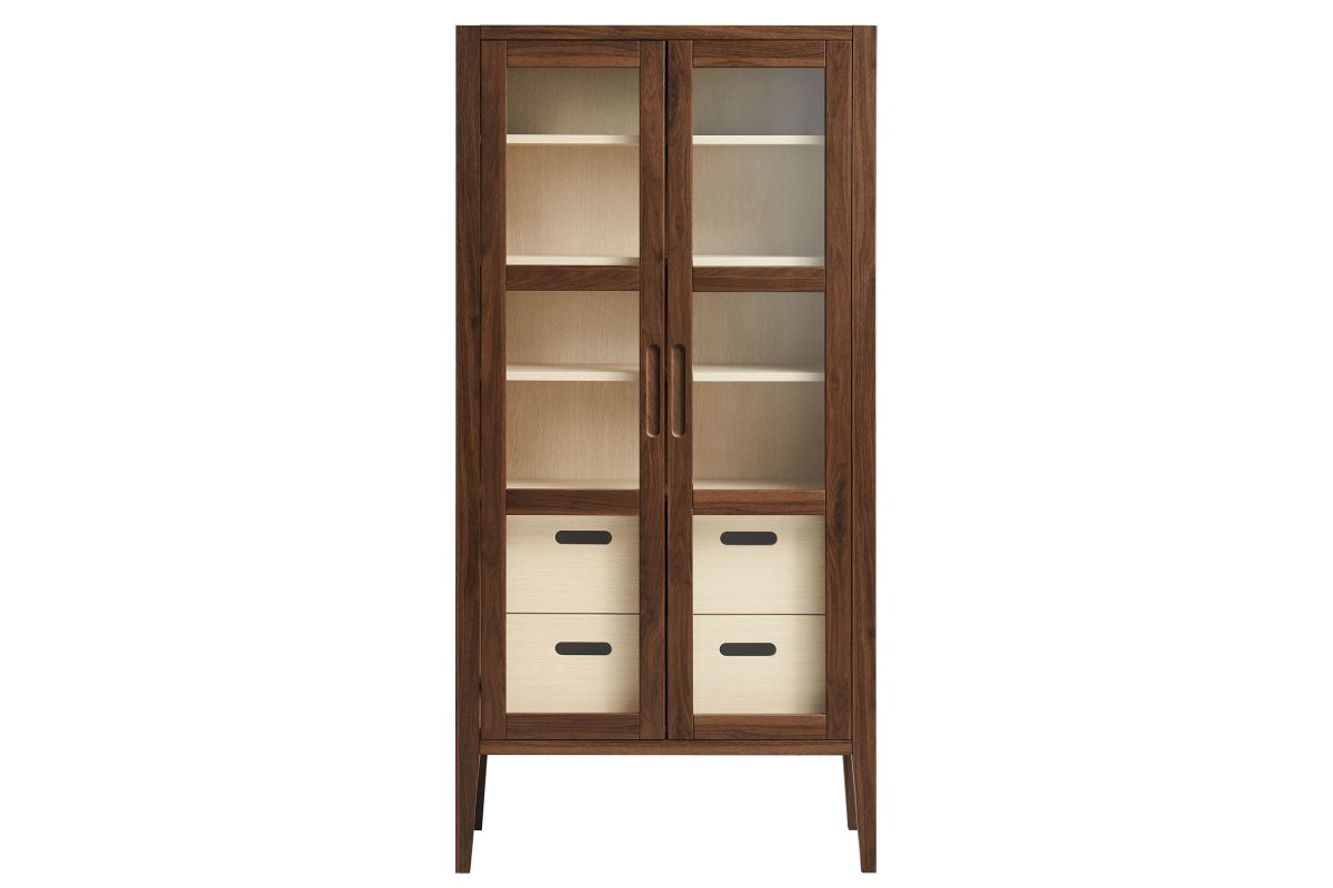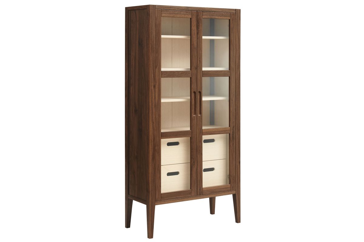 The Nell display cabinet brings a crisp mid-century silhouette and multipurpose design to your living space. This 71-inch tall storage cabinet features two framed tempered glass doors that open smoothly with minimalist finger pull cutout handles. Behind the glass display cabinet doors, four open shelves offer ample space for showcasing dishes, books, or collectibles, while four lower drawers with cutout handles keep smaller items neatly tucked away. The wood grain finish adds warmth to this modern cabinet, while its versatile height makes it a functional piece for use as a china cabinet hutch, kitchen pantry cabinet, or a unique living room bookcase. With clean lines and slightly tapered legs, it's a refined option for those who love mid century storage cabinet styles. Weight Capacity: Shelves (x4): 264 lbs; Drawers (x4): 88 lbs