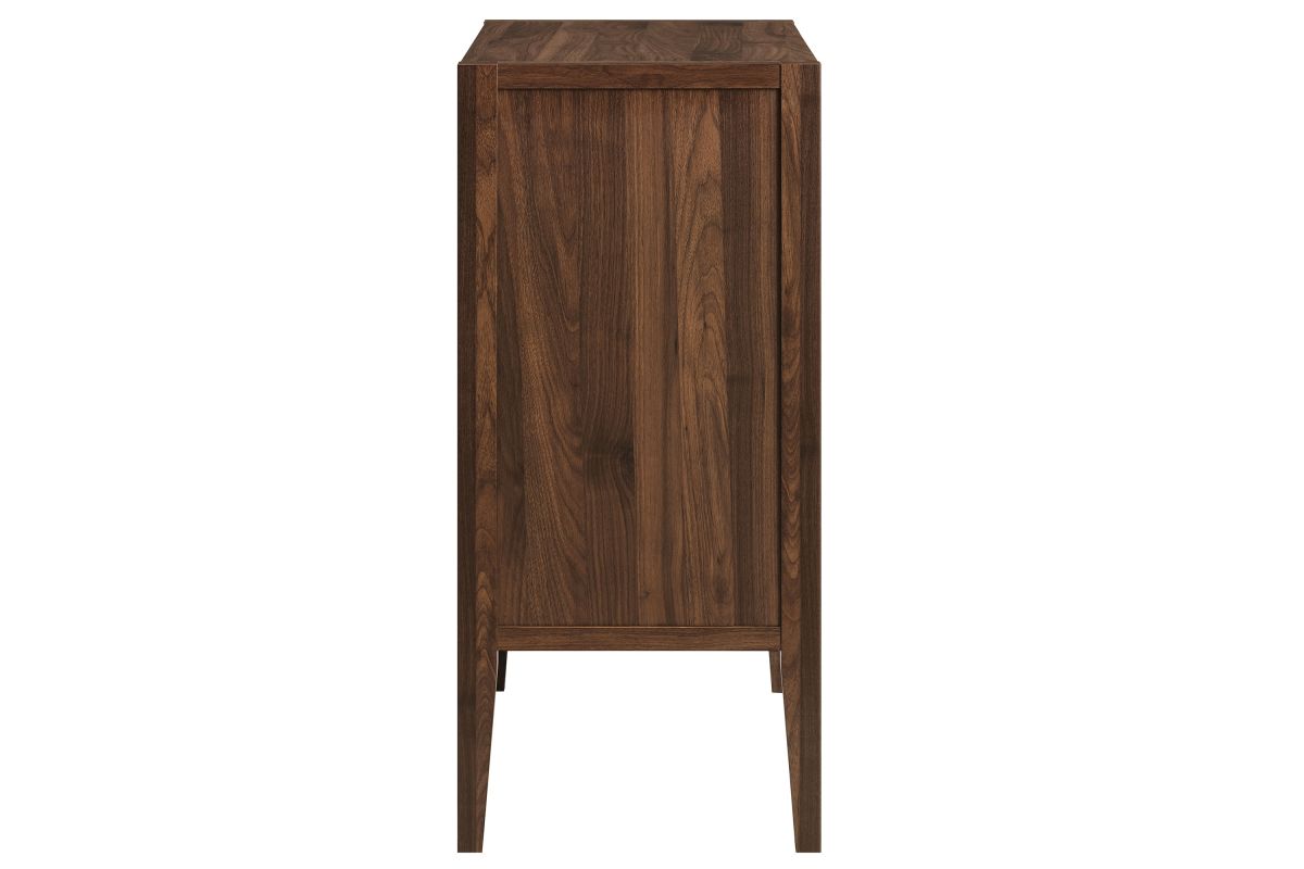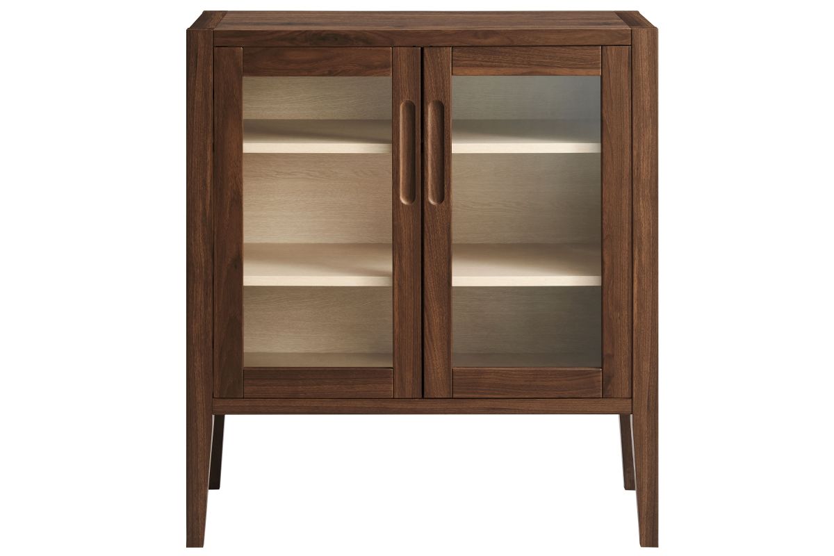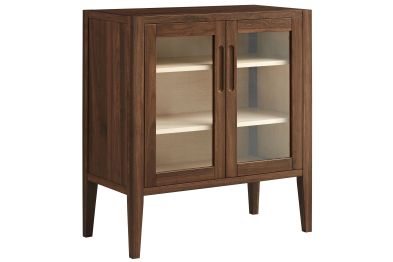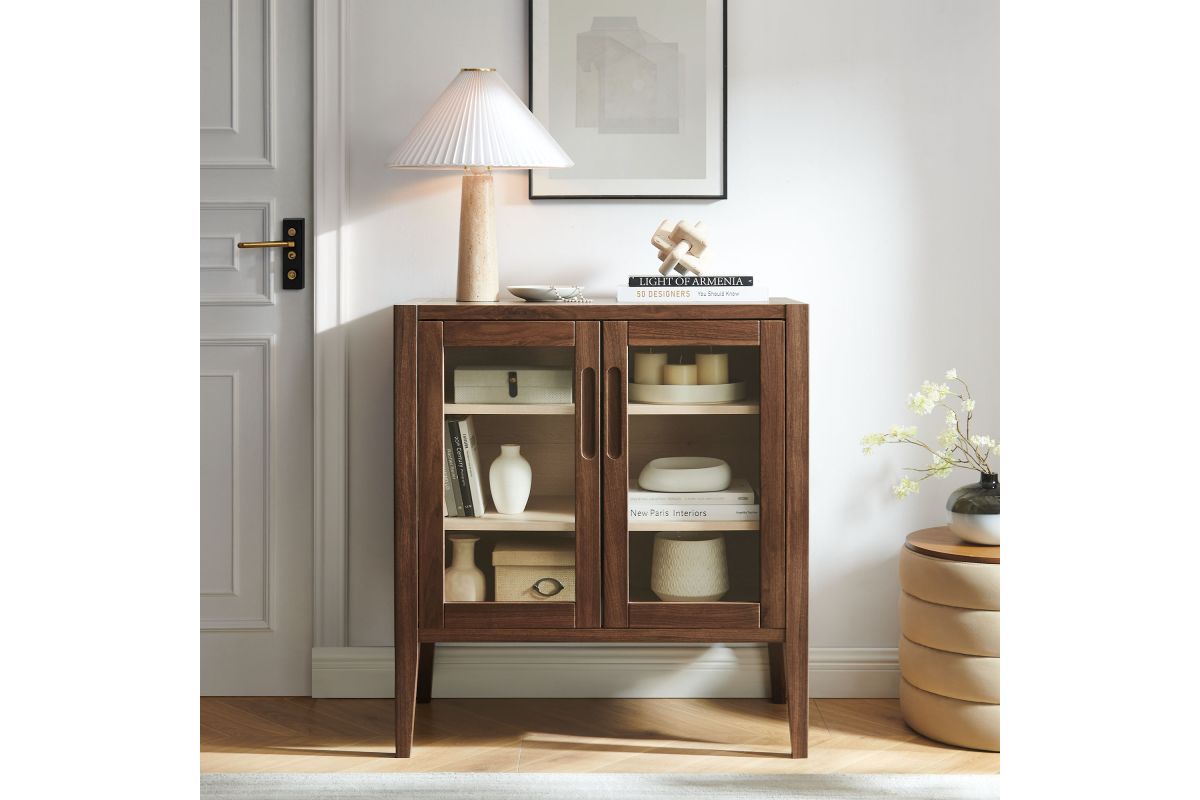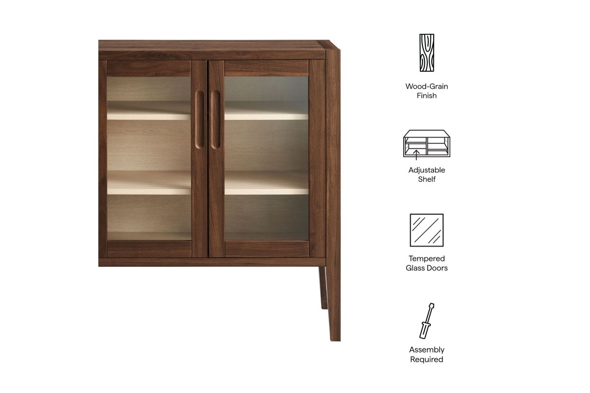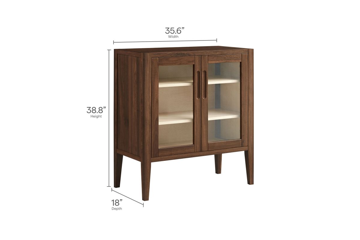 The Nell 35" Accent Cabinet brings a crisp mid-century silhouette and space-saving versatility to your home. This small storage cabinet features two framed tempered glass doors that open effortlessly with minimalist finger pull cutout handles. Behind the glass display cabinet, two shelves offer room to organize serveware, bar essentials, or decorative objects. The compact scale and warm wood-grain finish make it an ideal piece for use as a tea cabinet buffet, small bar cabinet, entryway cabinet or a modern living room accent cabinet. With clean lines and gently tapered legs, it’s a refined option for those who love mid century modern furniture. Weight Capacity: 201 lbs.