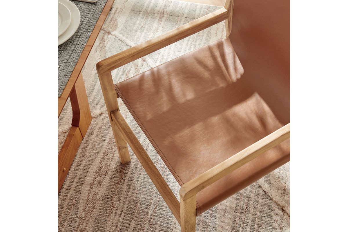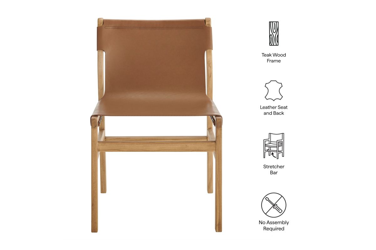 Bring timeless ease to your interior with the Sonora Teak Wood Leather Dining Chair. Designed with a refined silhouette and classic profile, this leather dining chair features a solid teak frame that highlights the wood’s natural grain while offering long-lasting support. The smooth leather seat and backrest provide structured comfort, making it a smart choice for meals, meetings, or casual seating throughout the home. Whether placed in a dining space, study, or hallway, this modern leather chair delivers a sculptural presence with warm materials and clean lines. Arrives Fully Assembled.
