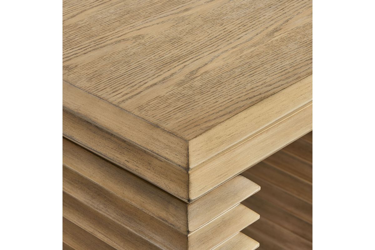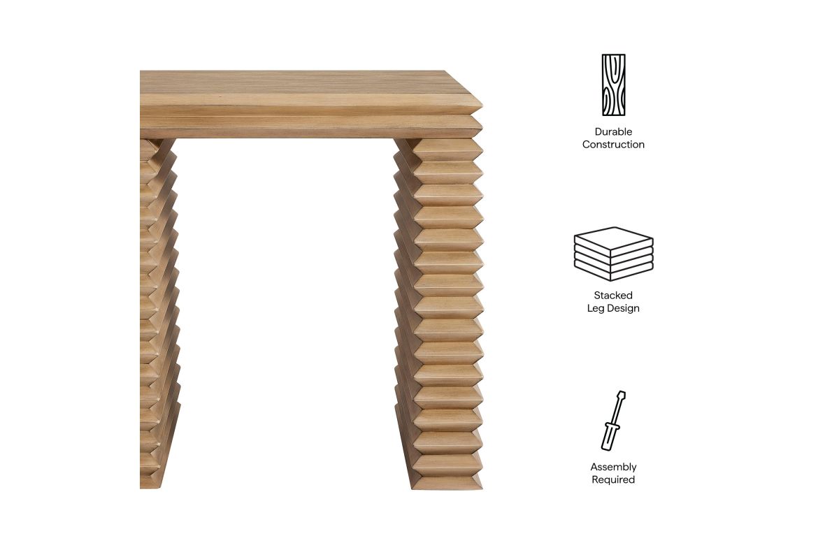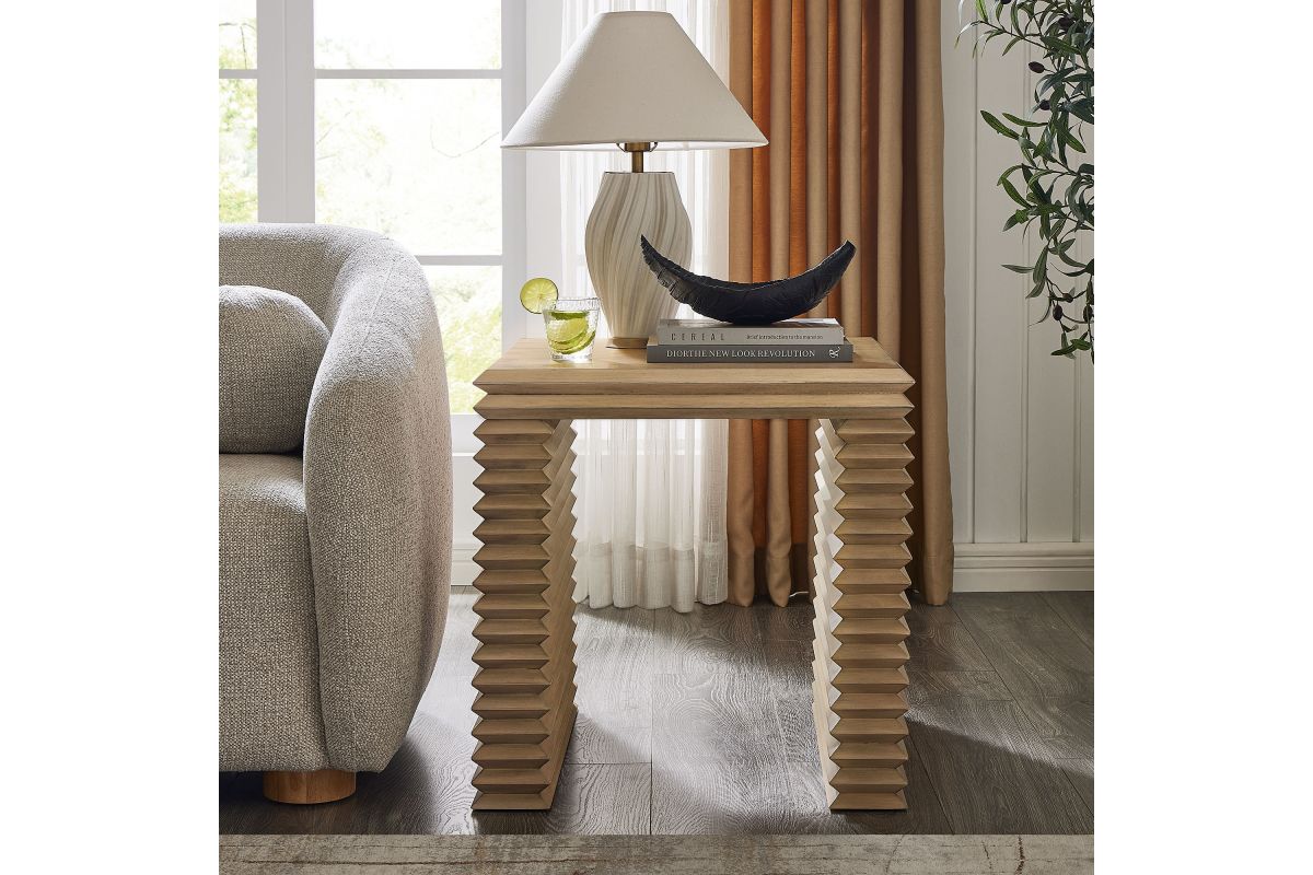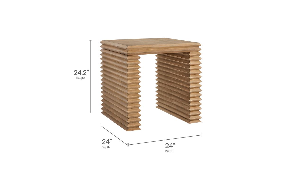 Sculptural and grounded, the Canto Side Table makes a bold impression in any modern living space. With its clean form and eye-catching stacked leg design, this square end table blends architectural expression with refined materiality. The tabletop is finished in an oak wood grain veneer, offering durability and a warm, natural aesthetic. The grooved, layered base adds dimension and rhythm—subtle yet striking from every angle. Whether styled as a small space nightstand, an accent table beside your sofa, or a sculptural drink table, this compact table functions as both a surface and a statement piece. At 24 inches wide, it offers enough space for a lamp, book, or decorative object. Assembly required. Weight Capacity: 300 lbs.