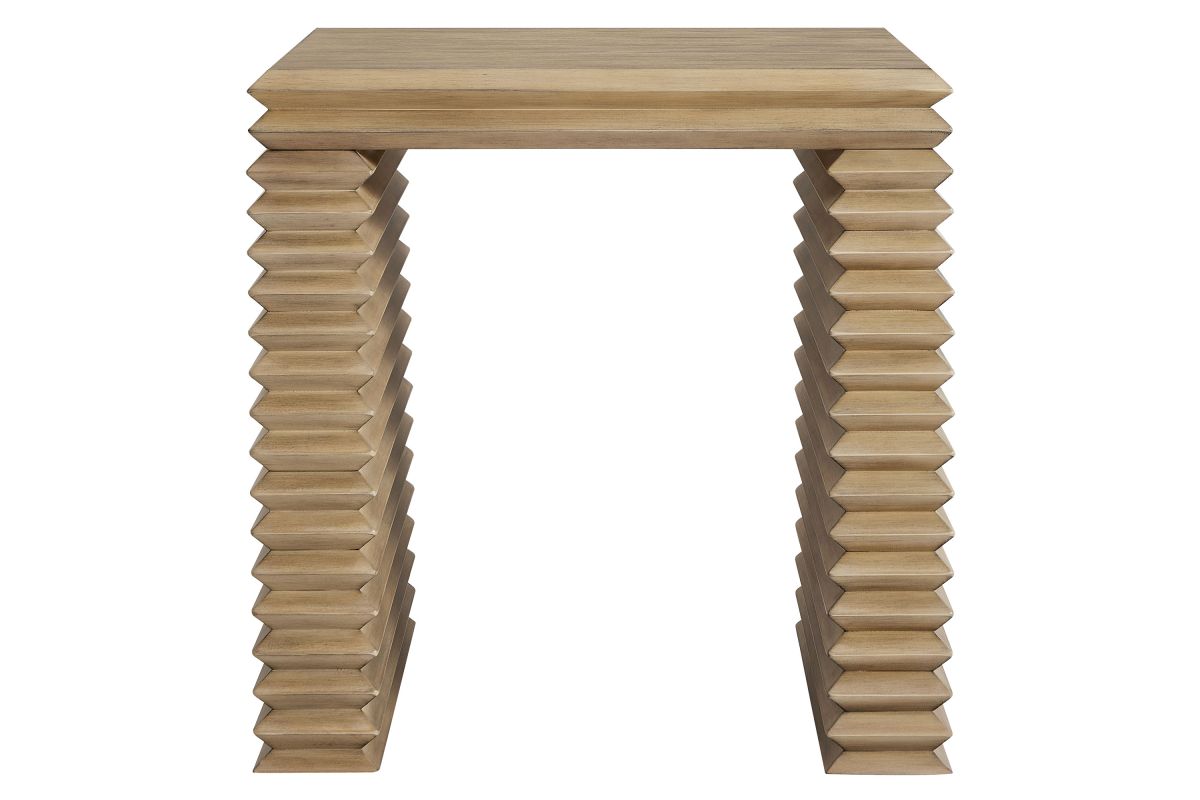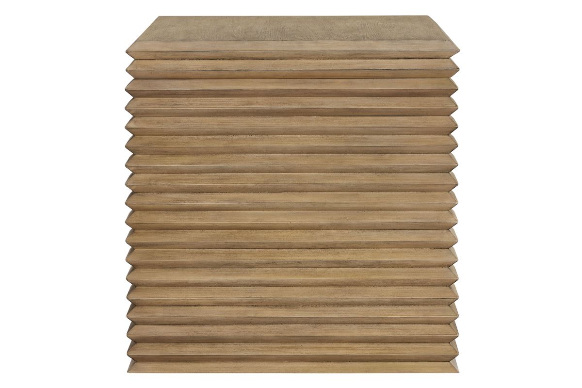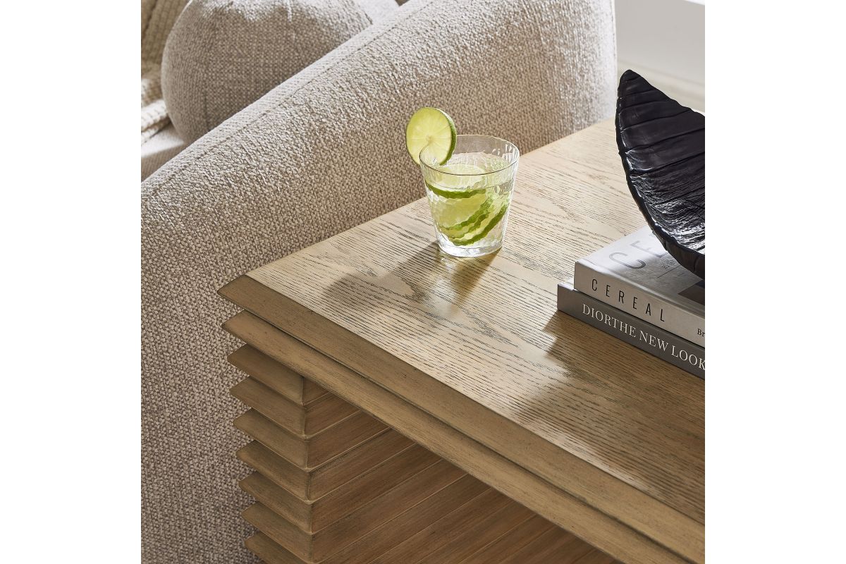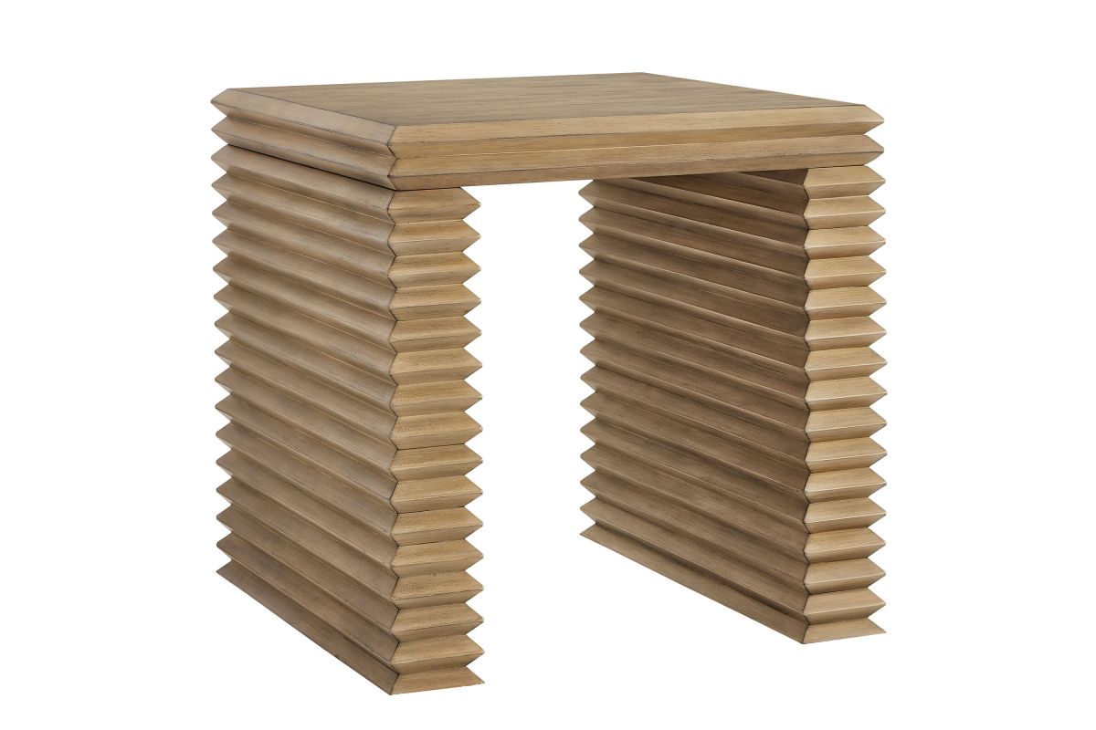 Sculptural and grounded, the Canto Side Table makes a bold impression in any modern living space. With its clean form and eye-catching stacked leg design, this square end table blends architectural expression with refined materiality. The tabletop is finished in an oak wood grain veneer, offering durability and a warm, natural aesthetic. The grooved, layered base adds dimension and rhythm—subtle yet striking from every angle. Whether styled as a small space nightstand, an accent table beside your sofa, or a sculptural drink table, this compact table functions as both a surface and a statement piece. At 24 inches wide, it offers enough space for a lamp, book, or decorative object. Assembly required. Weight Capacity: 300 lbs.