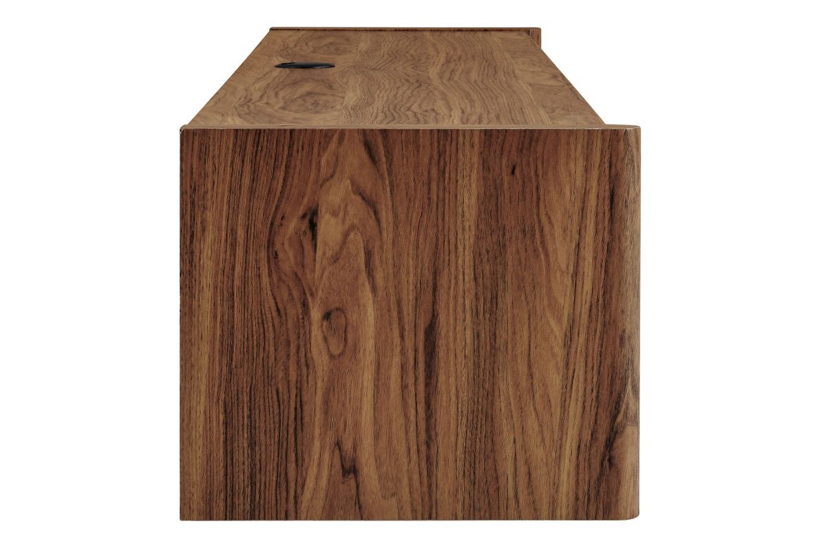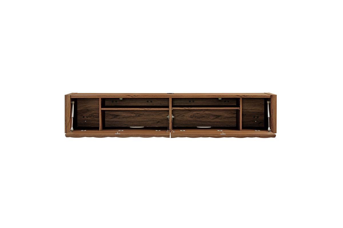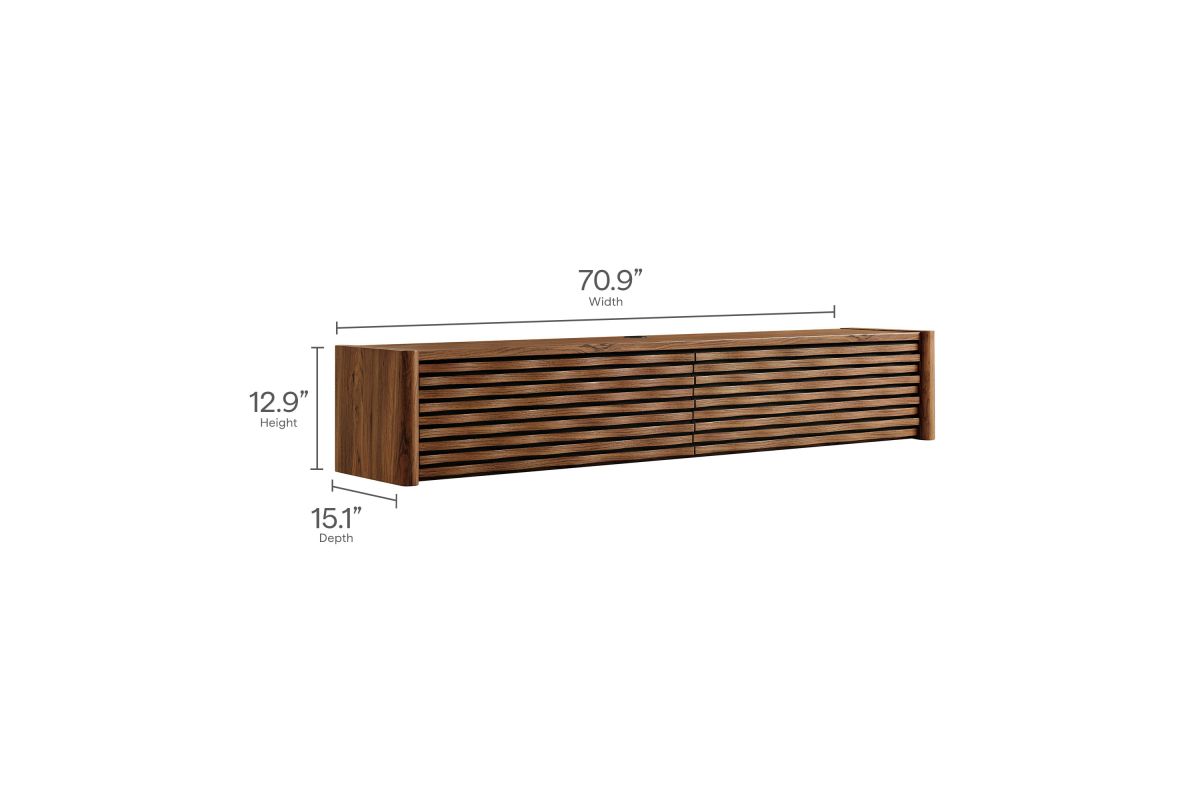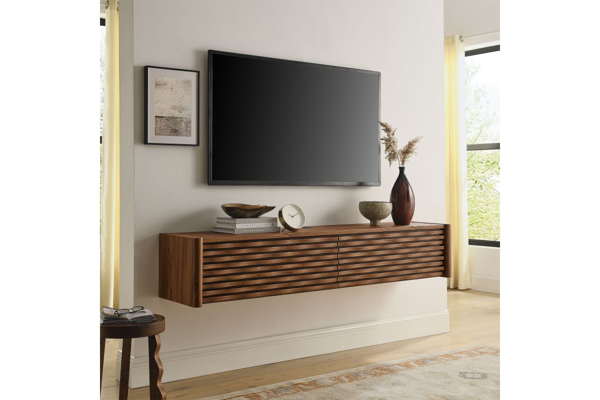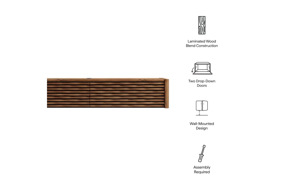 Simple in purpose, the Emric Floating TV Stand brings a soft, sculpted feel to functional media storage. Made from a laminated wood blend with a smooth finish, this wall-mounted TV cabinet features slatted doors with a subtle wave design on a black backdrop that provides depth and movement. Two drop-down doors open to reveal interior shelving with cable management cutouts, perfect for organizing game consoles, streaming boxes, and other living room essentials. Designed to mount directly on the wall, this modern floating media console frees up floor space while offering plenty of concealed storage. Whether used under a mounted TV in the living room or as part of a broader media center setup, Emric delivers visual impact and everyday utility. Wall mounting and assembly required. Cable management hole with grommet included.