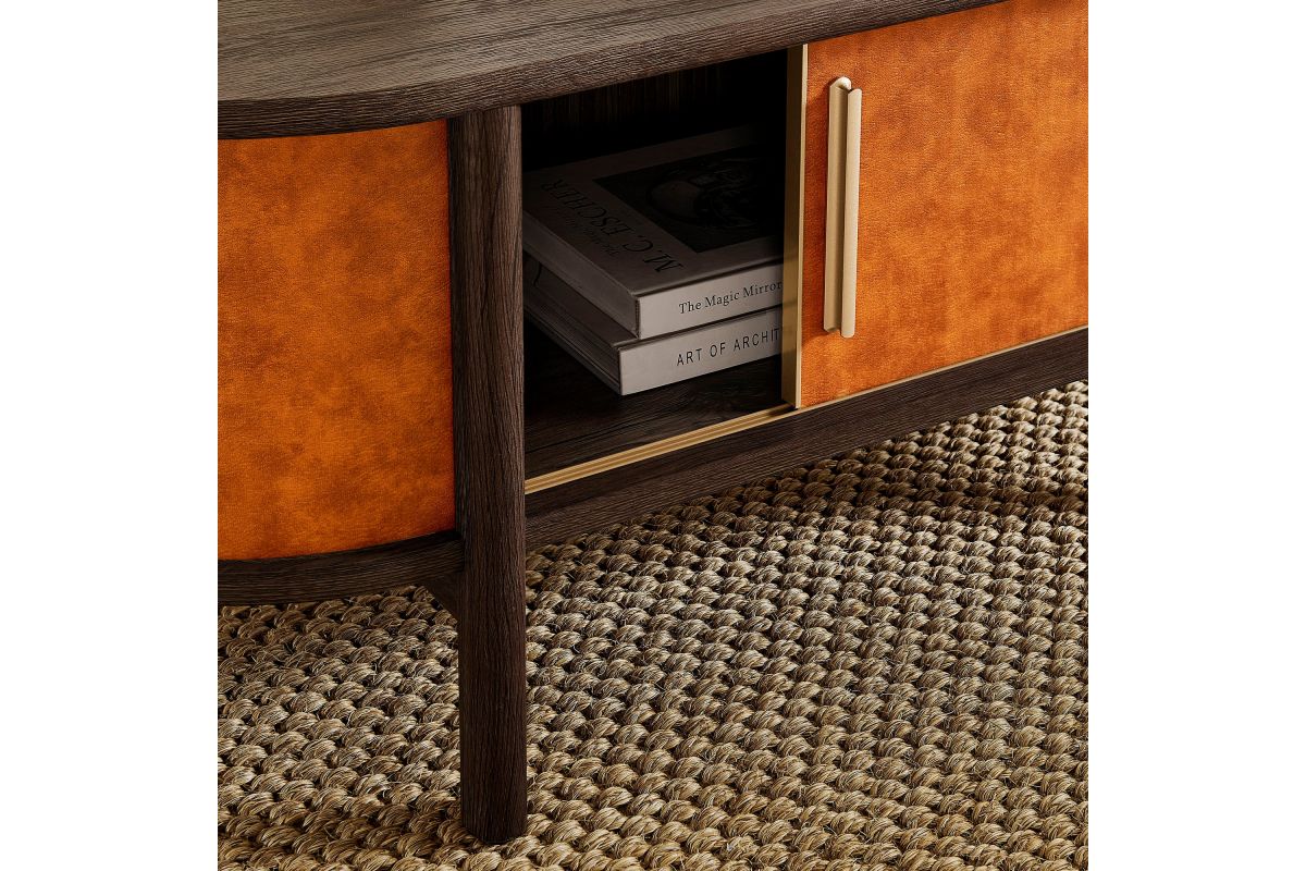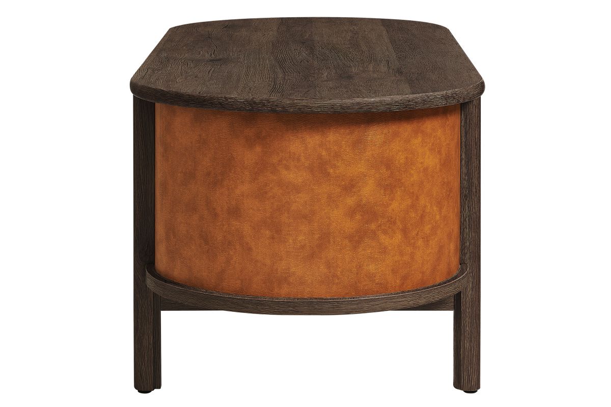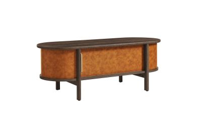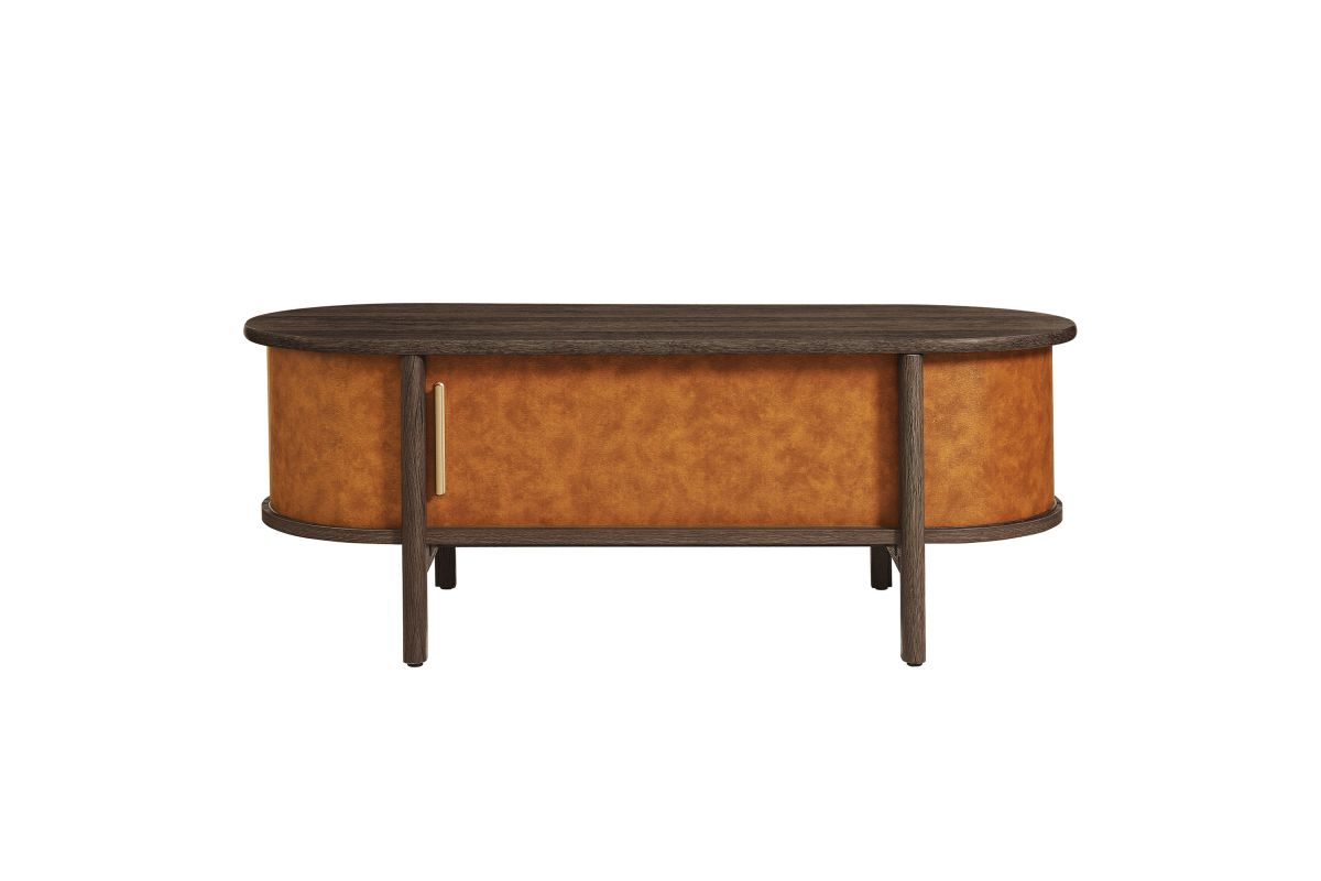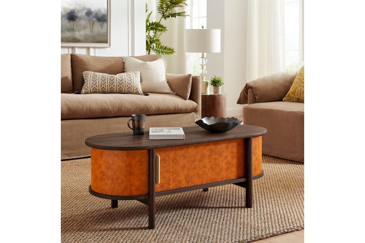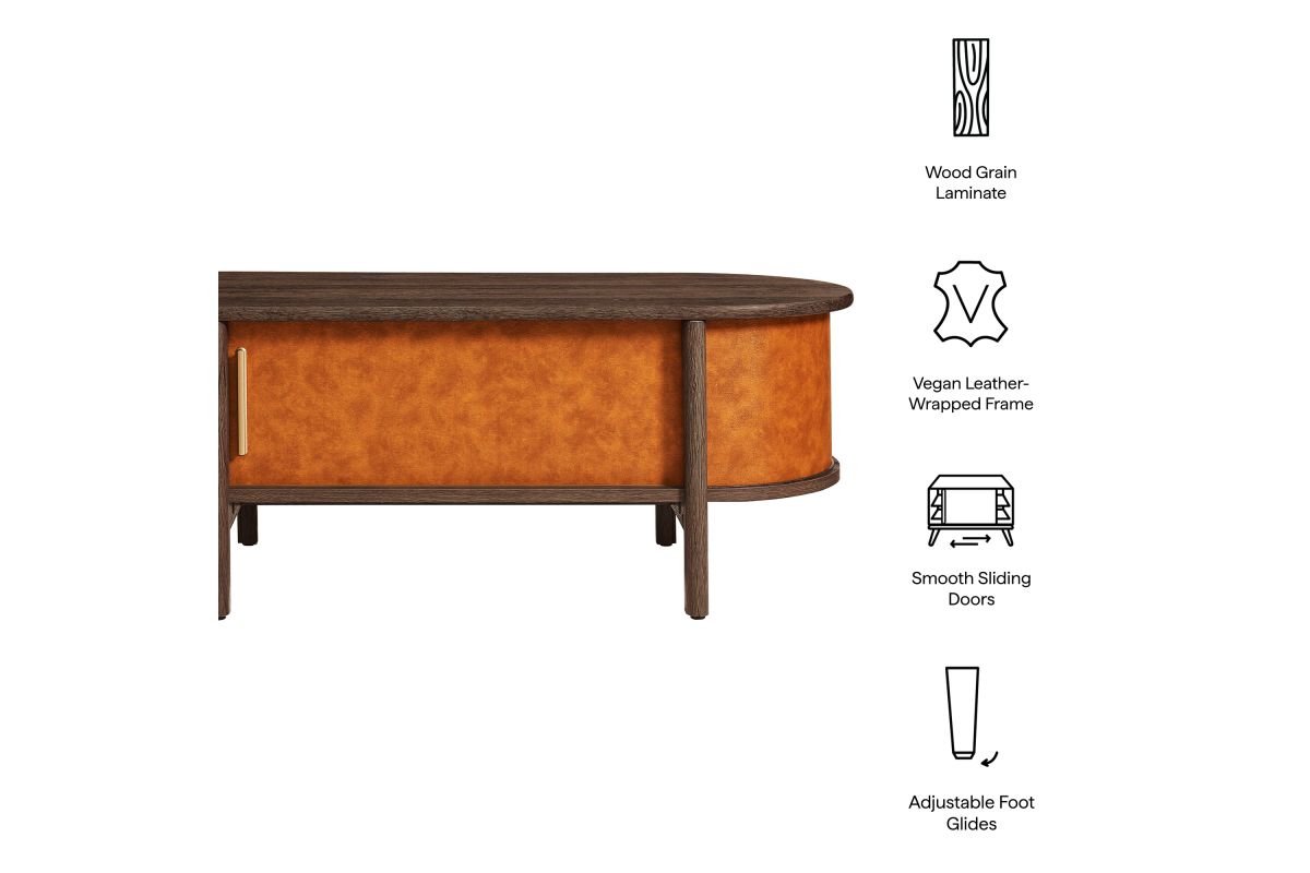 Bring vintage character and thoughtful design into your space with the Coralie Curved Coffee Table. Wrapped in vegan leather with wood grain laminate, this 45" modern center table has a warm, lived-in look that adds depth to any room. The curved profile softens its edges, while the oval shape feels both classic and fresh. On either side, two sliding doors—each accented with a gold-tone handle—opening fully from one end to the other on each side to reveal generous storage space for books, blankets, or anything that should stay close at hand but tucked away. Designed to anchor the room, the Coralie Unique Coffee Table offers a mix of storage, surface space, and vintage charm all in one. Equipped with adjustable non-marking foot glides. Weight Capacity: 165 lbs.