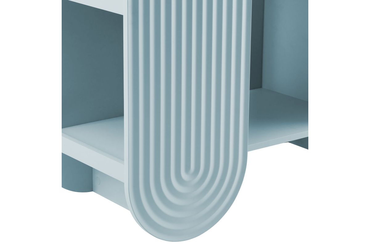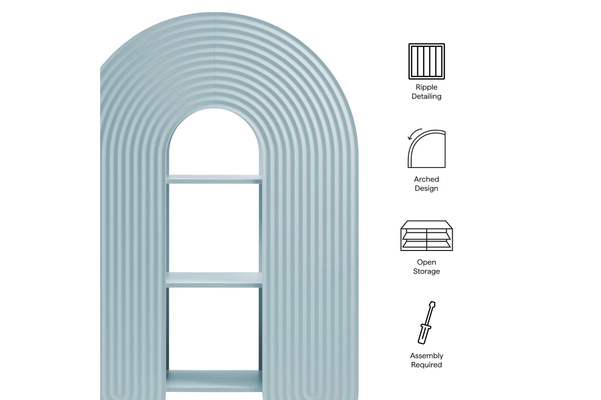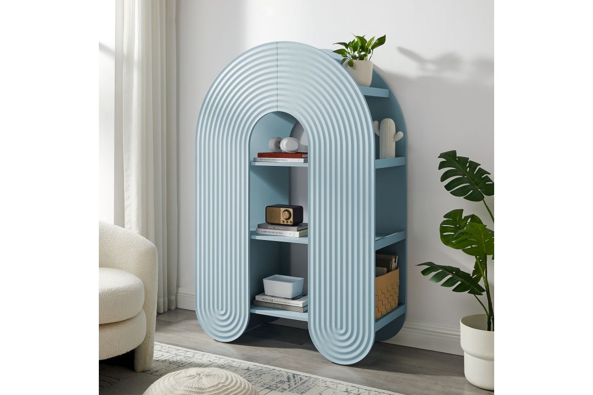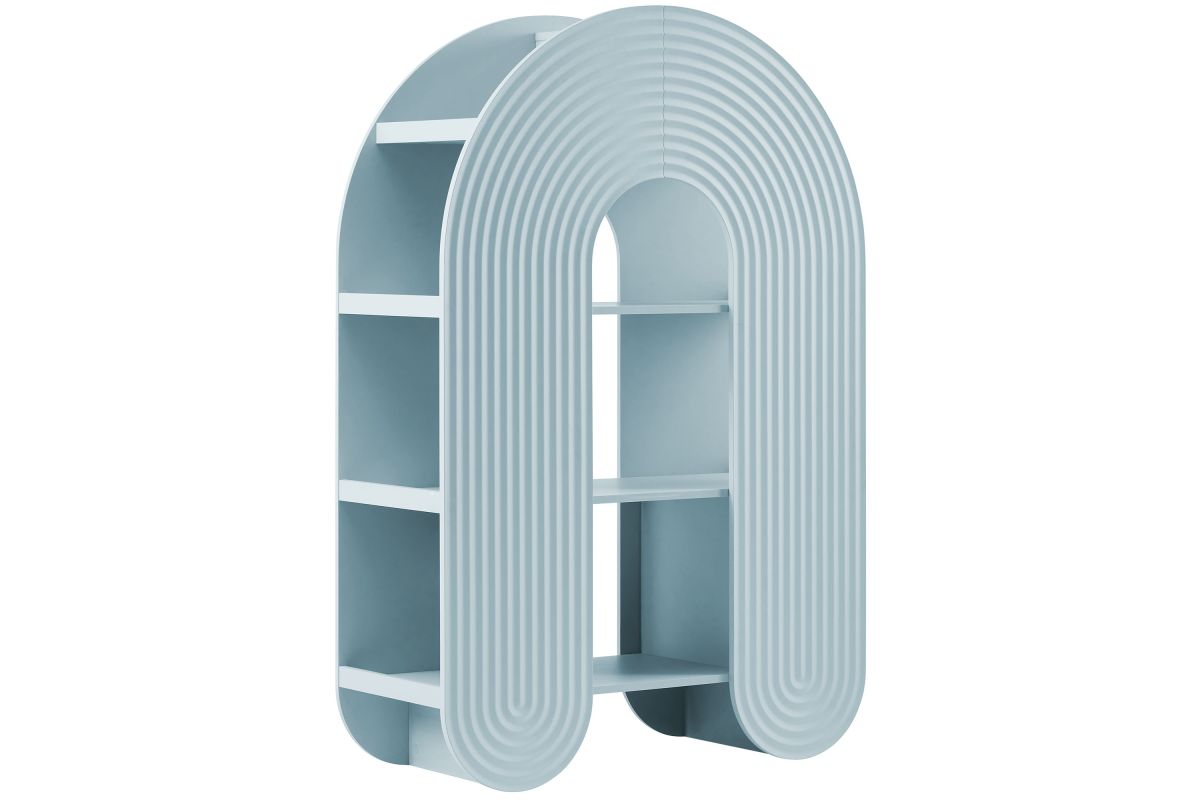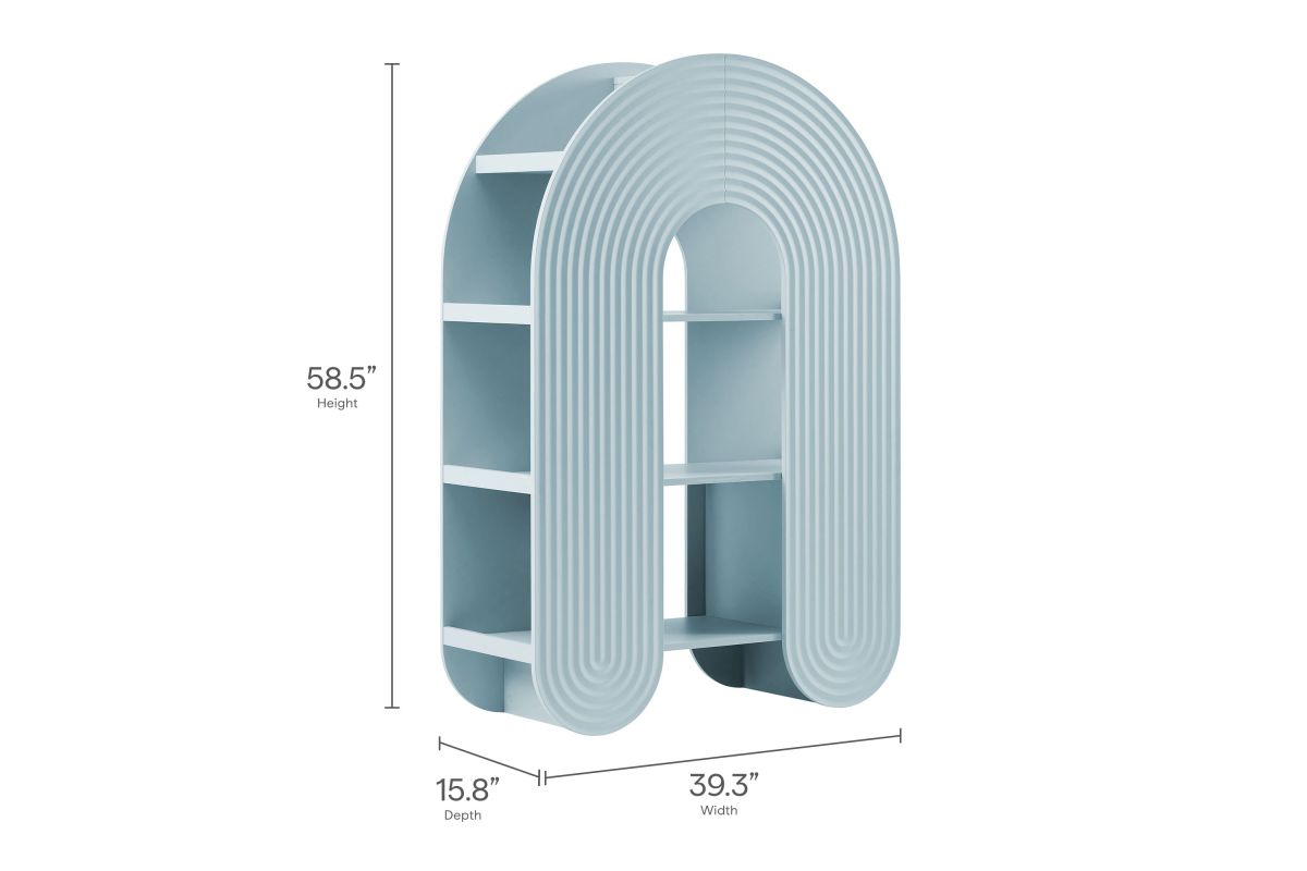 Let imagination take shape with the Daydream Bookcase, a sculptural display piece that blends whimsy, utility, and modern charm. At 58 inches tall, this arched ripple bookshelf offers a refreshing twist on traditional bookcases with its curved, oversized silhouette and dimensional detailing. More than just a storage cabinet, Daydream doubles as a playful focal point in a creative nook or cozy reading corner. With open shelving on both sides and through the center arch, this display case provides ample room for books, toys, decorative objects, or art supplies. Its rounded frame and ripple-textured front evoke a sense of motion and creativity. Designed with versatility in mind, this unique bookshelf complements both minimalist and maximalist interiors. Non-marking nylon floor glides protect your surfaces while keeping the arched bookcase stable. Whether placed in a playful family space or fun lounge area, Daydream transforms everyday storage into something magical. Assembly required.