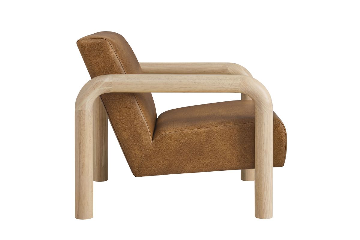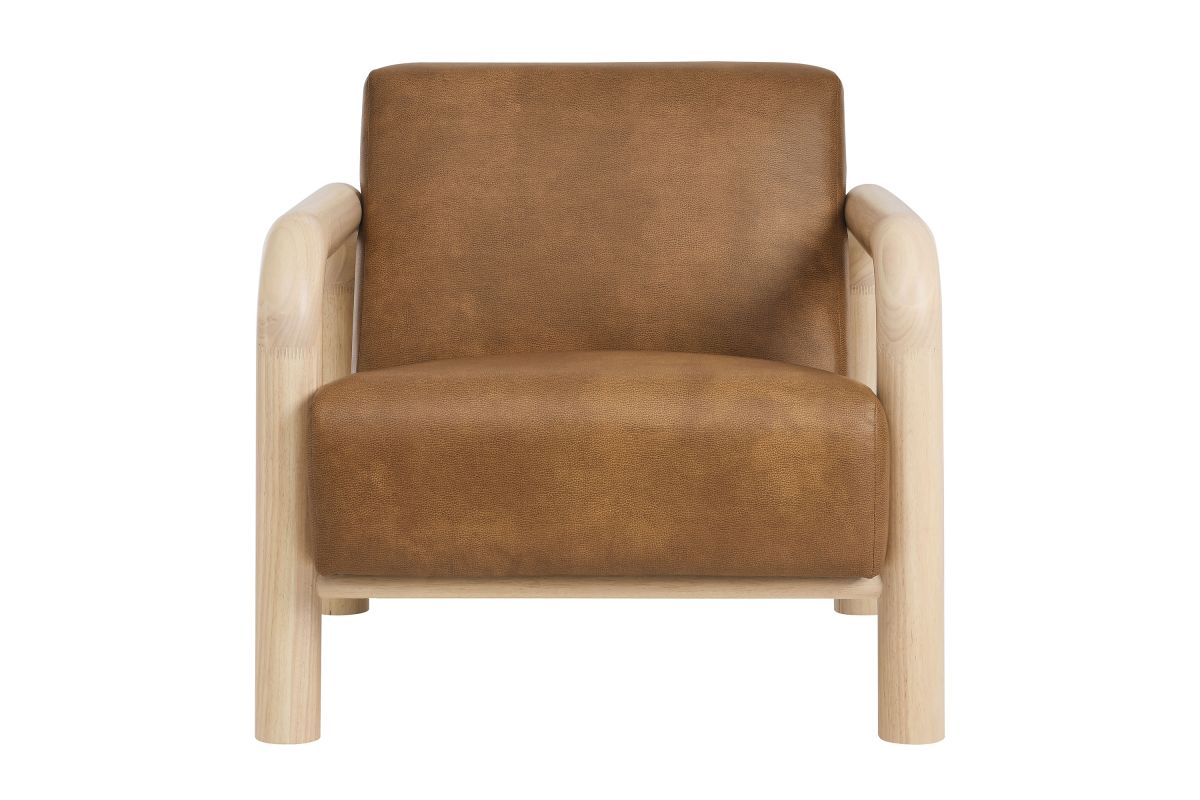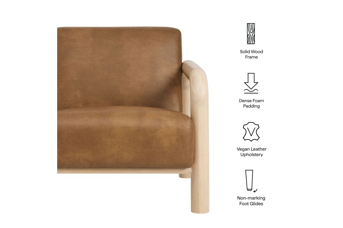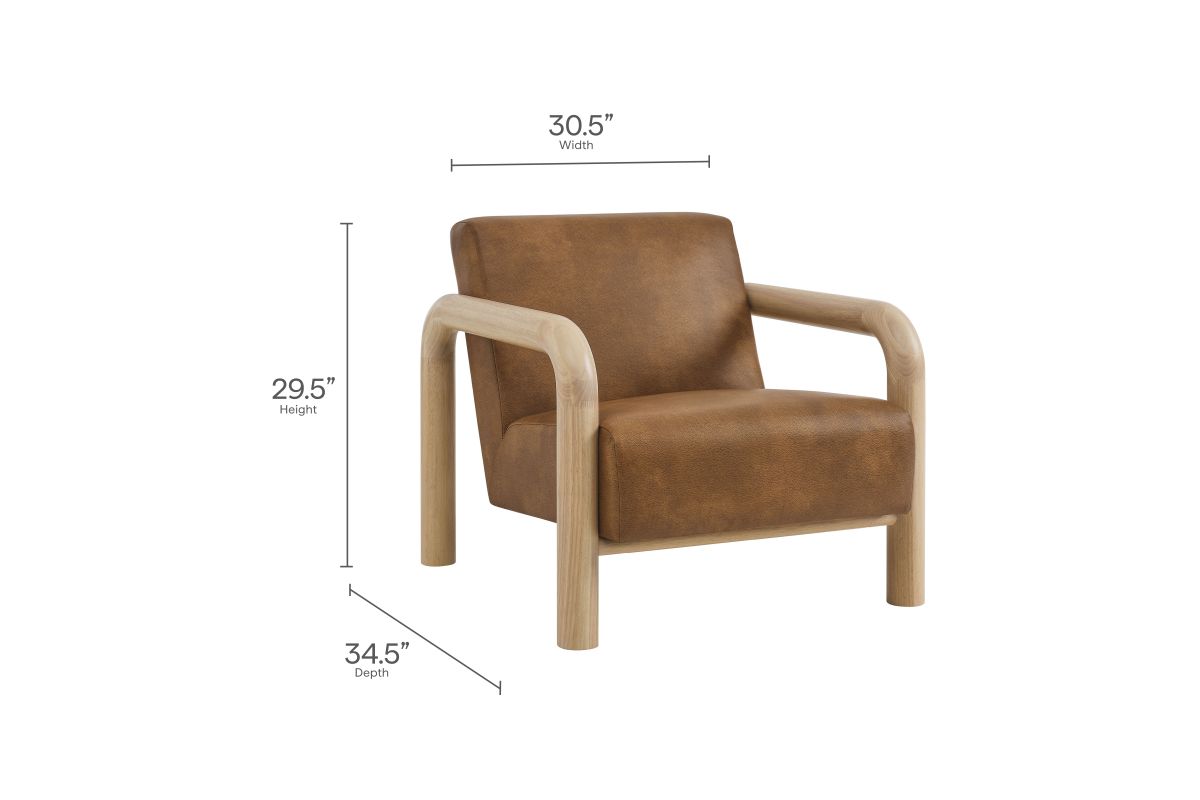 The Sereno Accent Chair brings sculptural elegance and elevated texture to any modern space. Wrapped in premium vegan leather with a rich pebbled texture, this lounge chair offers the look and feel of genuine leather. Its standout feature is the pair of oversized, rounded armrests crafted from solid rubberwood—bold in silhouette, smooth to the touch, and rich in natural character. With a generously padded seat and supportive backrest filled with dense foam, Sereno offers plush comfort in a compact footprint. Perfect for reading corners, bedroom nooks, or cozy lounge setups, this faux leather accent chair combines modern style with everyday comfort. Non-marking foot glides protect floors, and this living room side chair arrives fully assembled. Weight Capacity: 300 lbs.