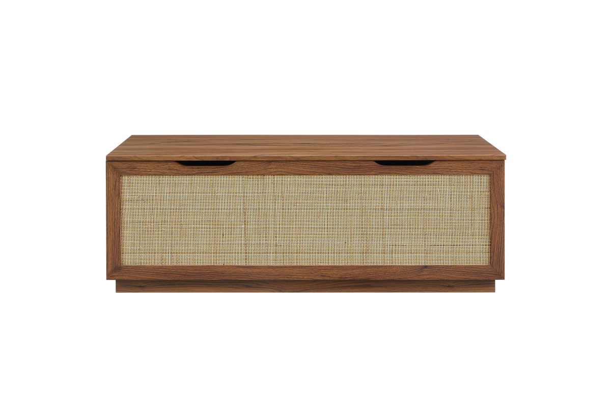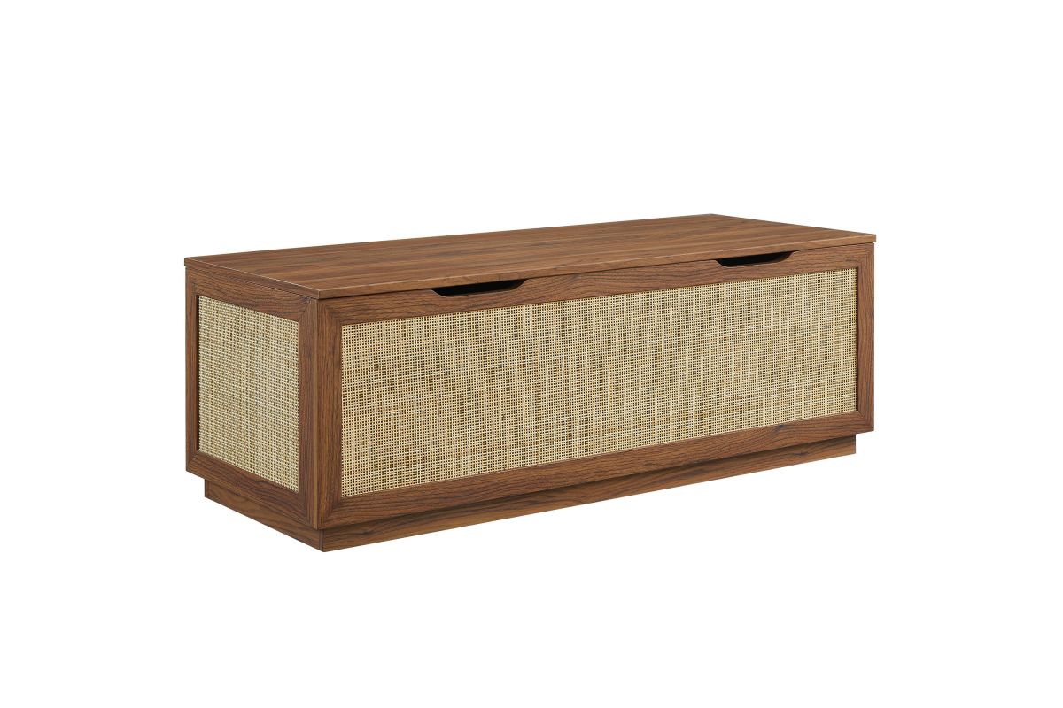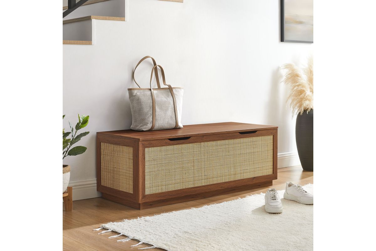 The Soma Entryway Storage Bench features clean lines, natural texture, and everyday function in one streamlined piece. Fully wrapped in faux rattan on all sides and framed in a warm laminated wood blend, this cane rattan entryway storage bench with flip-top hinge brings a light, organic feel to entryways, bedrooms, or under-window spaces. The hinged top lifts easily with two cut-out handles, revealing a deep, divided interior for shoes, blankets, or everyday essentials. Soft-close hinges and a safety warning label offer added guidance in family homes. With a flat base and no exposed legs, this storage bench for entryway sits low and solid, offering a relaxed silhouette that works in both modern and transitional spaces. Weight Capacity: 209 lbs.