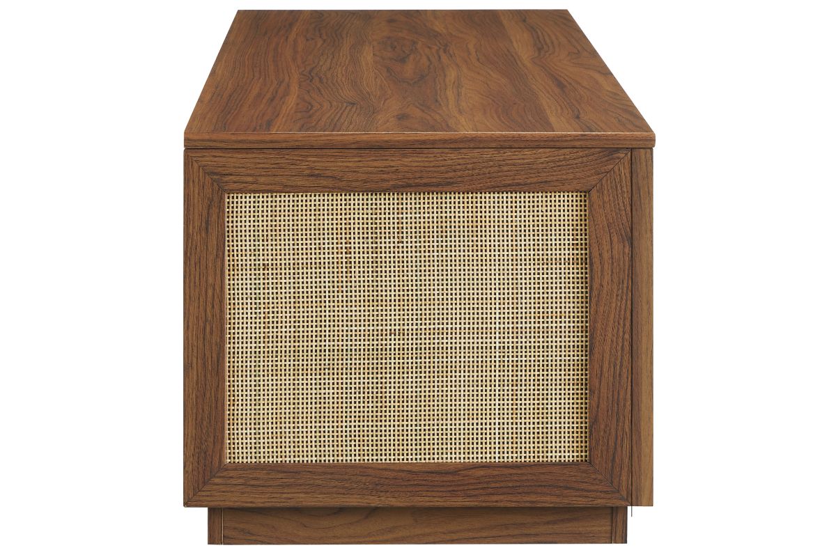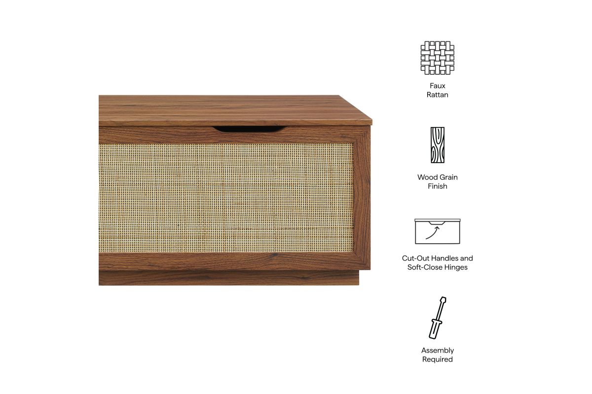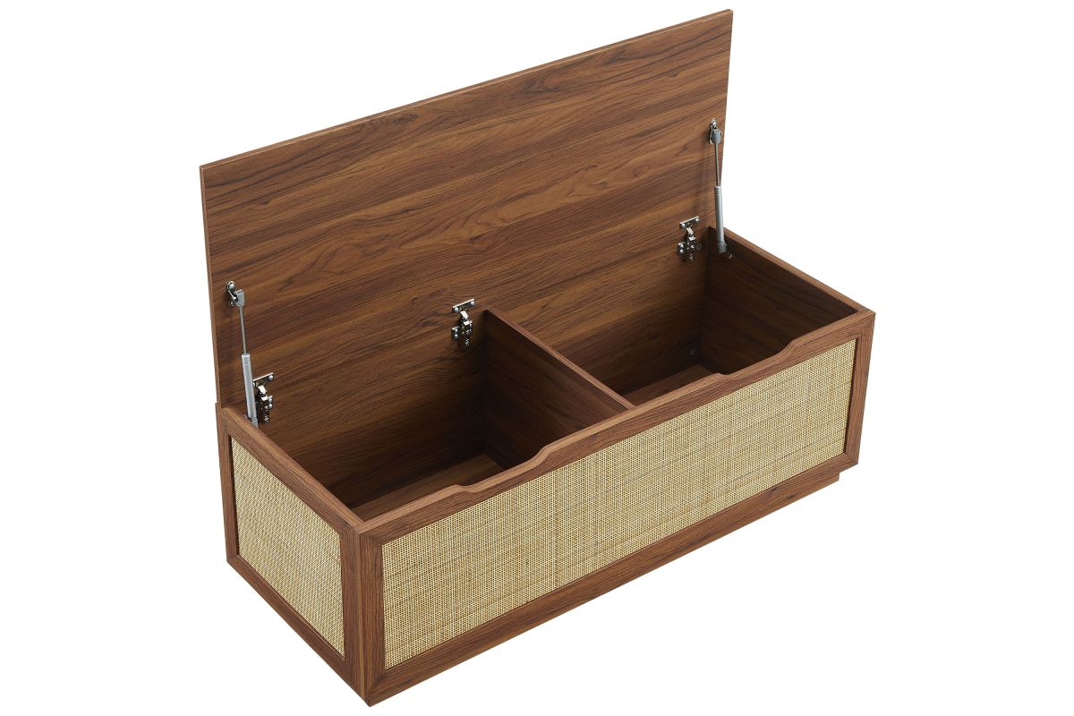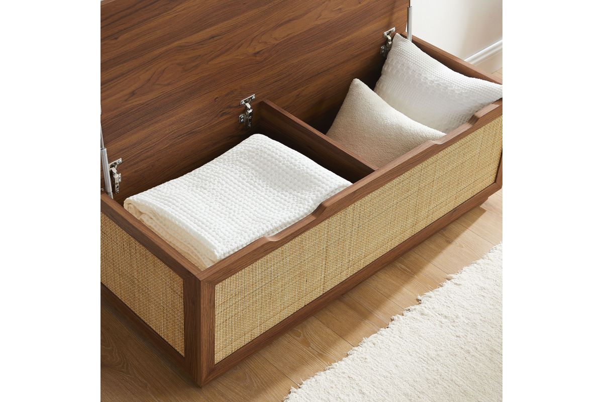 The Soma Entryway Storage Bench features clean lines, natural texture, and everyday function in one streamlined piece. Fully wrapped in faux rattan on all sides and framed in a warm laminated wood blend, this cane rattan entryway storage bench with flip-top hinge brings a light, organic feel to entryways, bedrooms, or under-window spaces. The hinged top lifts easily with two cut-out handles, revealing a deep, divided interior for shoes, blankets, or everyday essentials. Soft-close hinges and a safety warning label offer added guidance in family homes. With a flat base and no exposed legs, this storage bench for entryway sits low and solid, offering a relaxed silhouette that works in both modern and transitional spaces. Weight Capacity: 209 lbs.