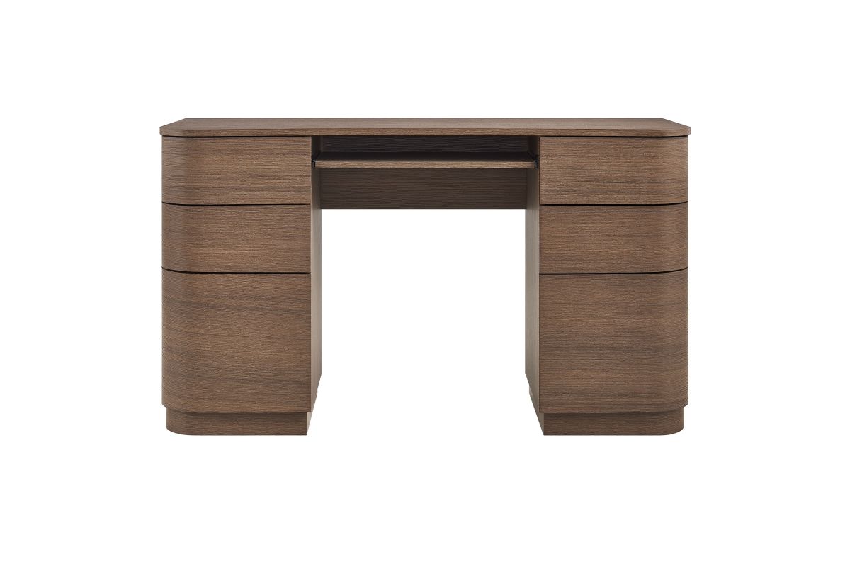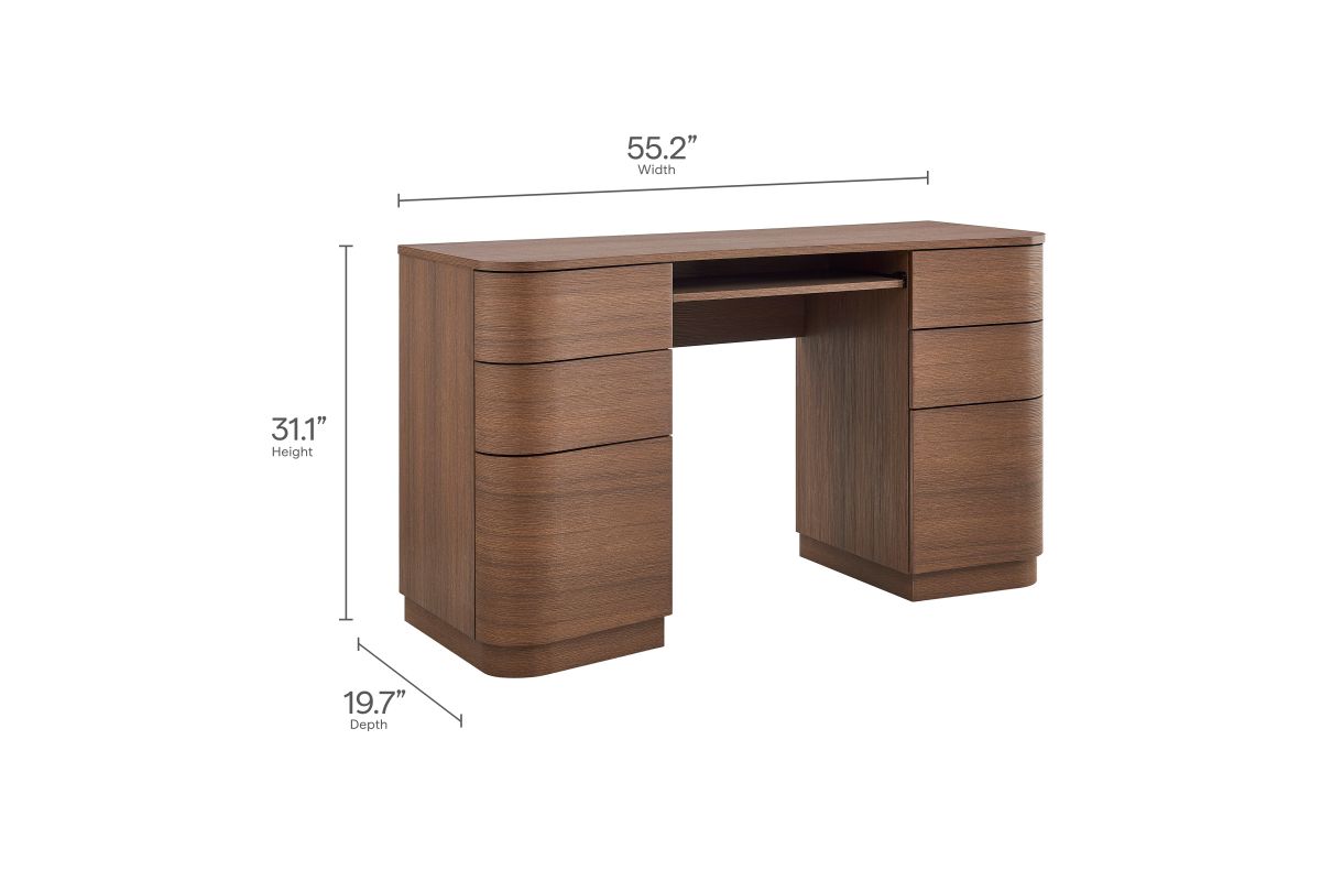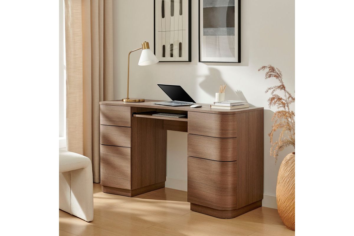 Clean curves meet practical storage in the Mirae Computer Desk, a compact home office essential with soft edges and sculptural appeal. Designed with a smooth wood grain laminate finish, this 55-inch writing desk features six drawers, including a filing drawer for documents and deeper side drawers for office supplies and more. A pull-out keyboard tray tucks neatly beneath the desktop, helping to keep your workspace clutter-free. With its rounded drawer fronts and mid-century inspiration, this modern office desk blends effortlessly into a study room or work-from-home setup. From writing and studying to makeup and home office work, this desk offers a stylish, space-saving solution for modern living. Assembly required.