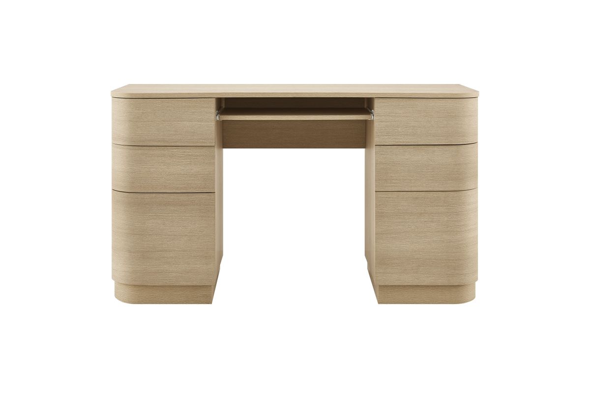 Clean curves meet practical storage in the Mirae Computer Desk, a compact home office essential with soft edges and sculptural appeal. Designed with a smooth wood grain laminate finish, this 55-inch writing desk features six drawers, including a filing drawer for documents and deeper side drawers for office supplies and more. A pull-out keyboard tray tucks neatly beneath the desktop, helping to keep your workspace clutter-free. With its rounded drawer fronts and mid-century inspiration, this modern office desk blends effortlessly into a study room or work-from-home setup. From writing and studying to makeup and home office work, this desk offers a stylish, space-saving solution for modern living. Assembly required.