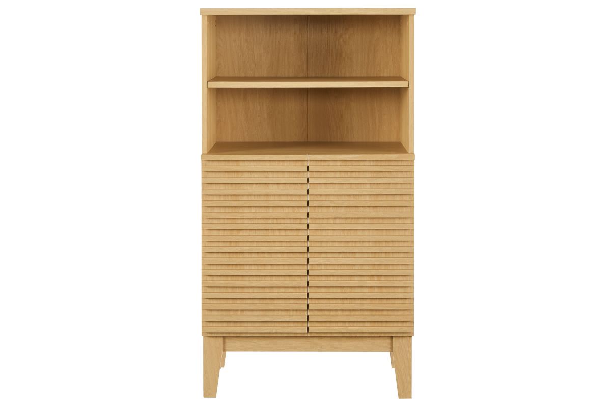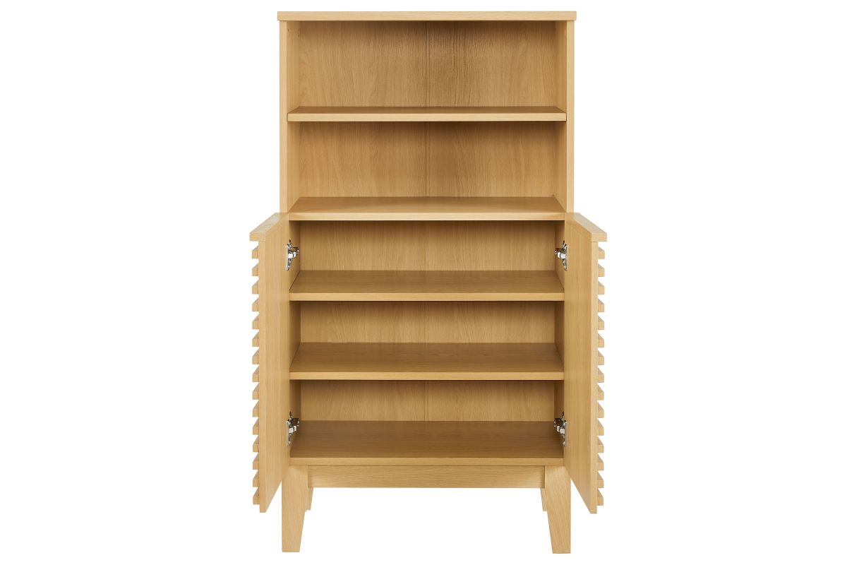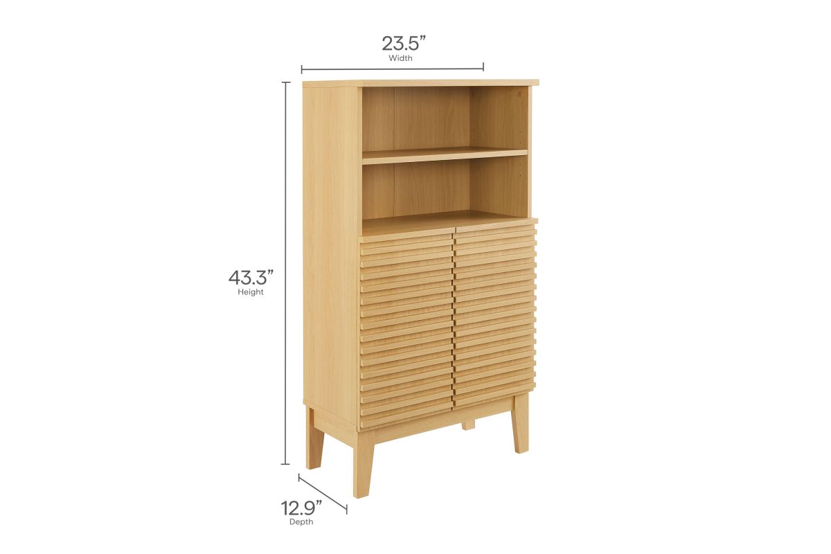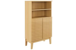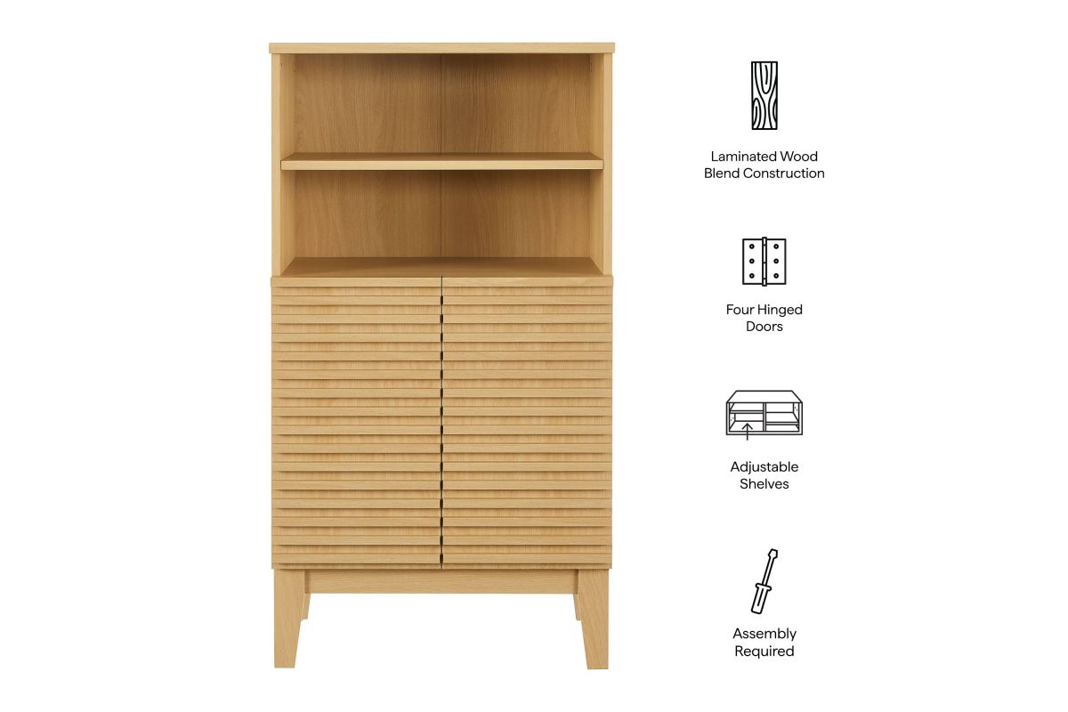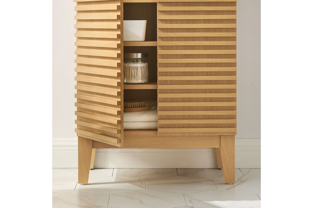 Bring warm texture and clean lines to your space with the Render Freestanding Bathroom Cabinet. This modern freestanding bathroom storage cabinet features grooved slatted doors, a natural wood-look finish, and open shelving that adds visual interest to minimalist or mid-century-inspired bathrooms. Four interior shelves (two adjustable) provide versatile storage for linens, towels, and toiletries, while the top open compartments are perfect for styling with candles, baskets, or everyday essentials. Soft-close hinges offer a quiet, smooth-close experience. Whether used as a linen cabinet in a main bath or a towel storage cabinet in a guest suite, this standing design offers generous vertical storage with timeless appeal.