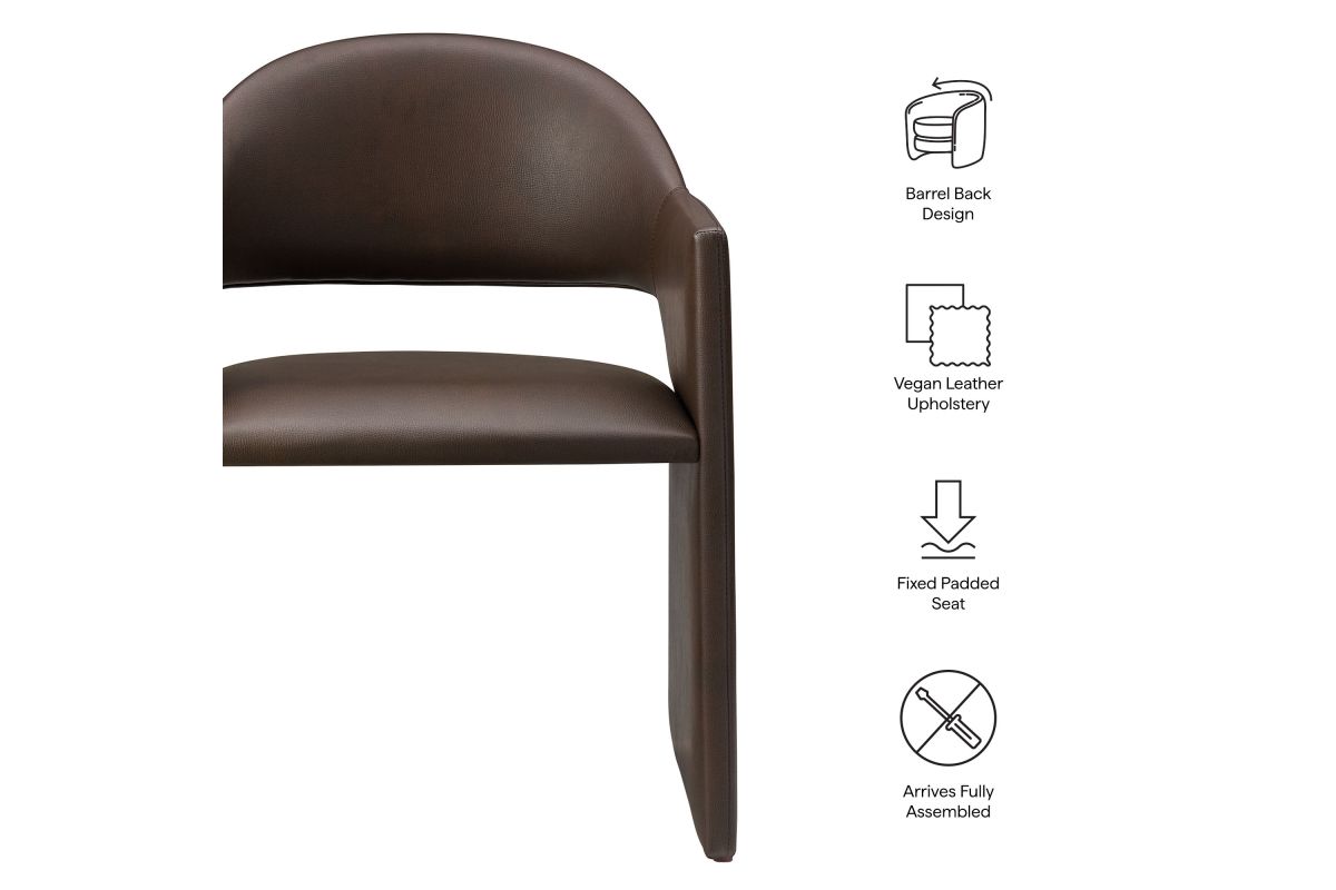 The Talia Vegan Leather Dining Chair is a stunning example of modern design, blending clean lines with luxurious comfort. Whether as a stylish living room accent chair, a statement piece in the dining area, or even a chic office accent chair, this barrel back dining chair offers both timeless style and versatility. Built on a sturdy bentwood frame, this dining chair with arms is fully upholstered in smooth, pebbled easy-care vegan leather for a premium look and feel. Its elegantly curved backrest flows seamlessly into wide, angular armrests that extend down to the floor, creating a sculptural look that's perfect for minimalist and contemporary spaces. The open-back design of this curved dining chair provides a light and airy feel, while the generously padded seat ensures lasting comfort. Completing the design, floor-protecting foot pins are included to prevent scratches, making it easy to move and enjoy without worry. This faux leather armchair arrives fully assembled, ready to elevate your space. Weight Capacity: 300 lbs.