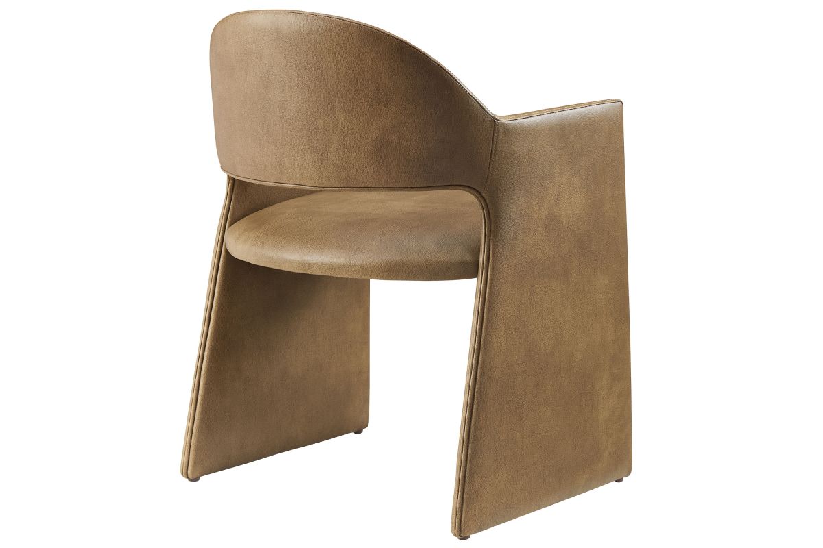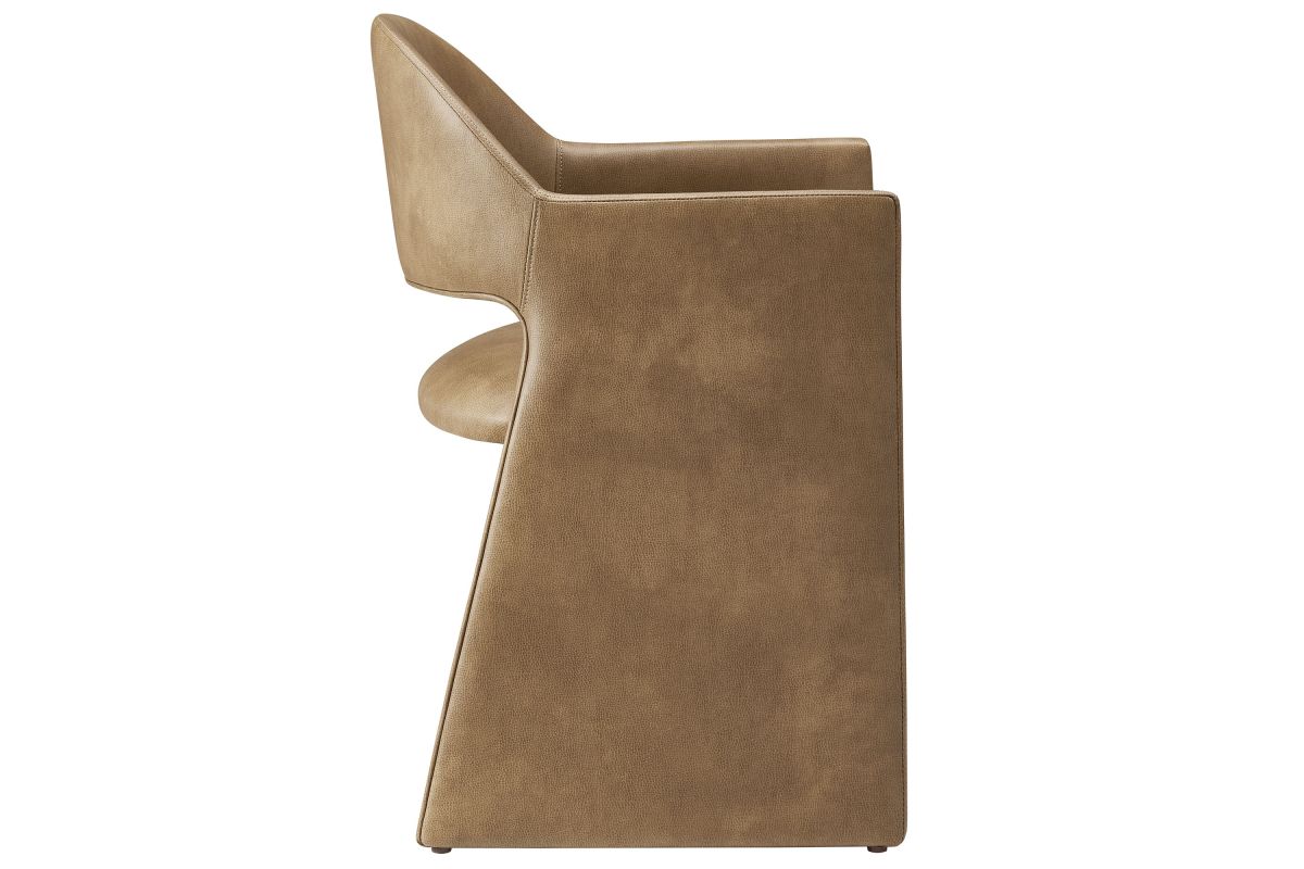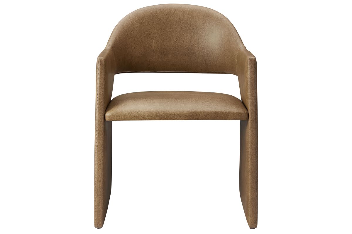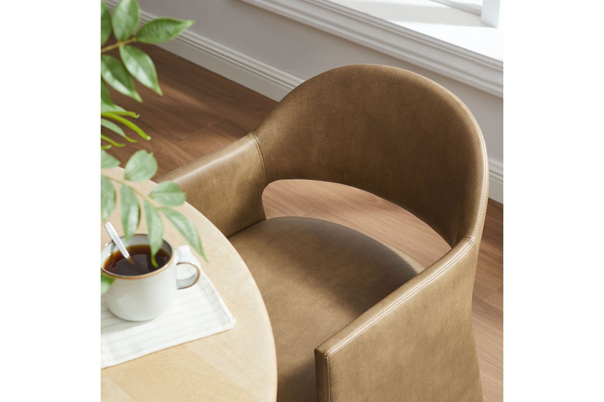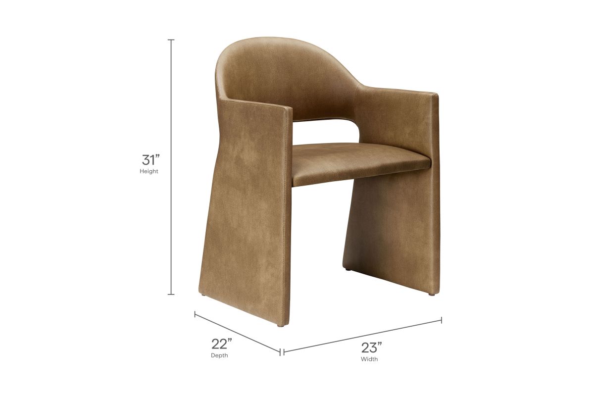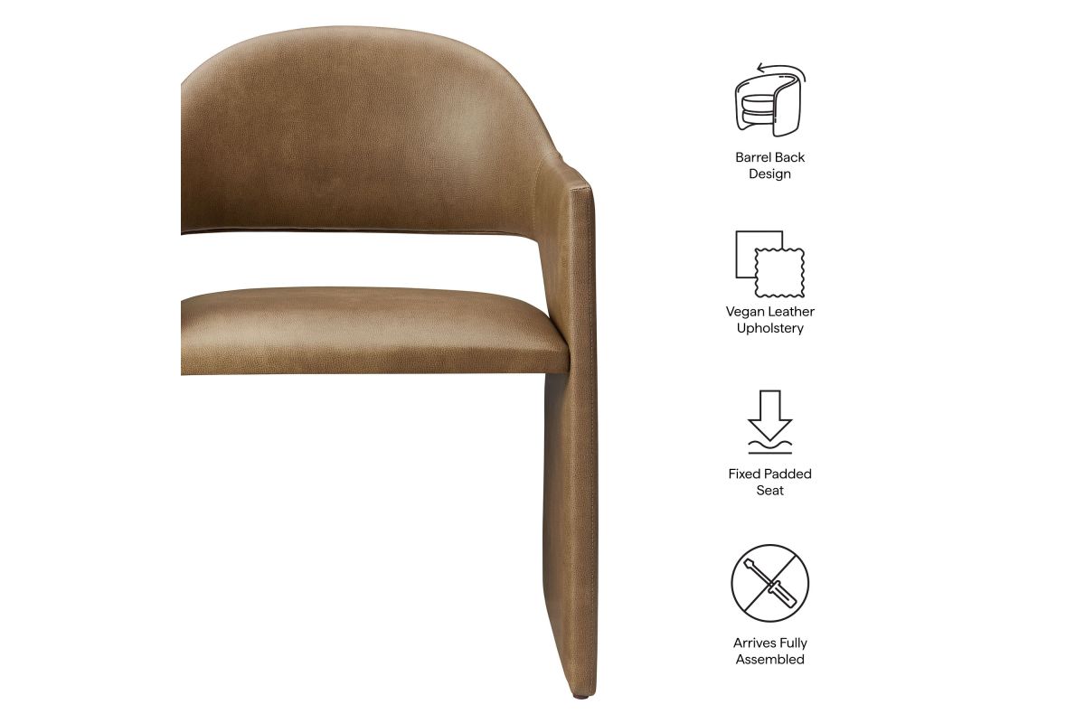 The Talia Vegan Leather Dining Chair is a stunning example of modern design, blending clean lines with luxurious comfort. Whether as a stylish living room accent chair, a statement piece in the dining area, or even a chic office accent chair, this barrel back dining chair offers both timeless style and versatility. Built on a sturdy bentwood frame, this dining chair with arms is fully upholstered in smooth, pebbled easy-care vegan leather for a premium look and feel. Its elegantly curved backrest flows seamlessly into wide, angular armrests that extend down to the floor, creating a sculptural look that's perfect for minimalist and contemporary spaces. The open-back design of this curved dining chair provides a light and airy feel, while the generously padded seat ensures lasting comfort. Completing the design, floor-protecting foot pins are included to prevent scratches, making it easy to move and enjoy without worry. This faux leather armchair arrives fully assembled, ready to elevate your space. Weight Capacity: 300 lbs.