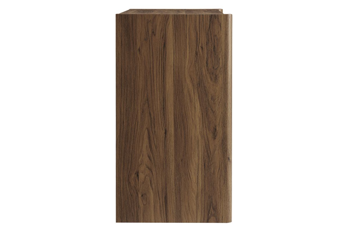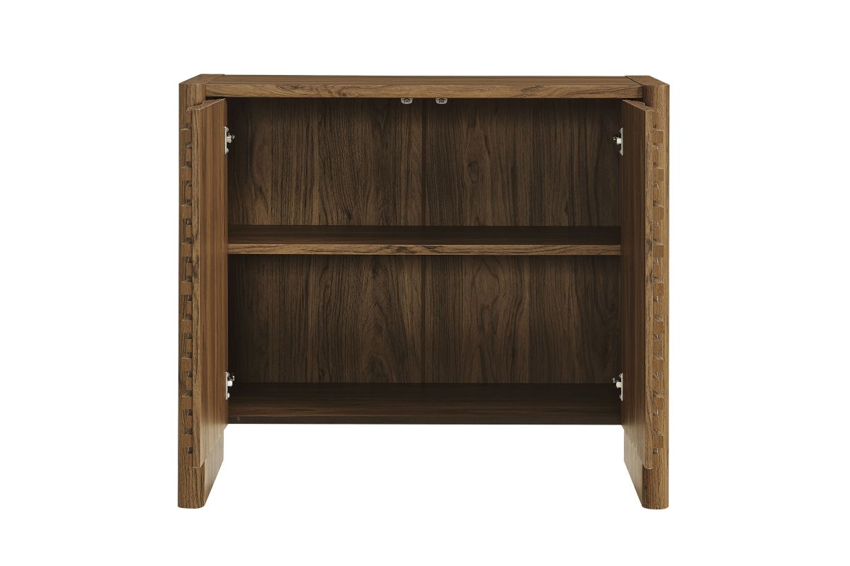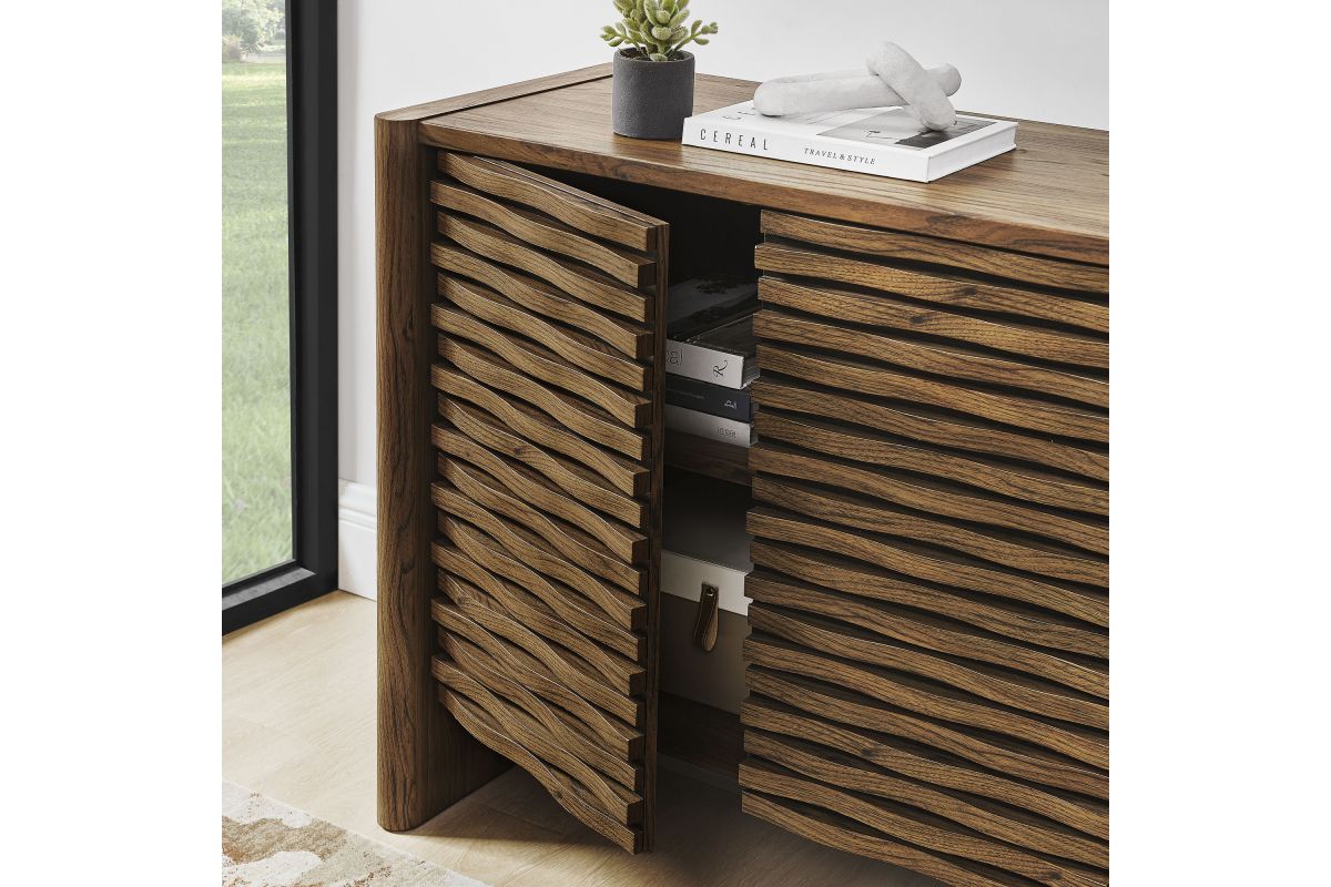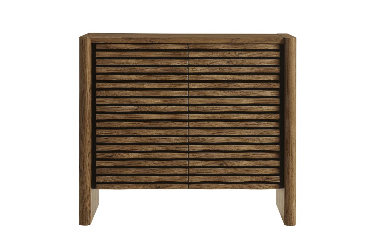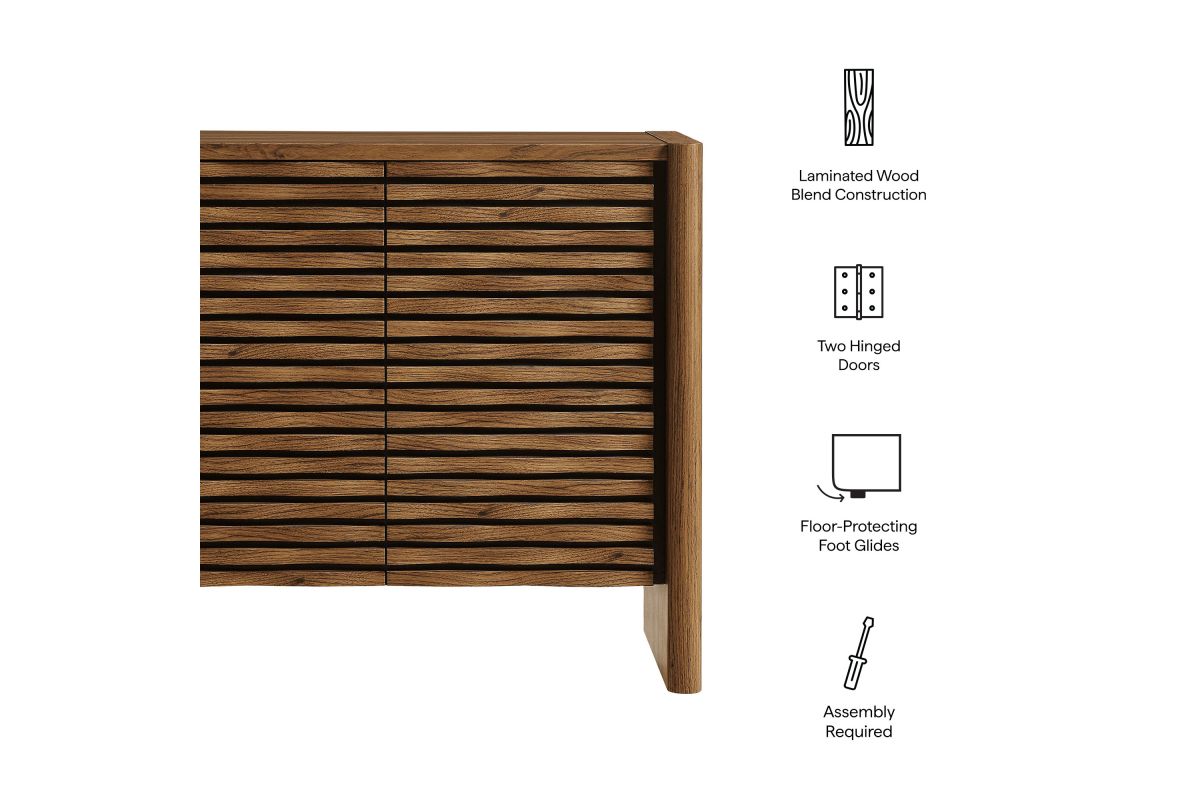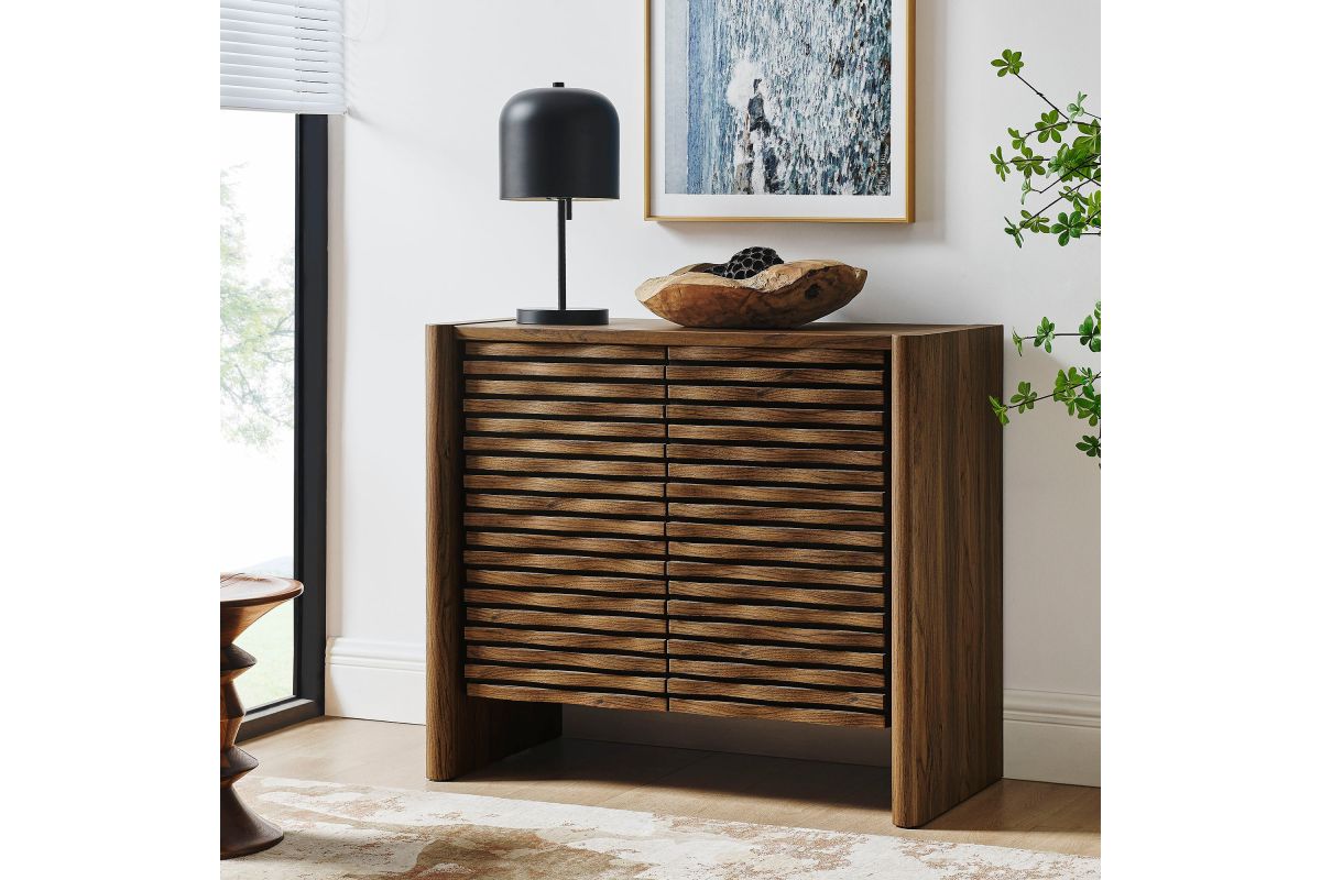 Simple in purpose, the Emric Wave Cabinet brings a soft, sculpted feel to functional storage. Made from a laminated wood blend with a smooth finish, this accent cabinet features slatted doors with a subtle wave design resting on a black backdrop that adds depth and movement. Two hinged doors open to reveal interior shelving, ideal for storing anything from linens to serveware. With thick side panels that extend to the floor, this buffet cabinet rests on a solid base that feels grounded from every angle. Whether styled as a small sideboard, or storage chest in a living room or hallway, this modern floor cabinet brings character and convenience to any space. Includes foot glides for floor protection. Assembly required.